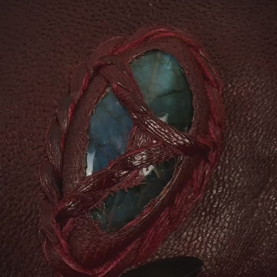 This leather jacket from Japanese brand 14th Addiction is a revival of the 2009 model and comes in a bordeaux tone. It features raw-edged hems and detailed elements including a Mexican coin, feathers, lizard skin, and a labradorite stone. The hem can be detached or styled differently through a zipper.