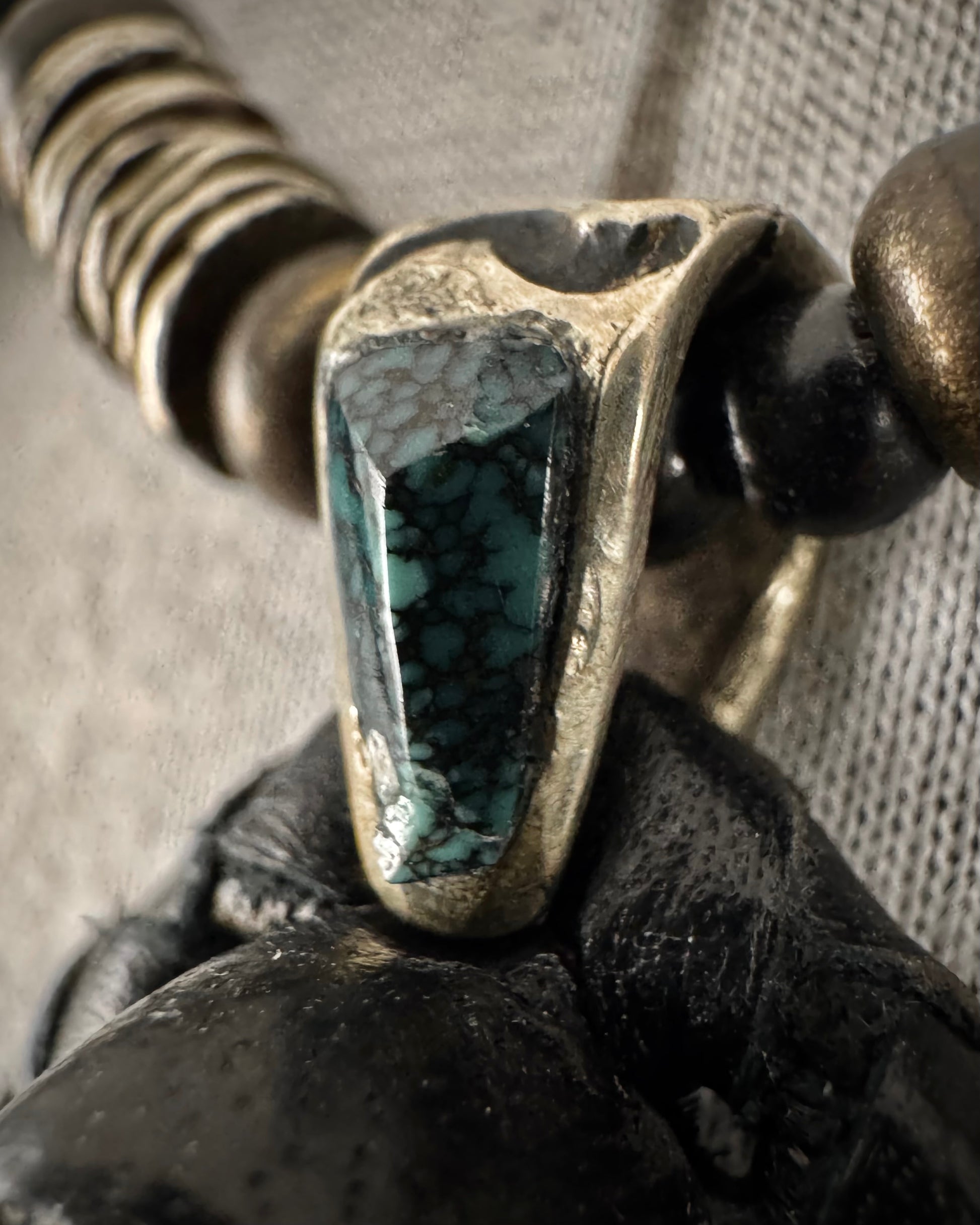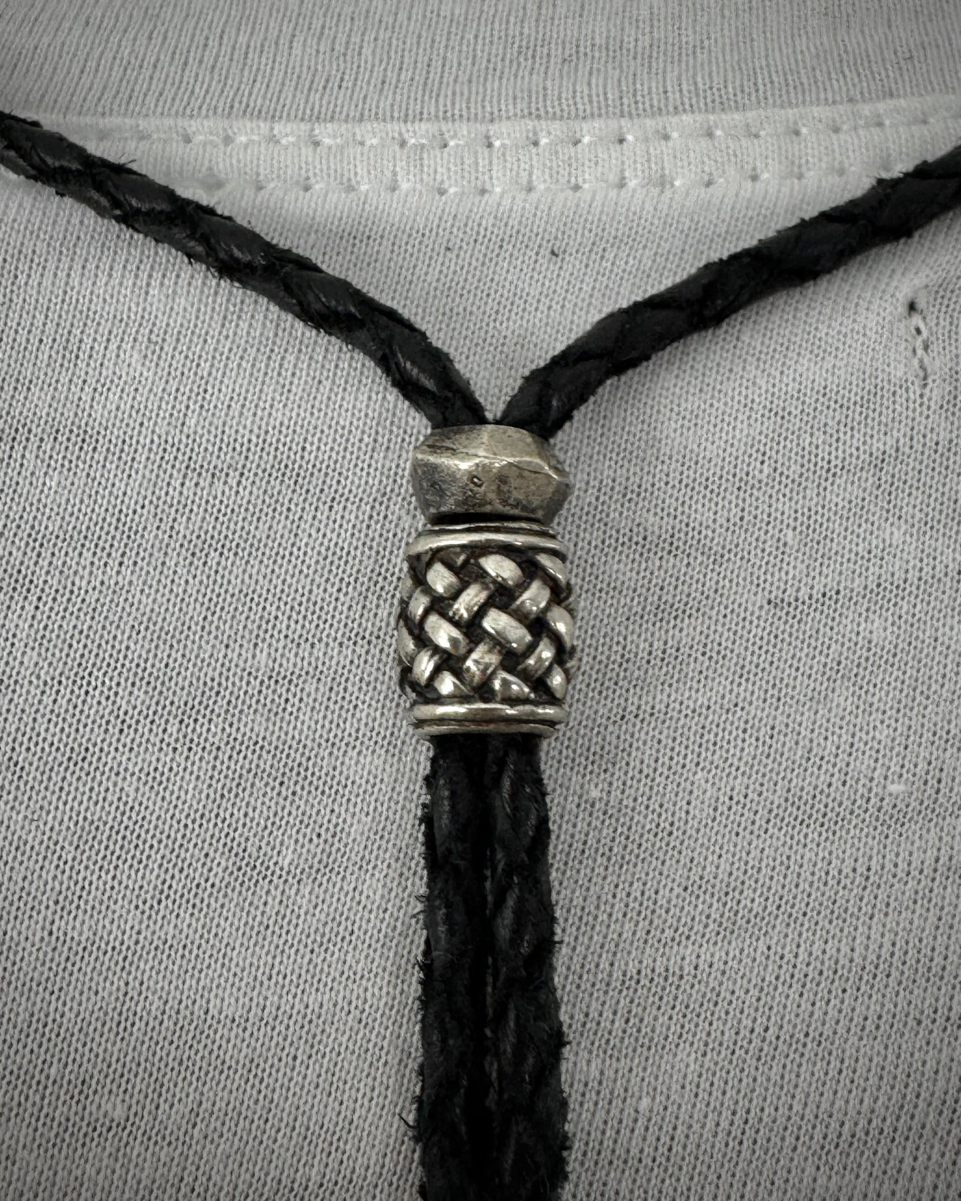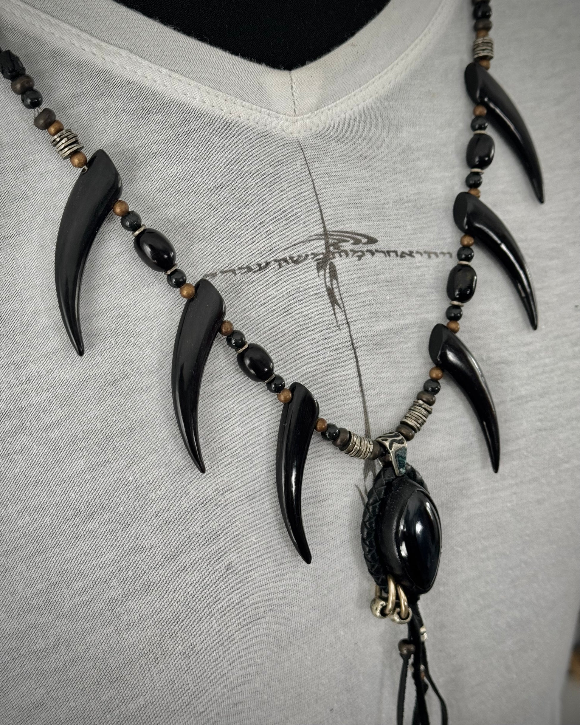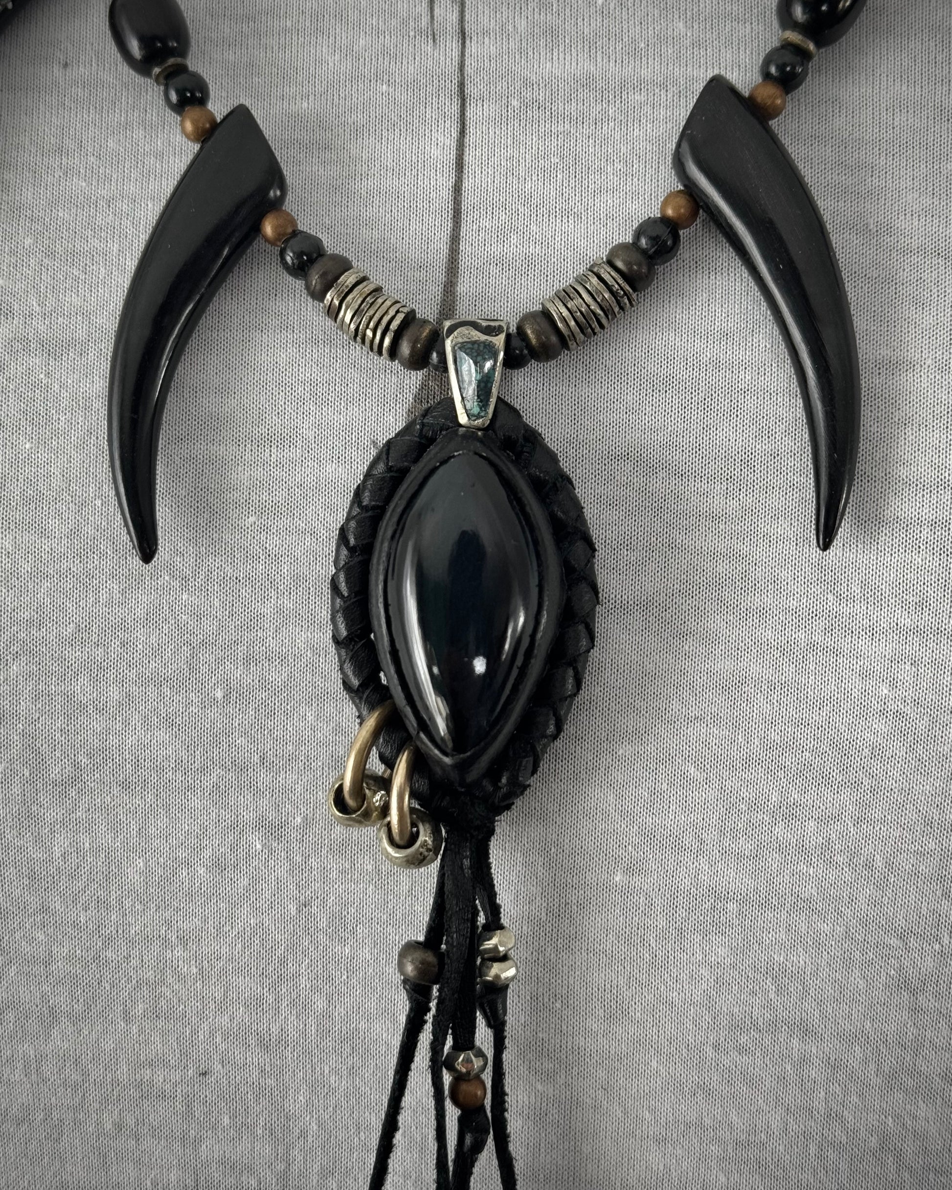 This necklace from Japanese brand 14th Addiction is the “Real de Catorce: Code 023.24” model. It features a stone wrapped in braided leather, complemented by fangs, piercings and beads.