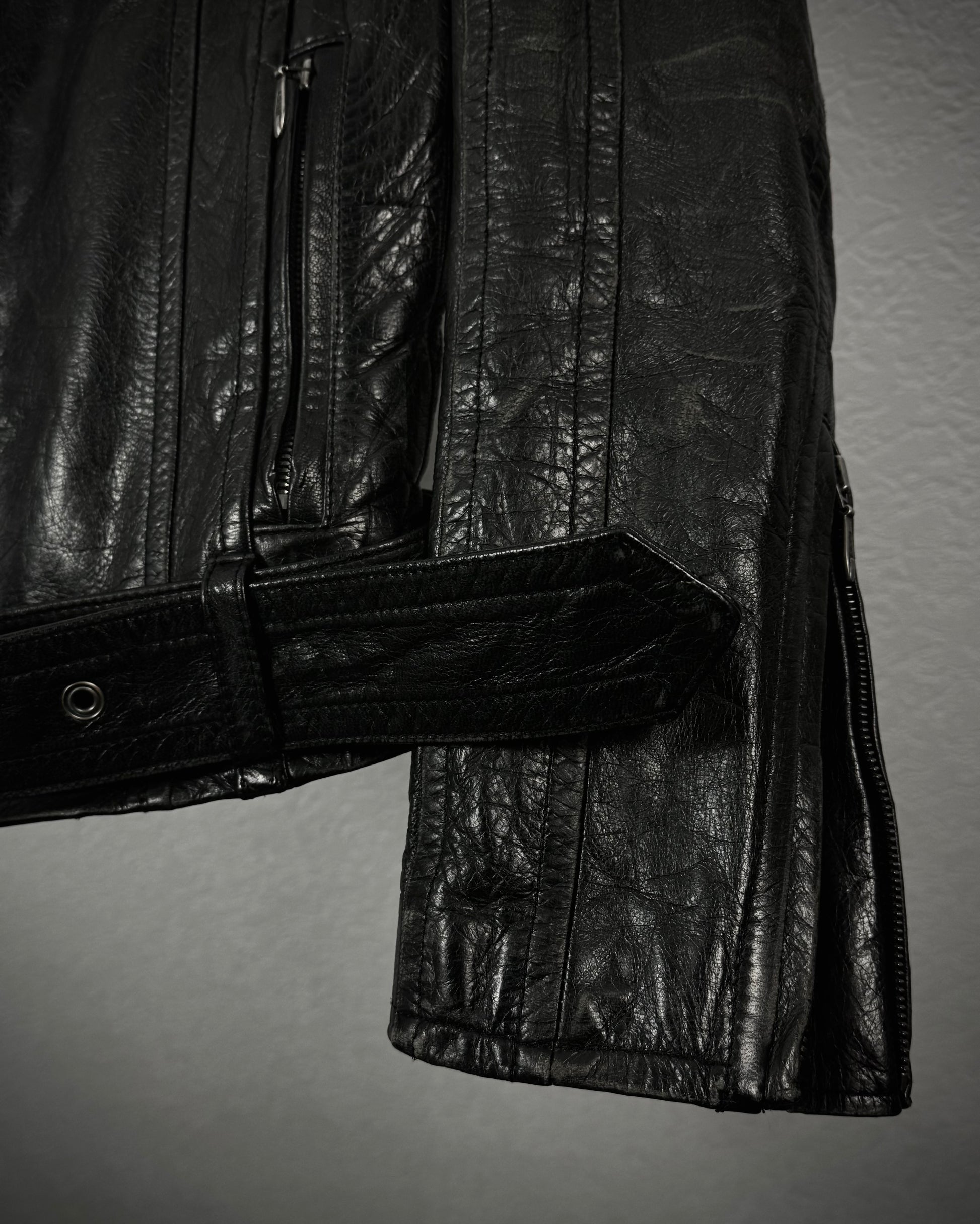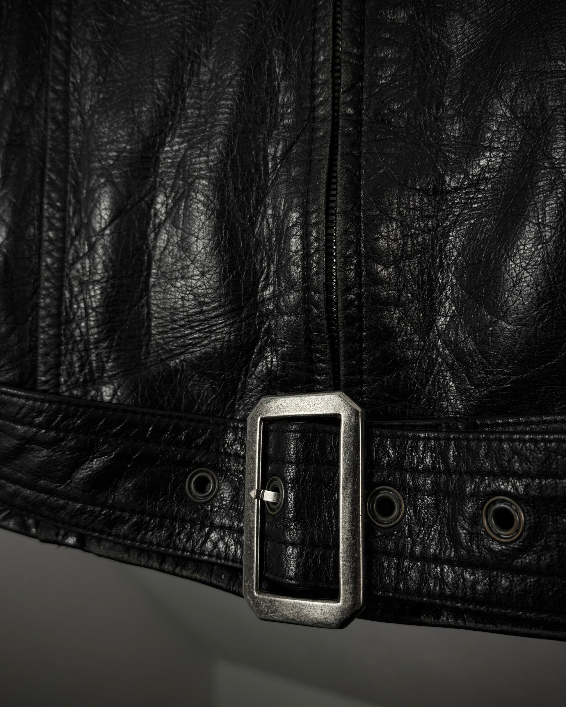 This leather jacket from Japanese brand 5351 Pour Les Hommes is made from textured cowhide leather and features a detachable rabbit fur collar. It includes a belted waist, with the belt being removable.