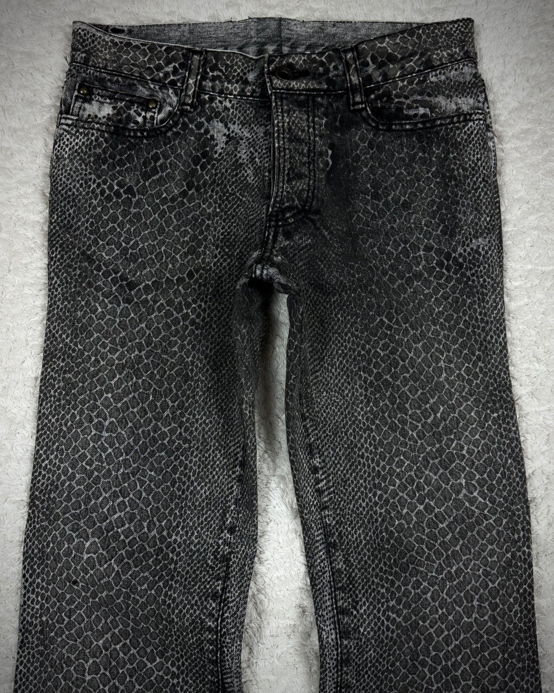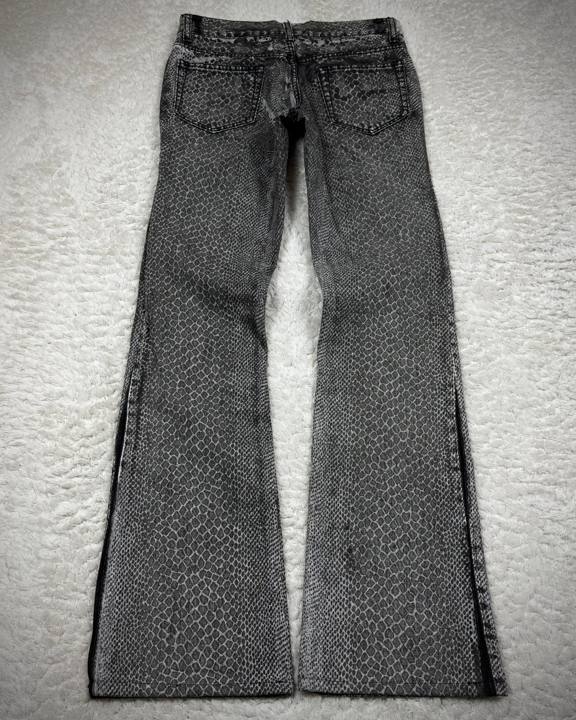 These flared jeans from Japanese brand 5351 Pour Les Hommes feature a python pattern coating. The coating gives the denim a sturdy, heavy structure, and the silhouette is clean and well-defined.