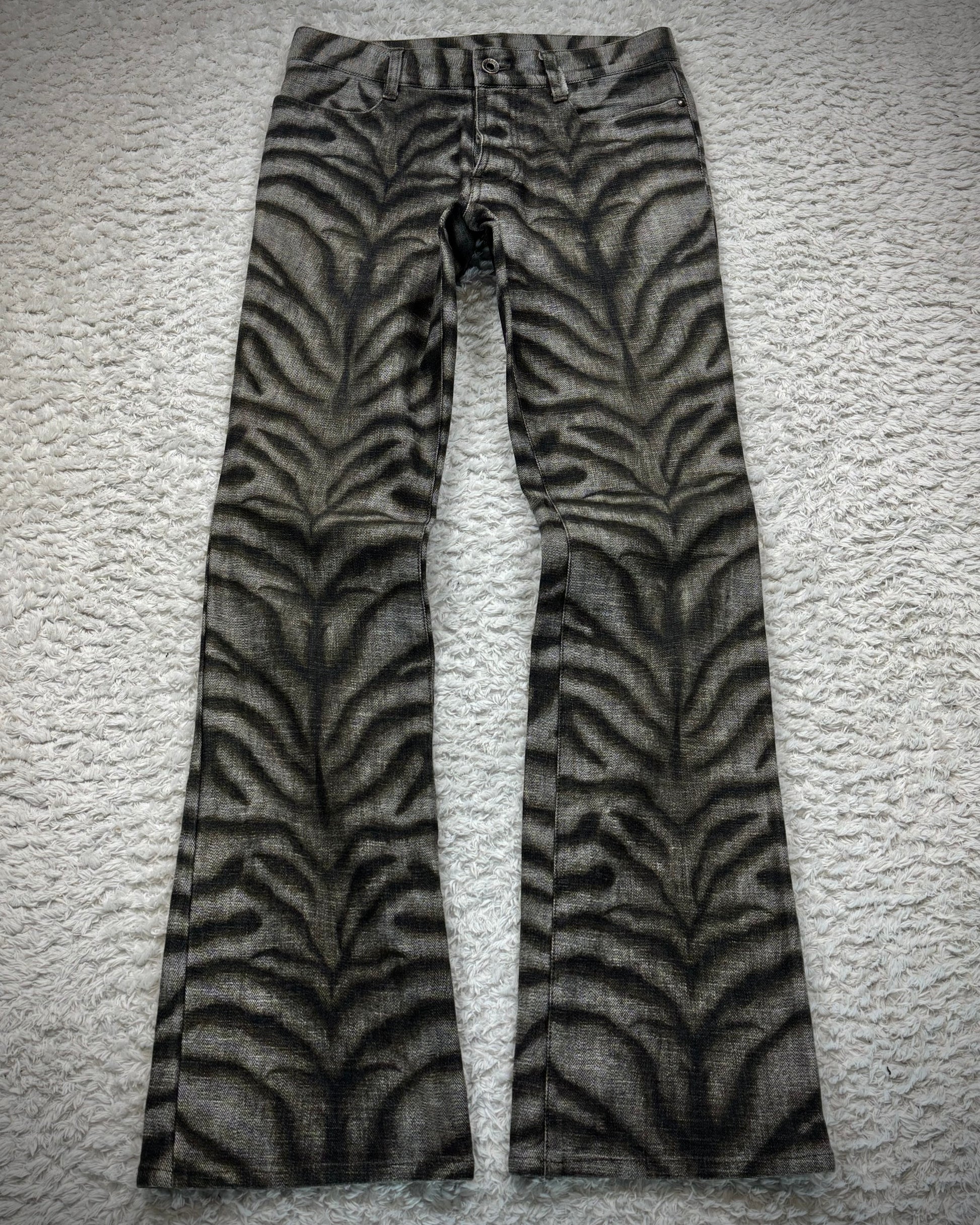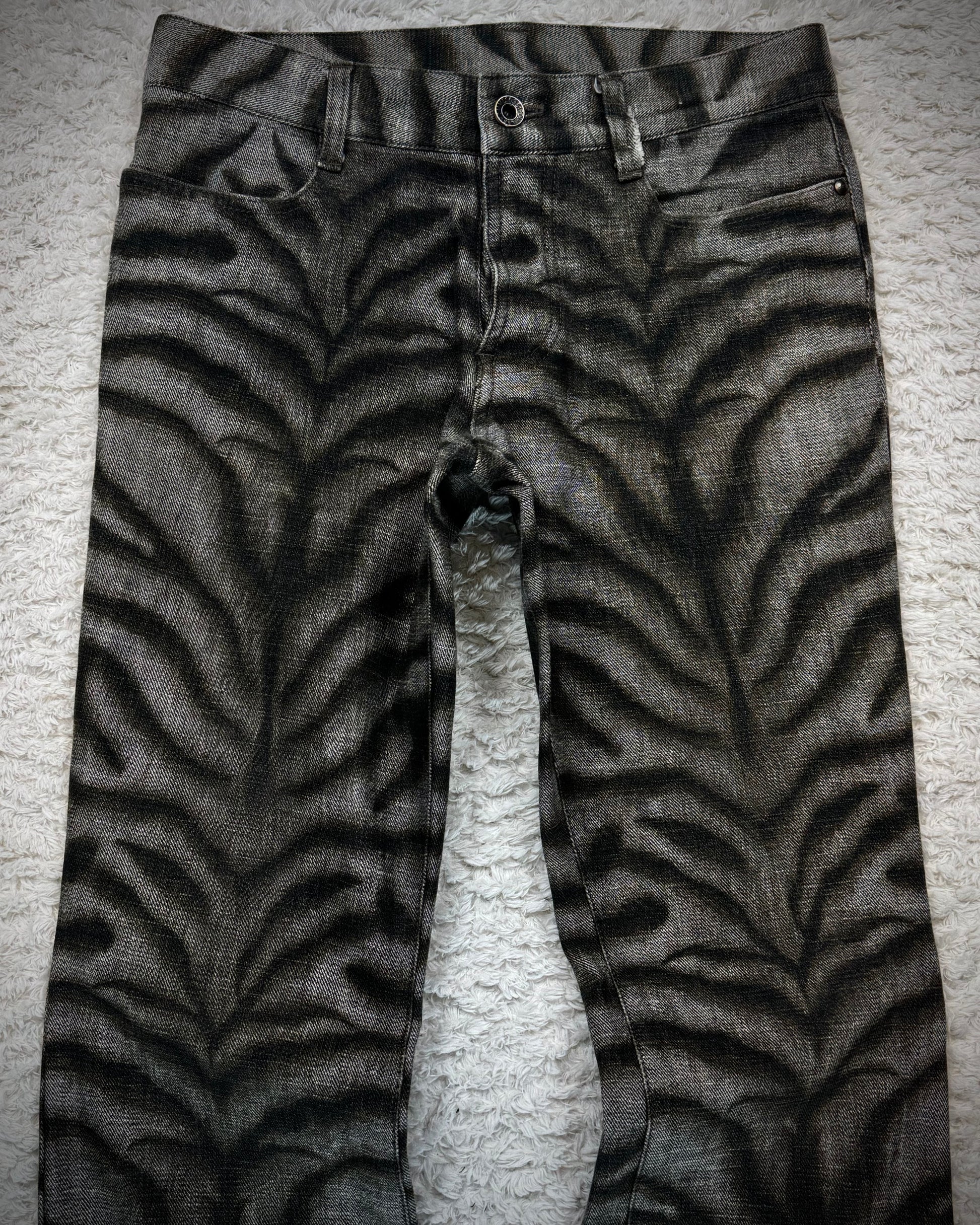 These bootcut pants from Japanese brand 5351 Pour Les Hommes feature a zebra pattern washed into the fabric. The material has a slight stretch, and the design is finished with slit back pockets.