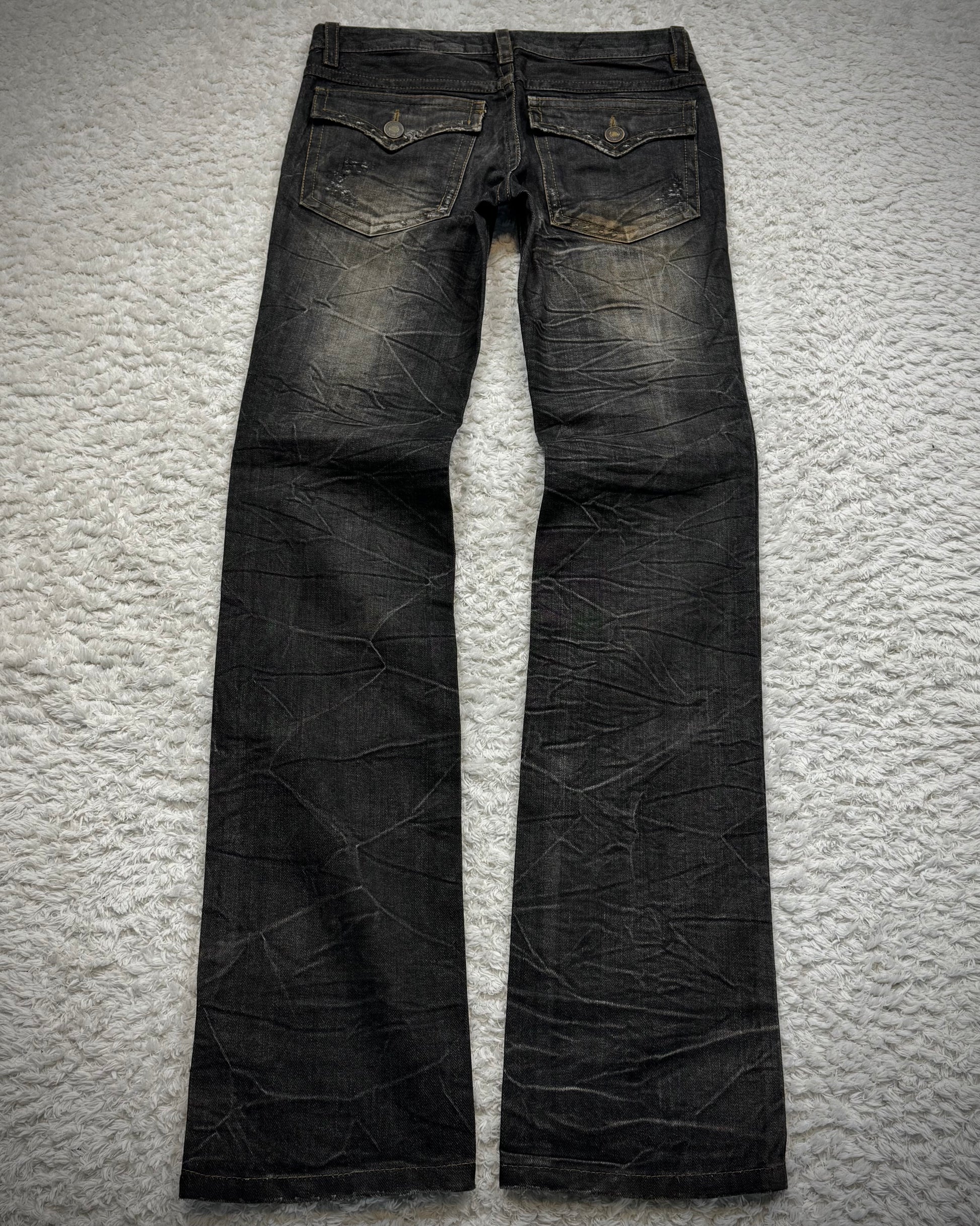These slim-cut jeans from Japanese brand Agate feature a subtle mud wash with a honeycomb-textured finish. They include light distressing and flap back pockets, maintaining a clean, narrow silhouette.