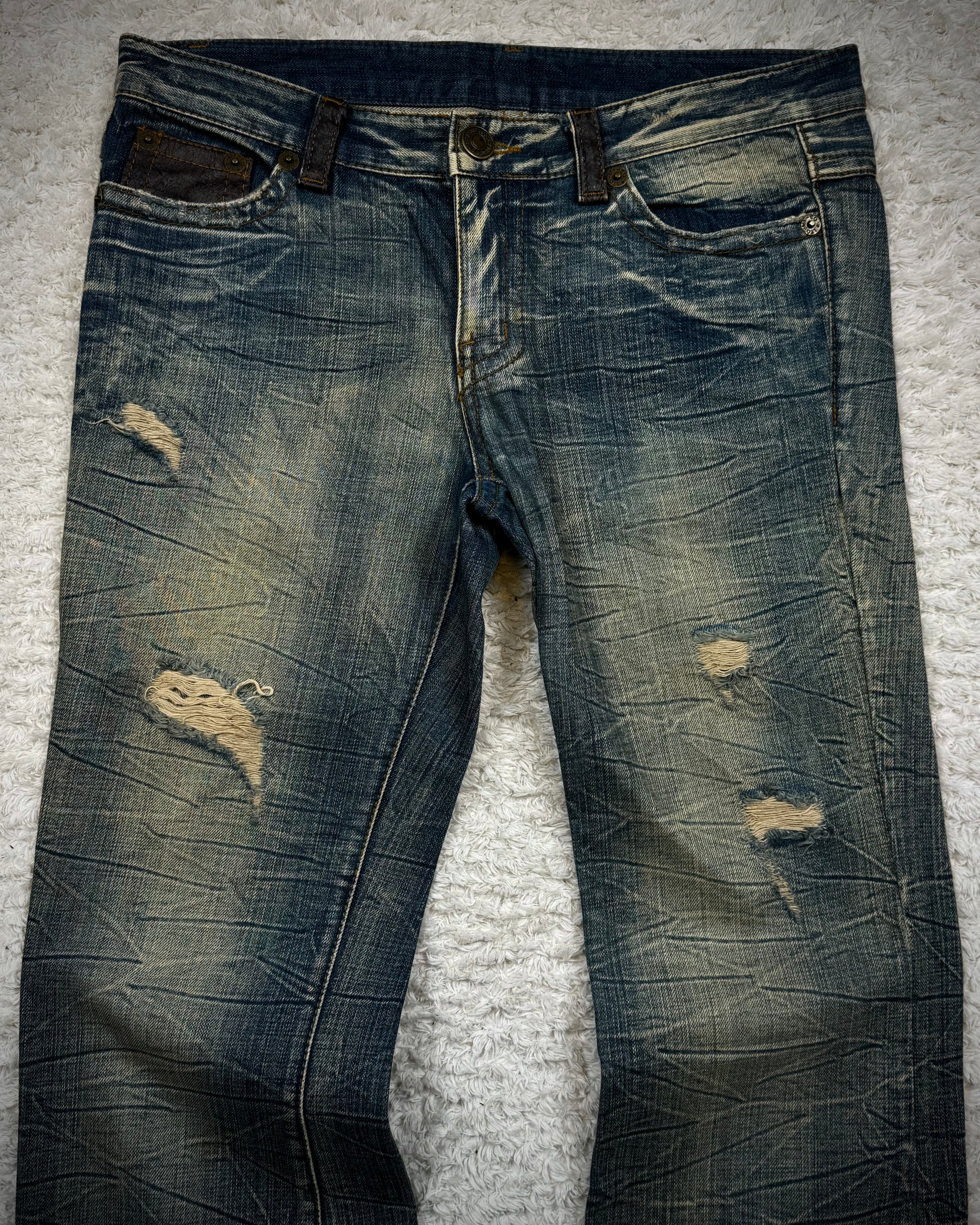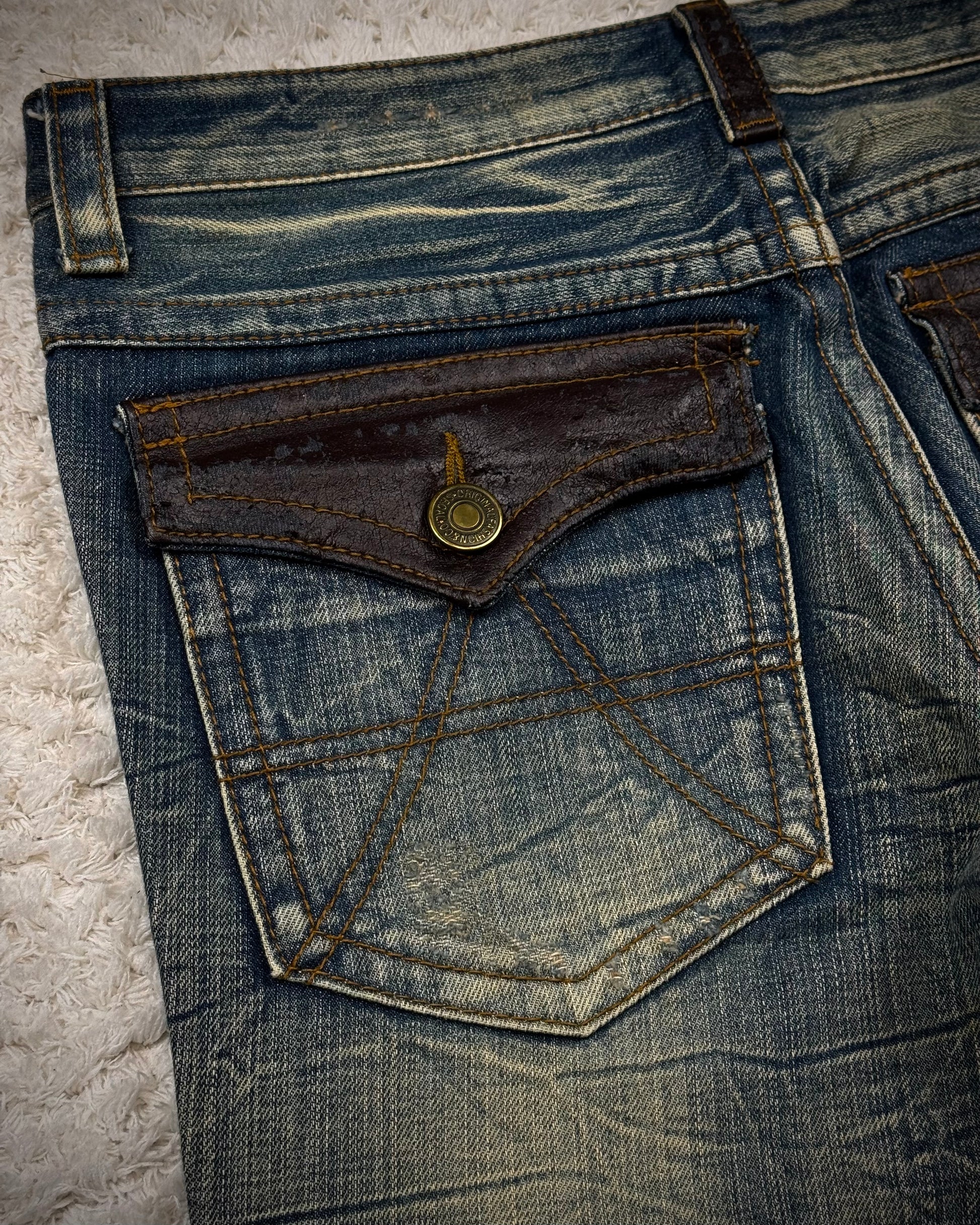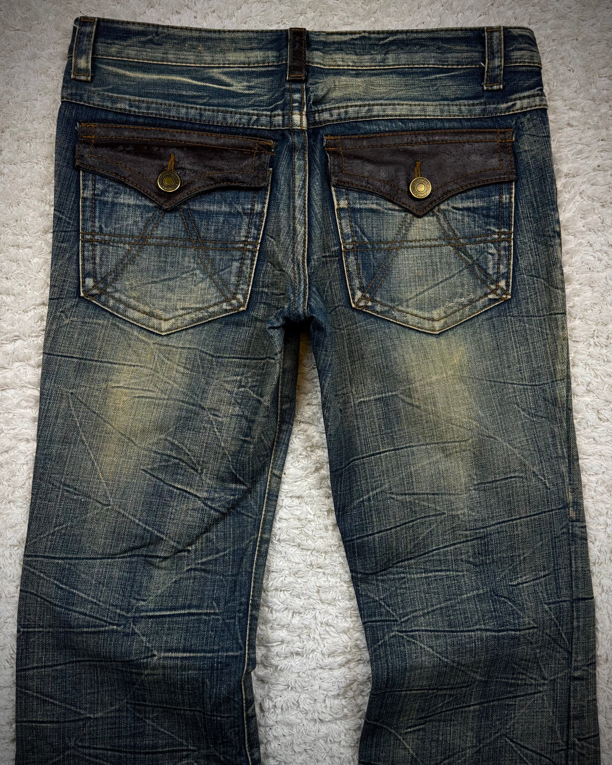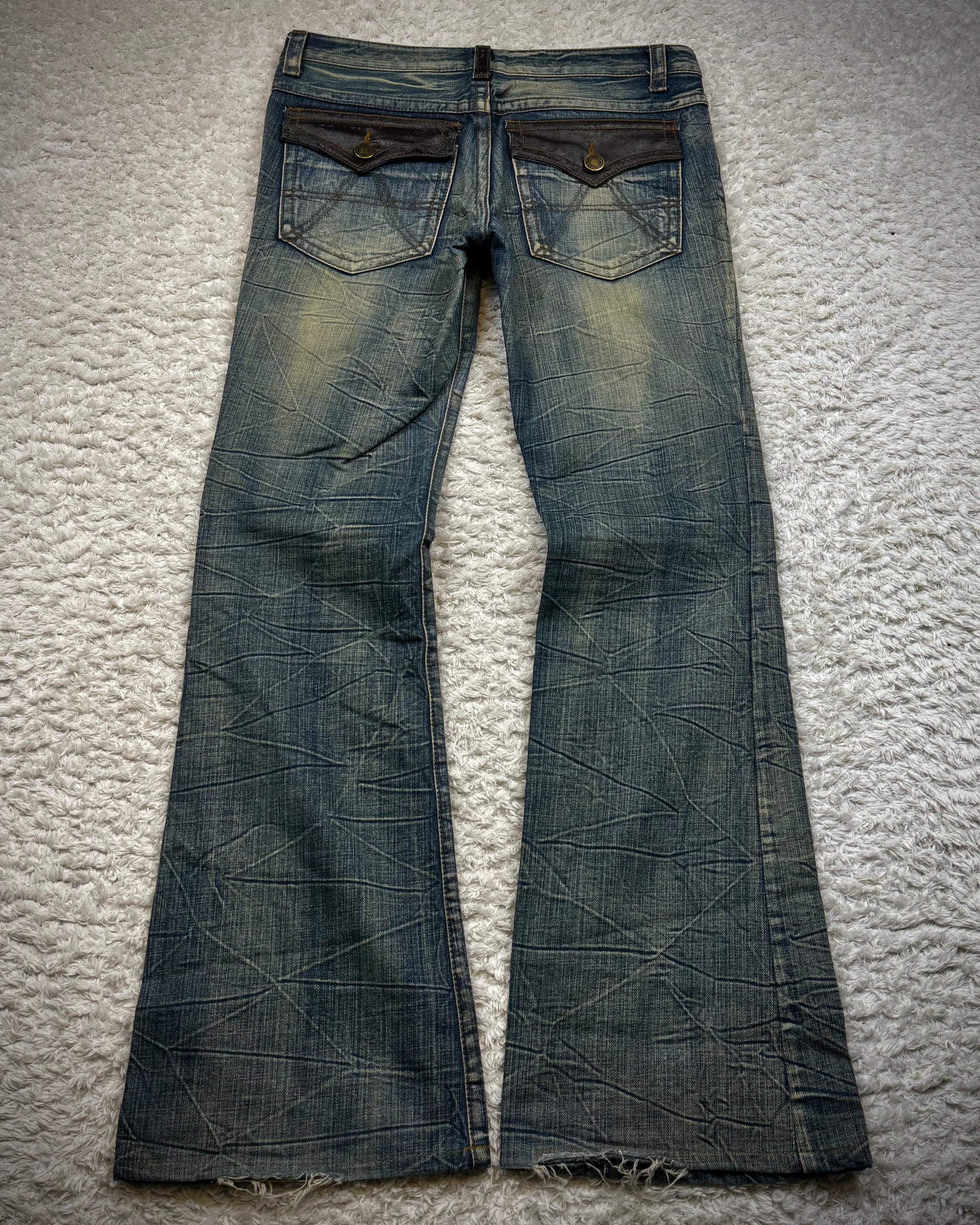 These flared jeans from Japanese brand Agate Label feature a muddy wash with a honeycomb texture. The pockets and belt loops are detailed with leather.