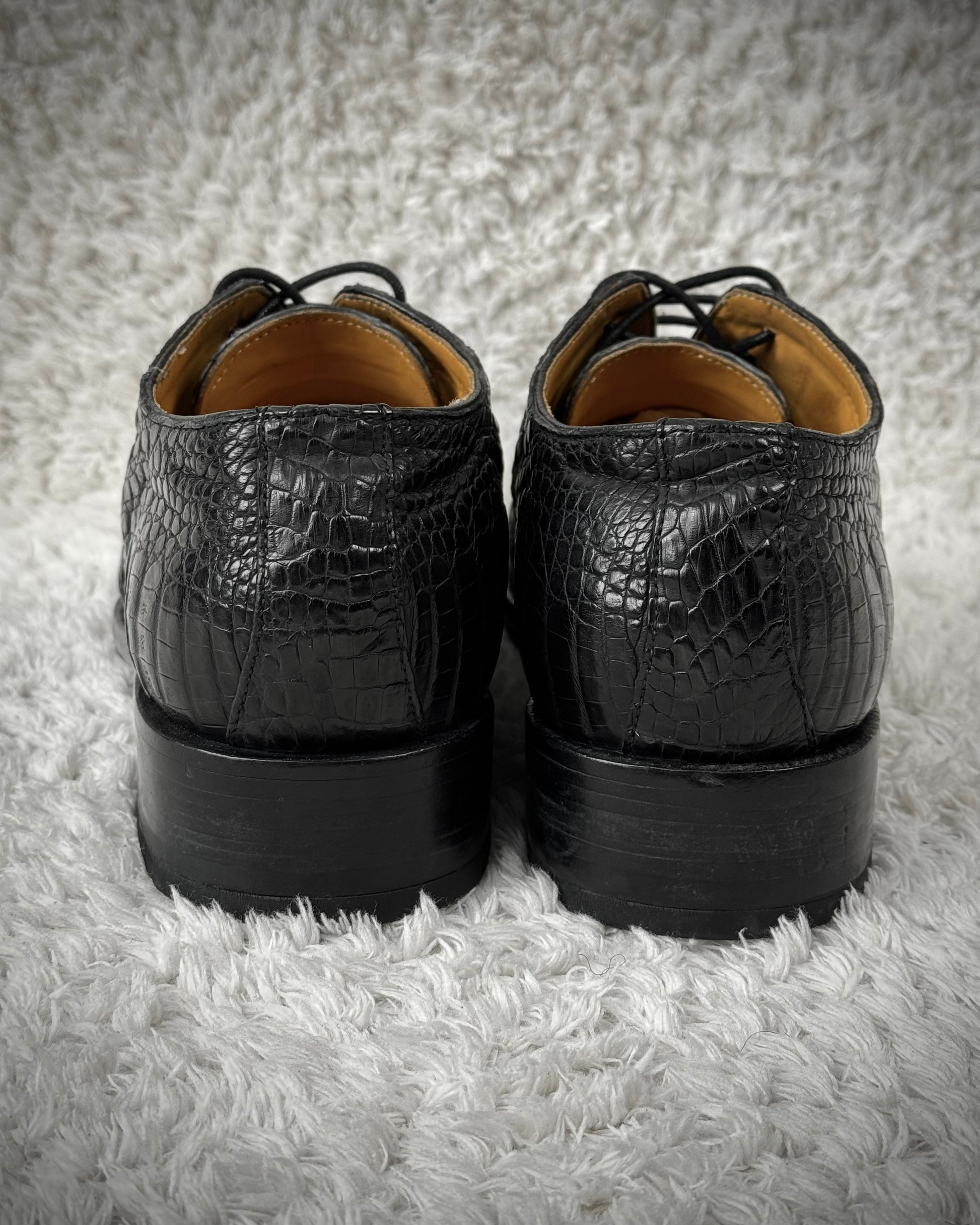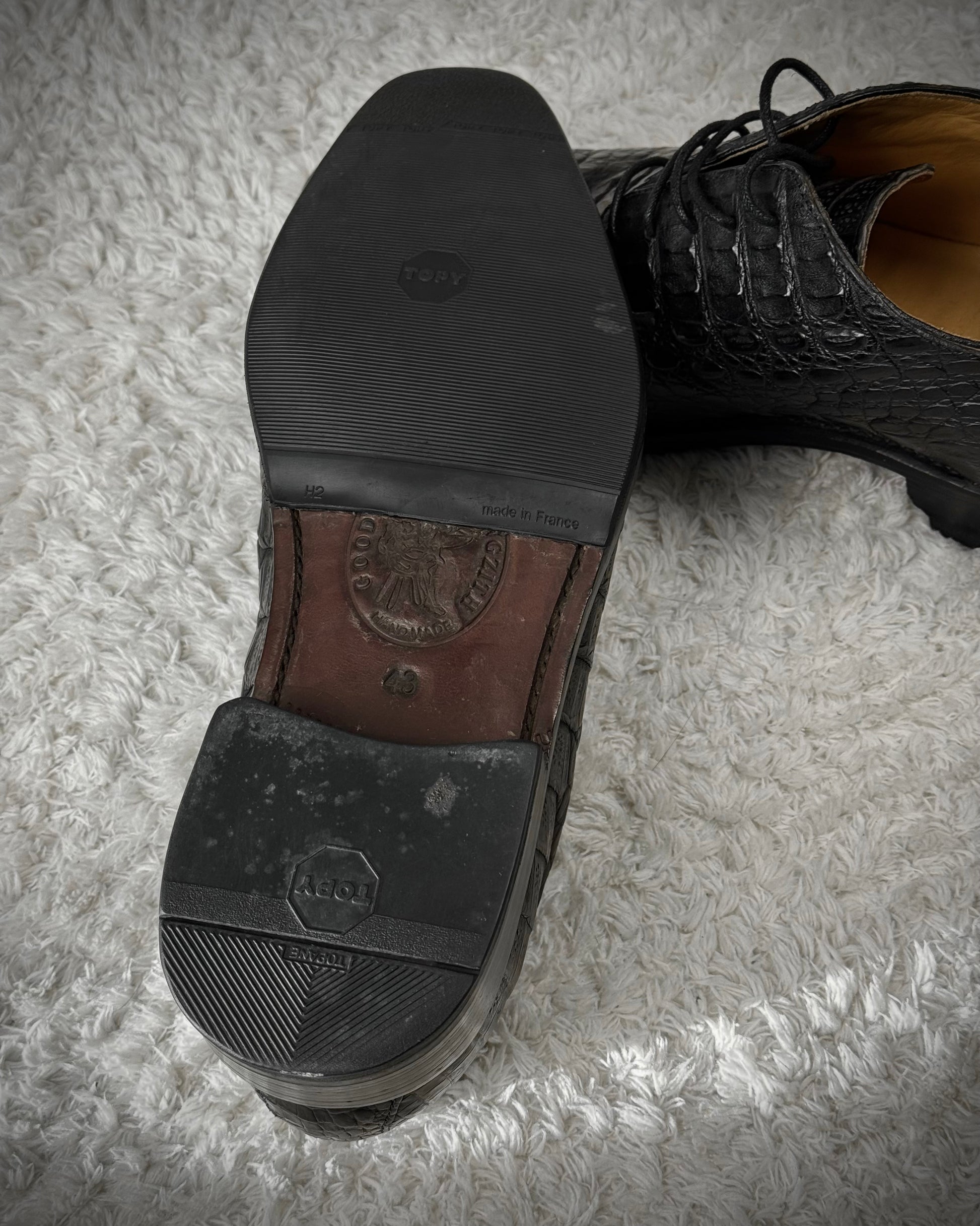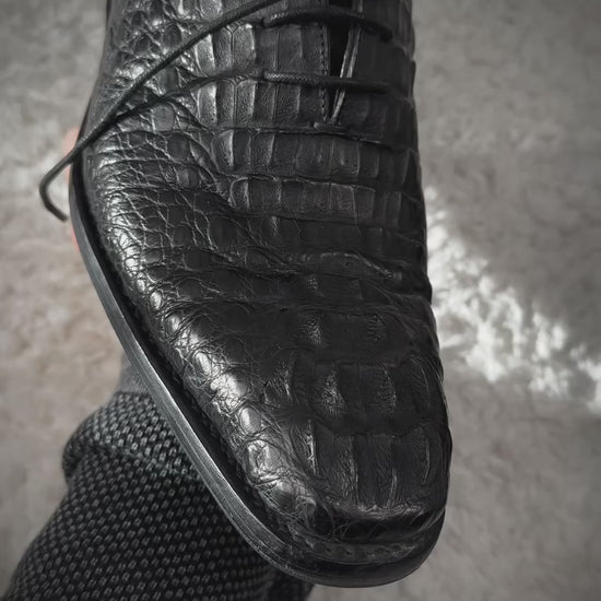These boots are crafted from crocodile leather with extremely deep, high-detail scales that create a pronounced three-dimensional surface. The finish balances a raw, textured character with an elegant overall presence.