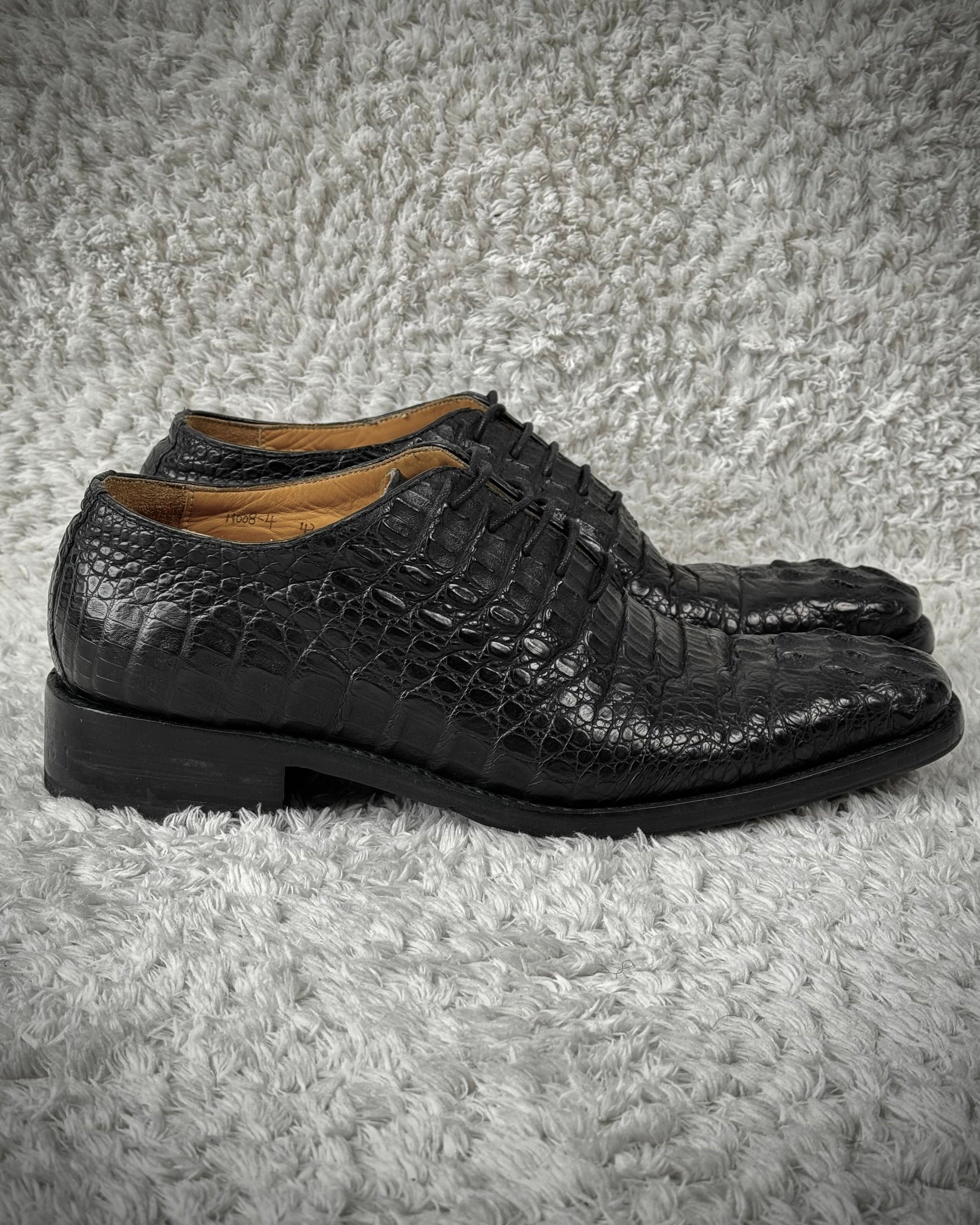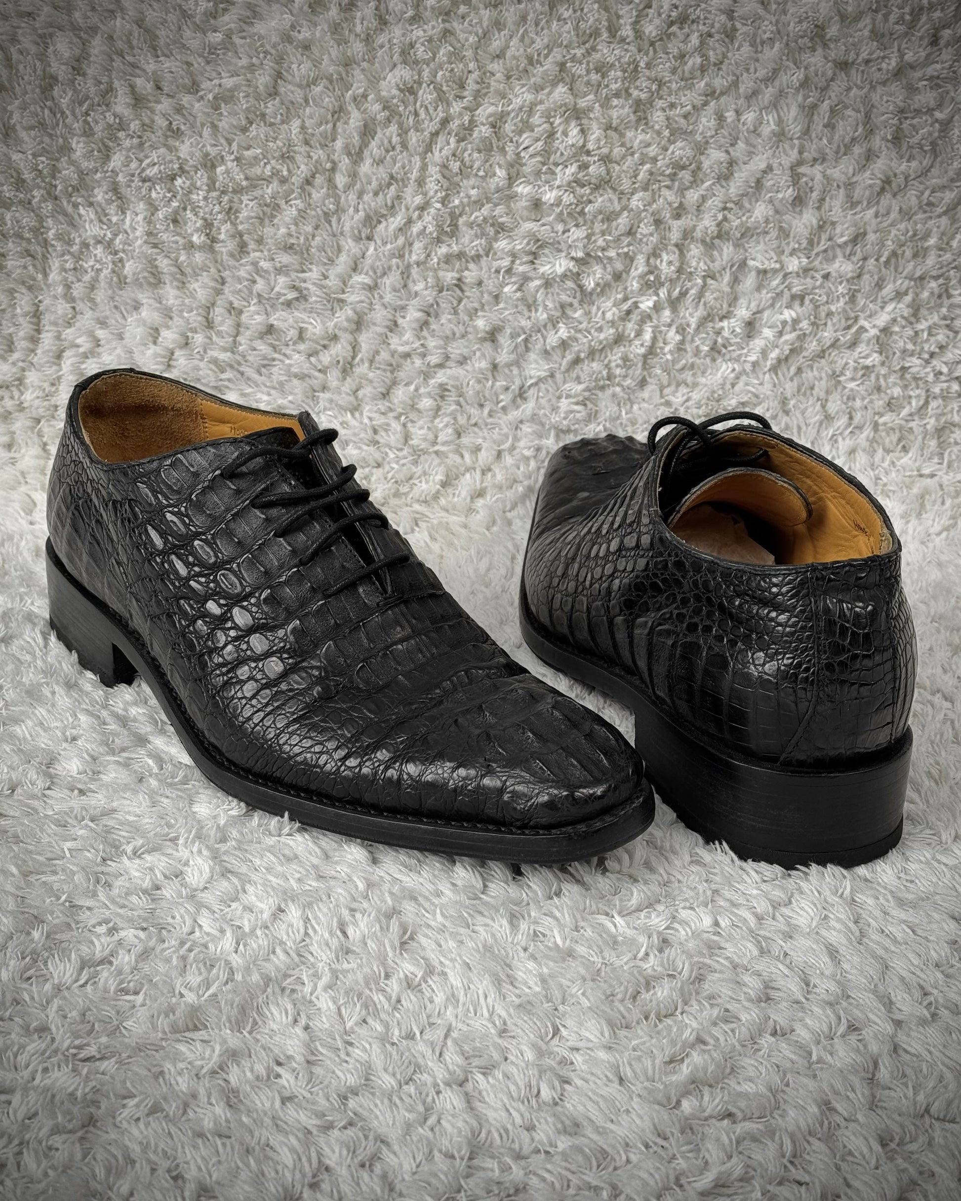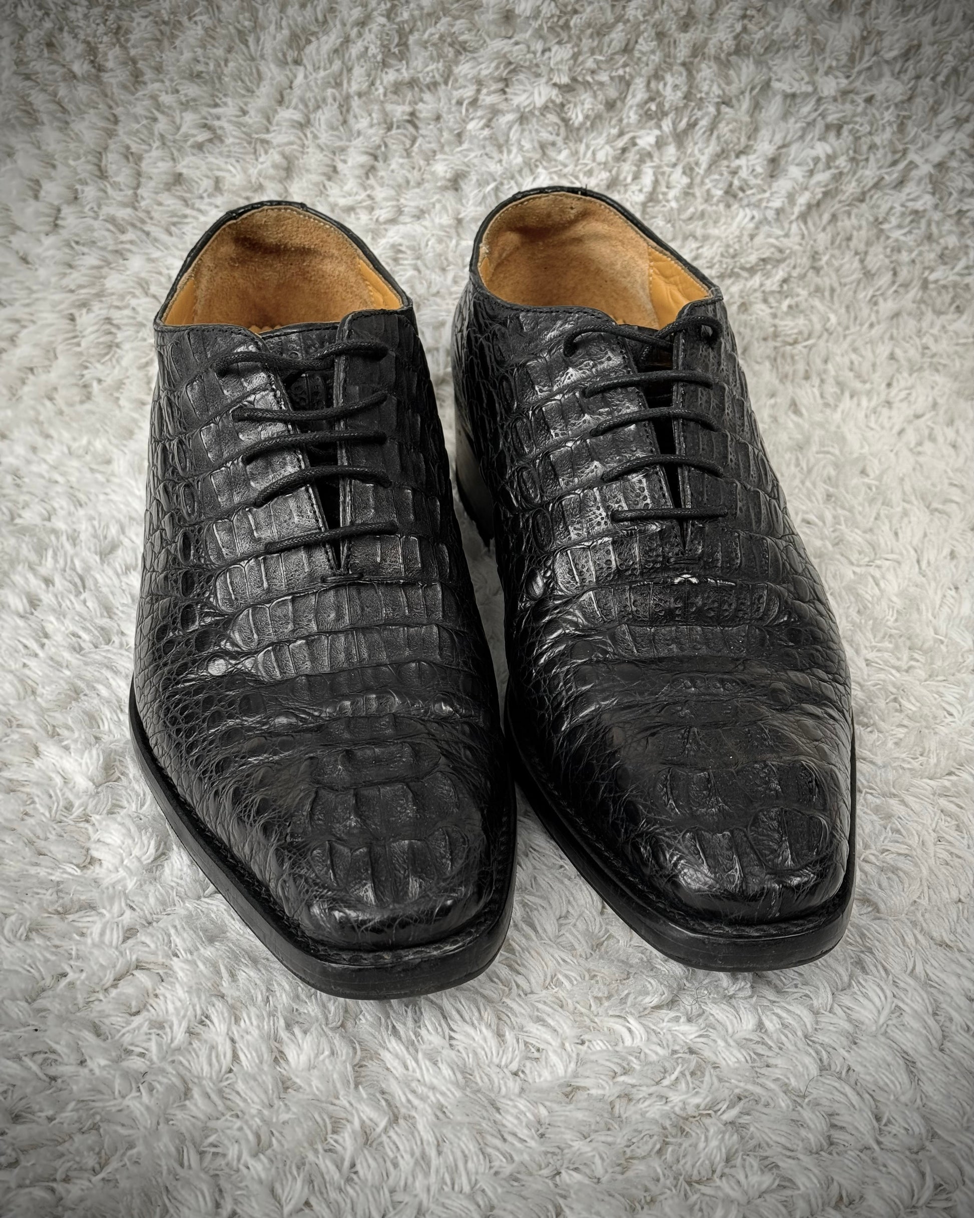 These boots are crafted from crocodile leather with extremely deep, high-detail scales that create a pronounced three-dimensional surface. The finish balances a raw, textured character with an elegant overall presence.