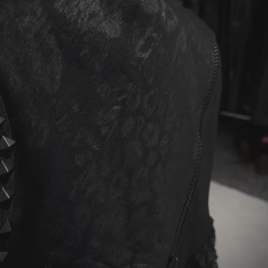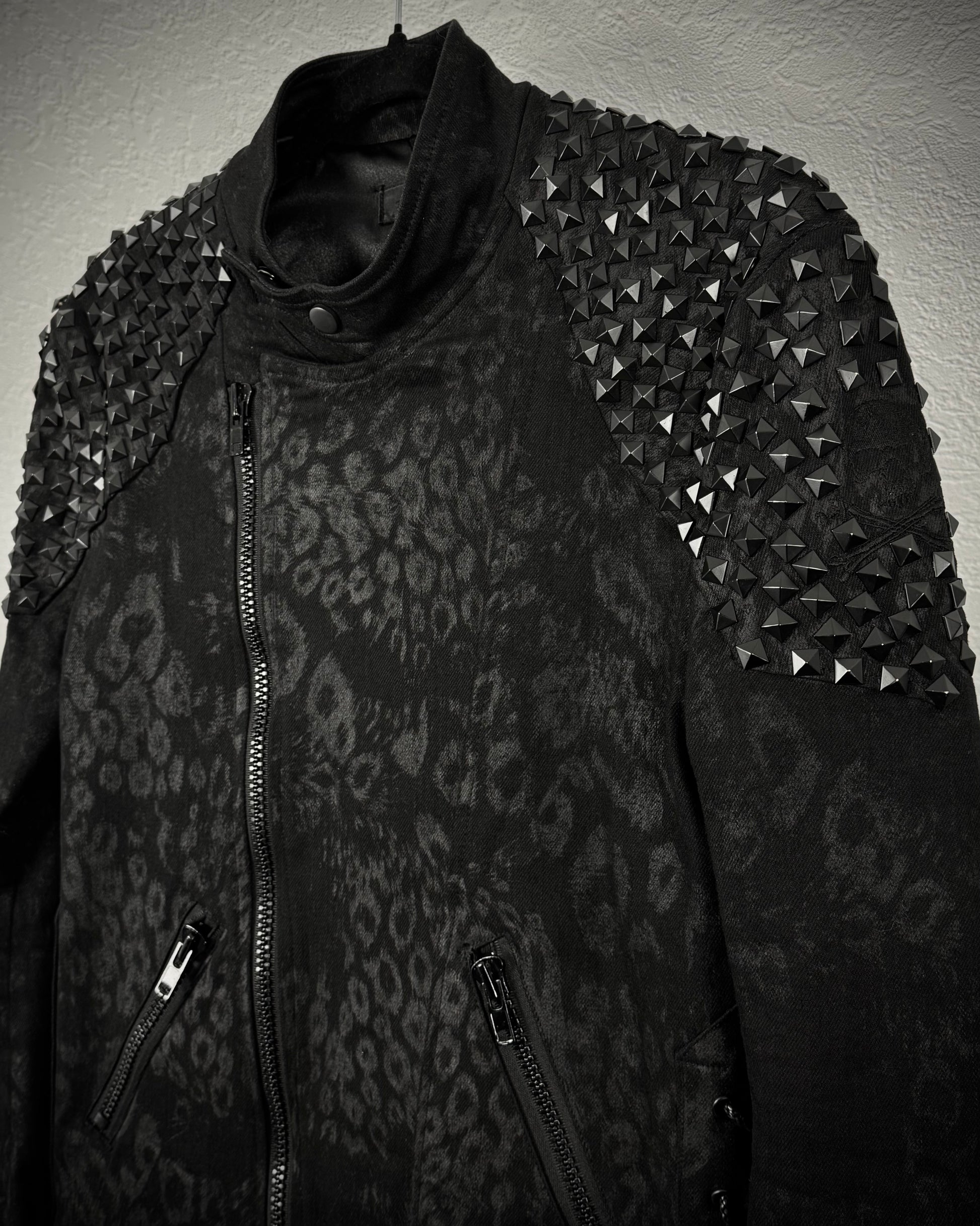 This biker jacket from Korean brand By The R features a leopard-pattern waxed finish and studded shoulders. It includes lace-up panels at both sides of the waist and an asymmetrical front zipper that allows it to be worn as a double rider or fully zipped up.