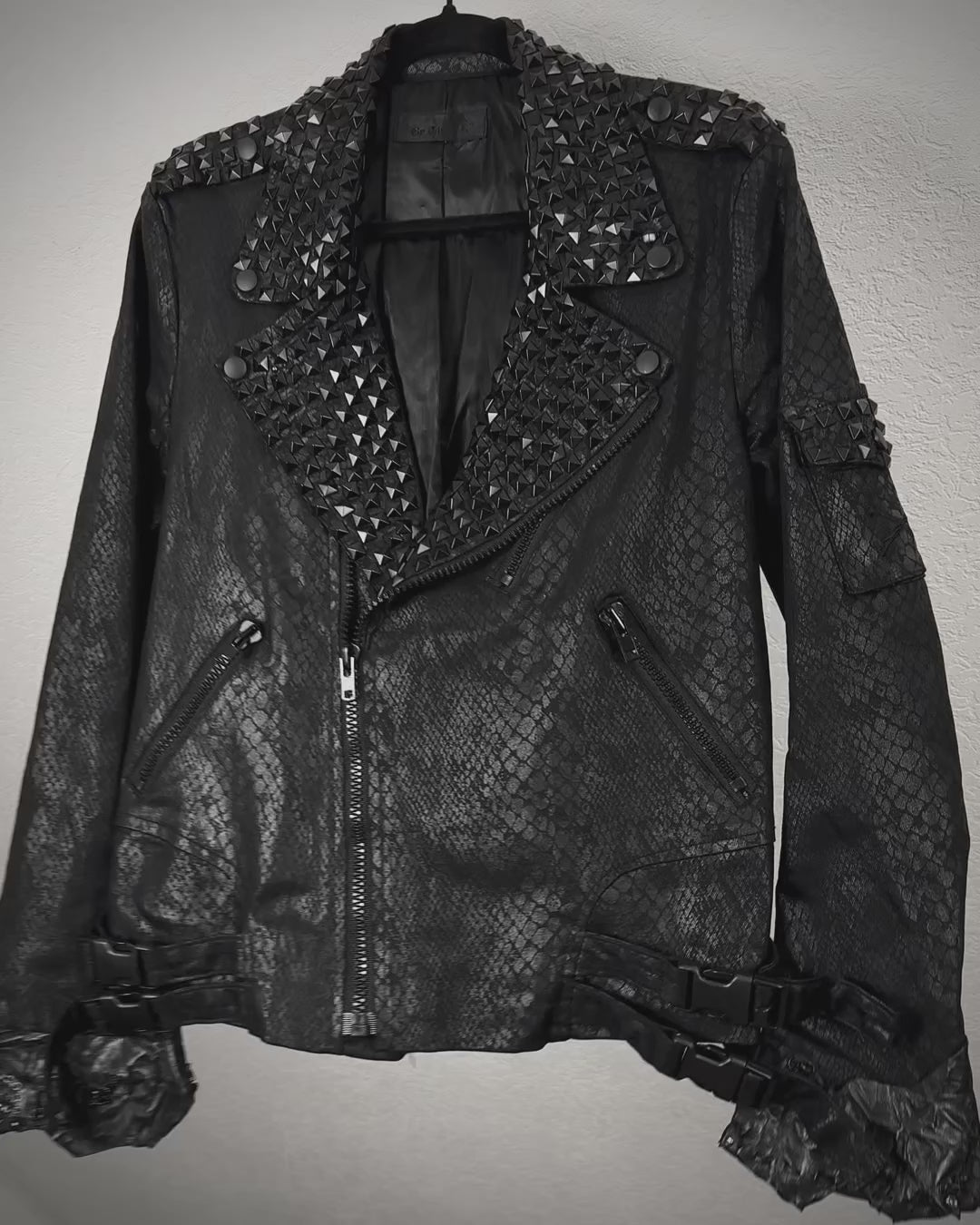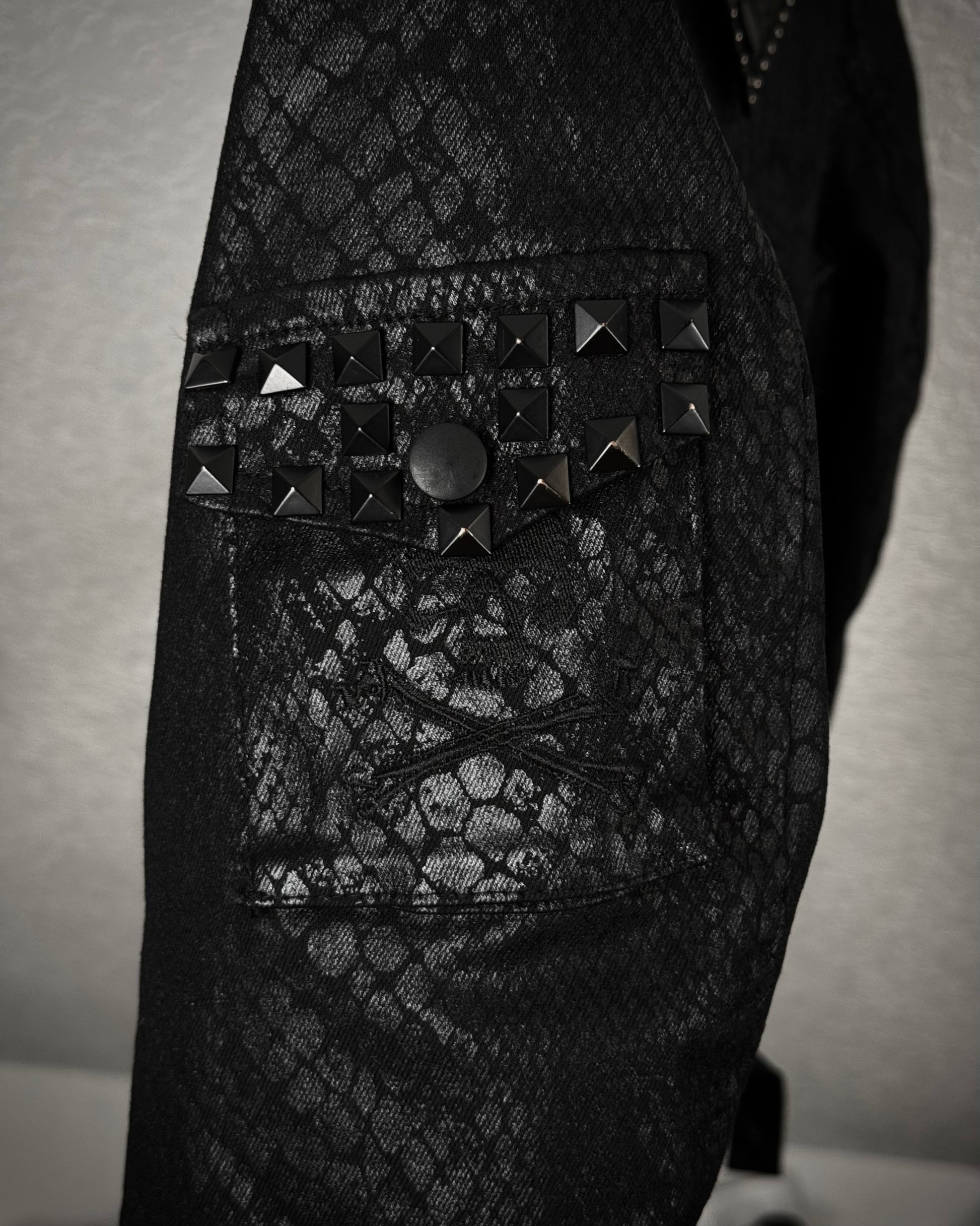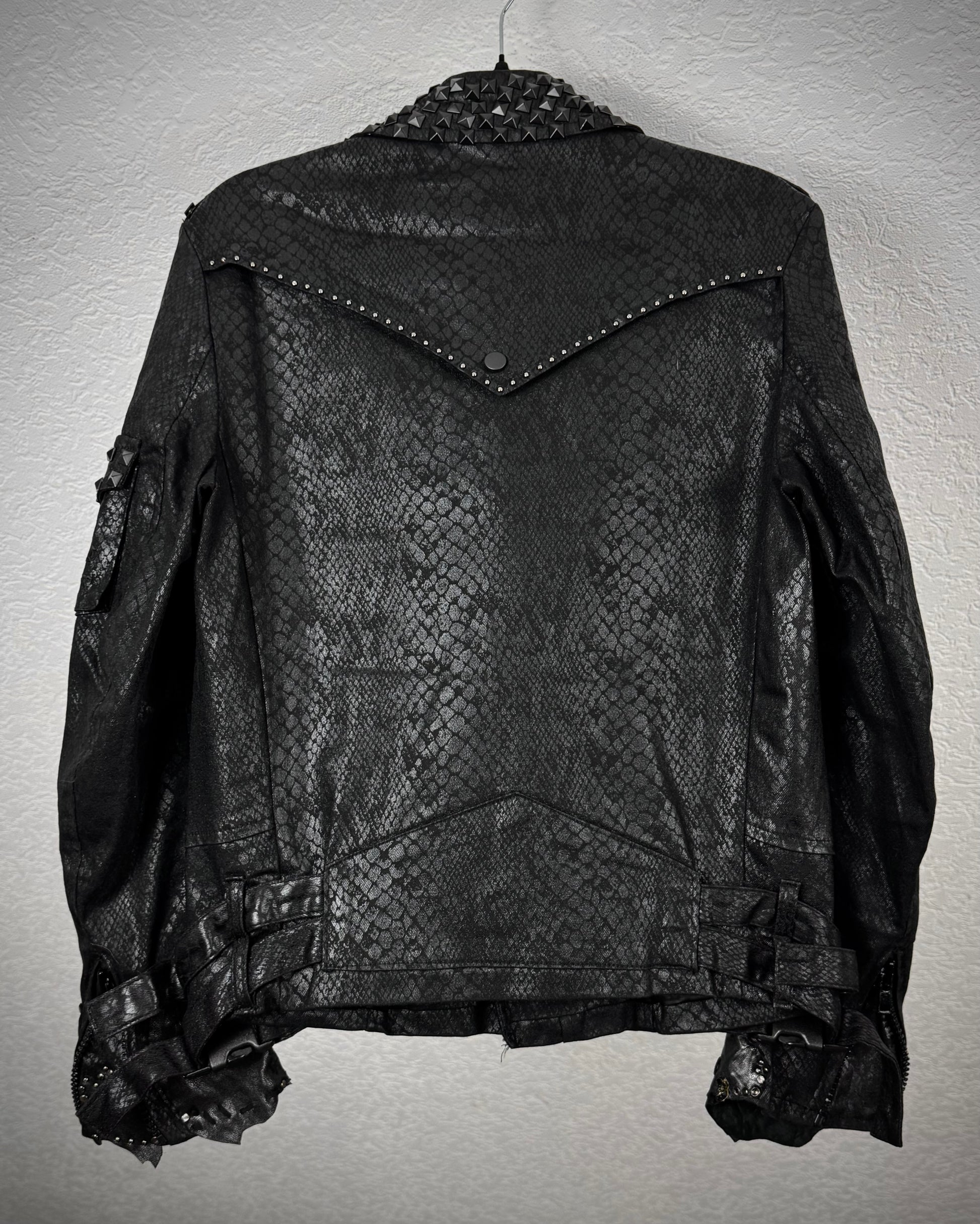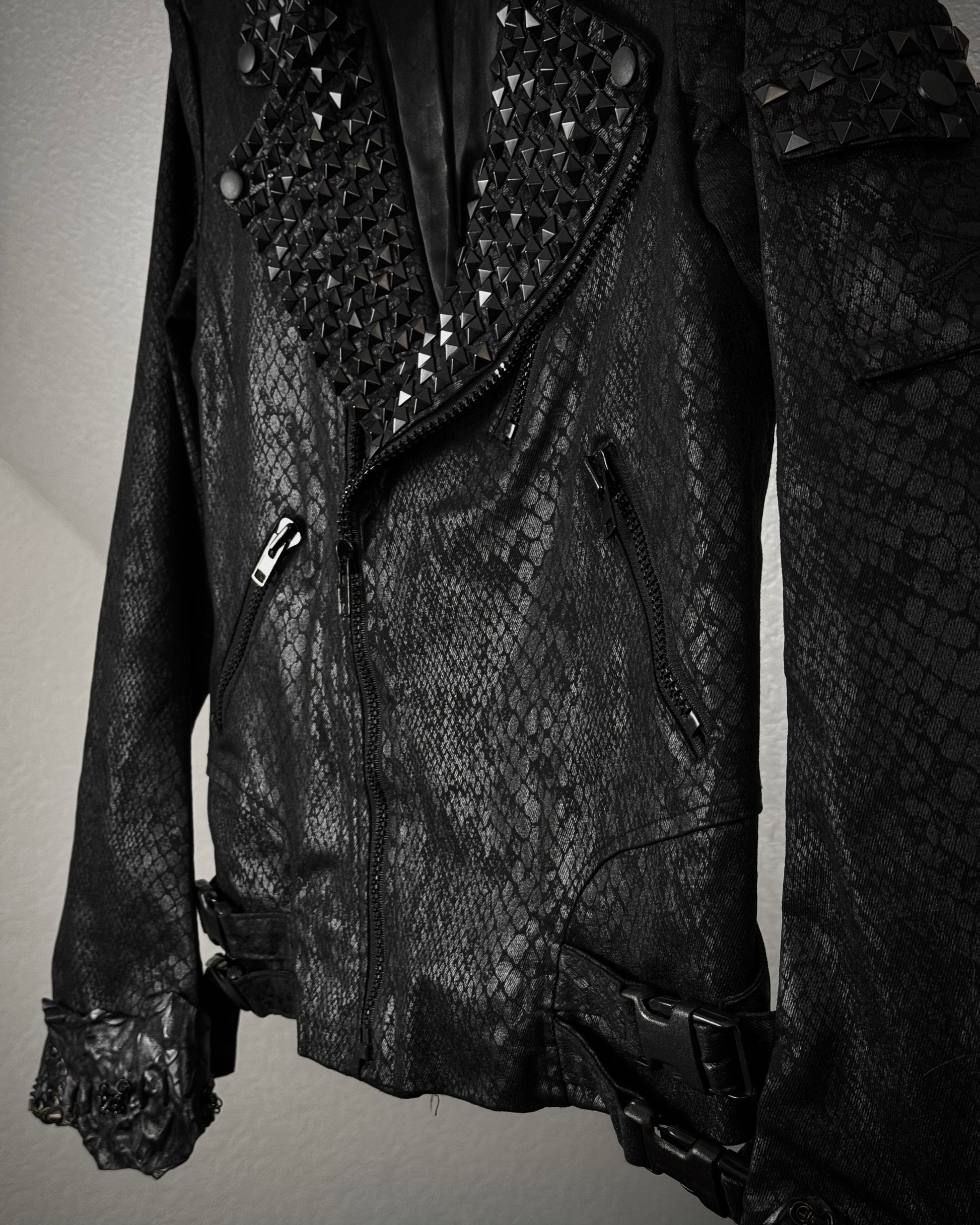 This biker jacket from By The R features an all-over python waxed finish. The cuffs are extended with raw leather panels adorned with scar stitching and piercings. The collar is heavily studded, with additional studs placed across the back, shoulders, and pockets.