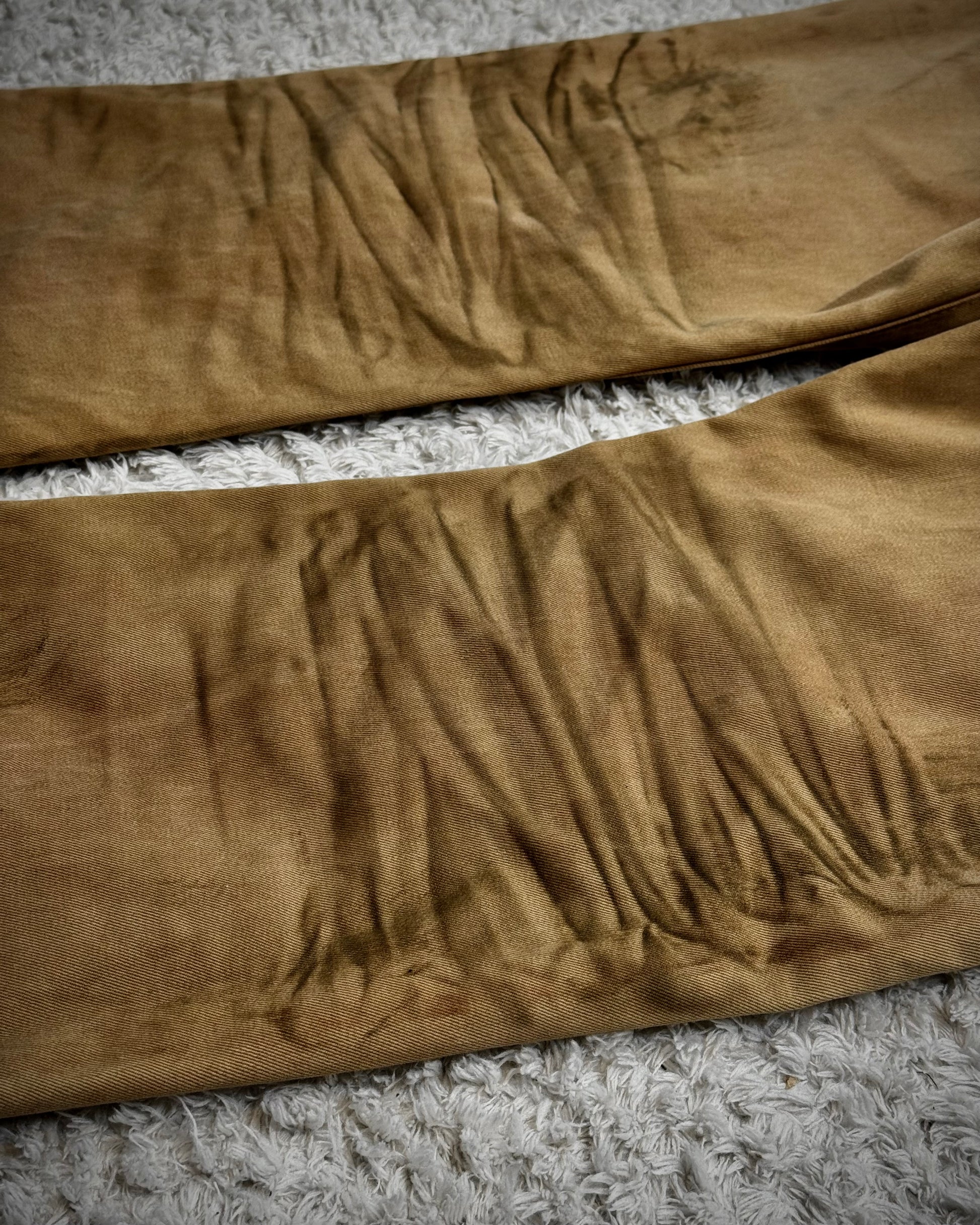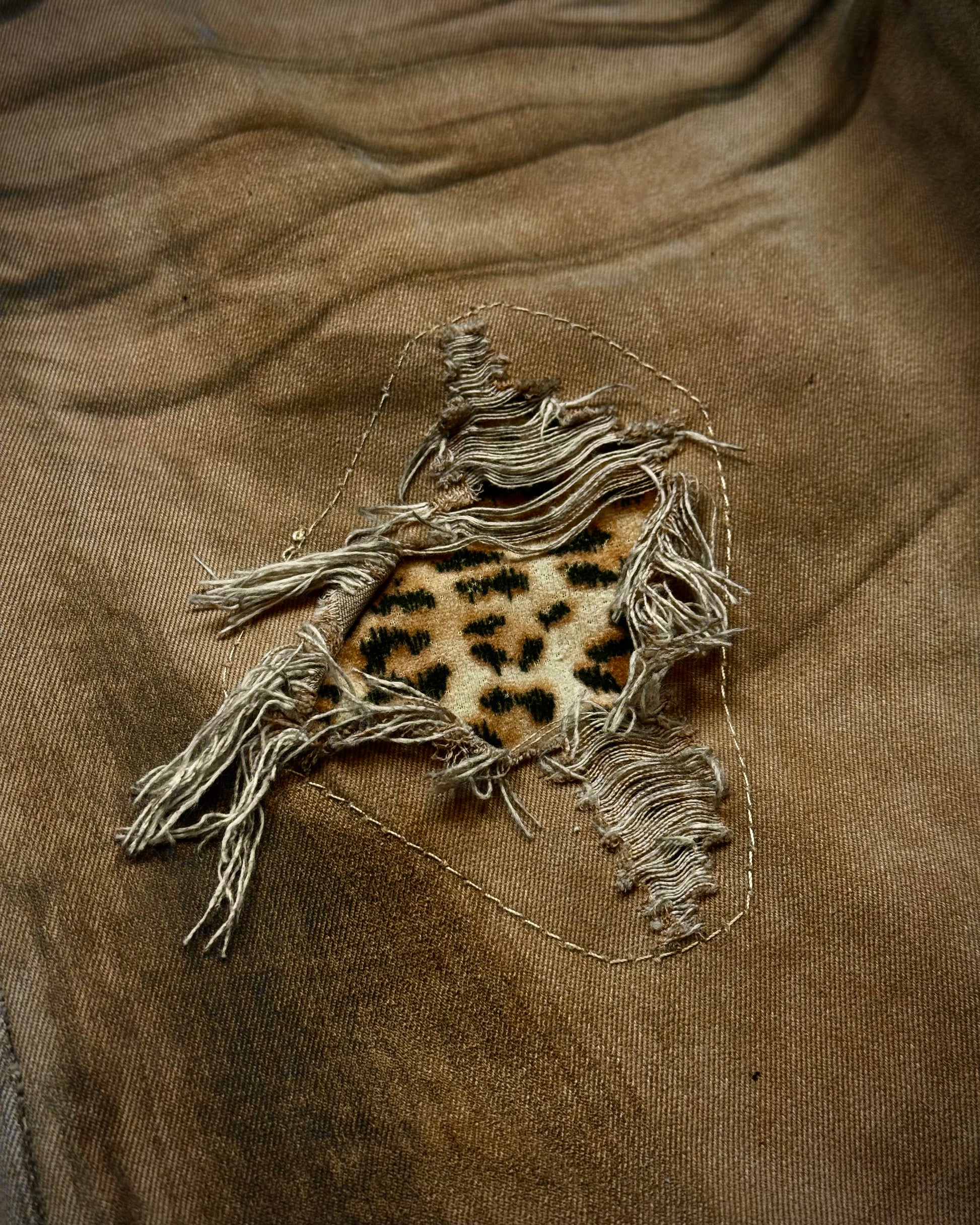 These bootcut jeans from Japanese brand CavariA feature a clawmark wash and distressed areas repaired with leopard pattern fabric. They include a studded pocket and a D-ring attachment at the belt loop.