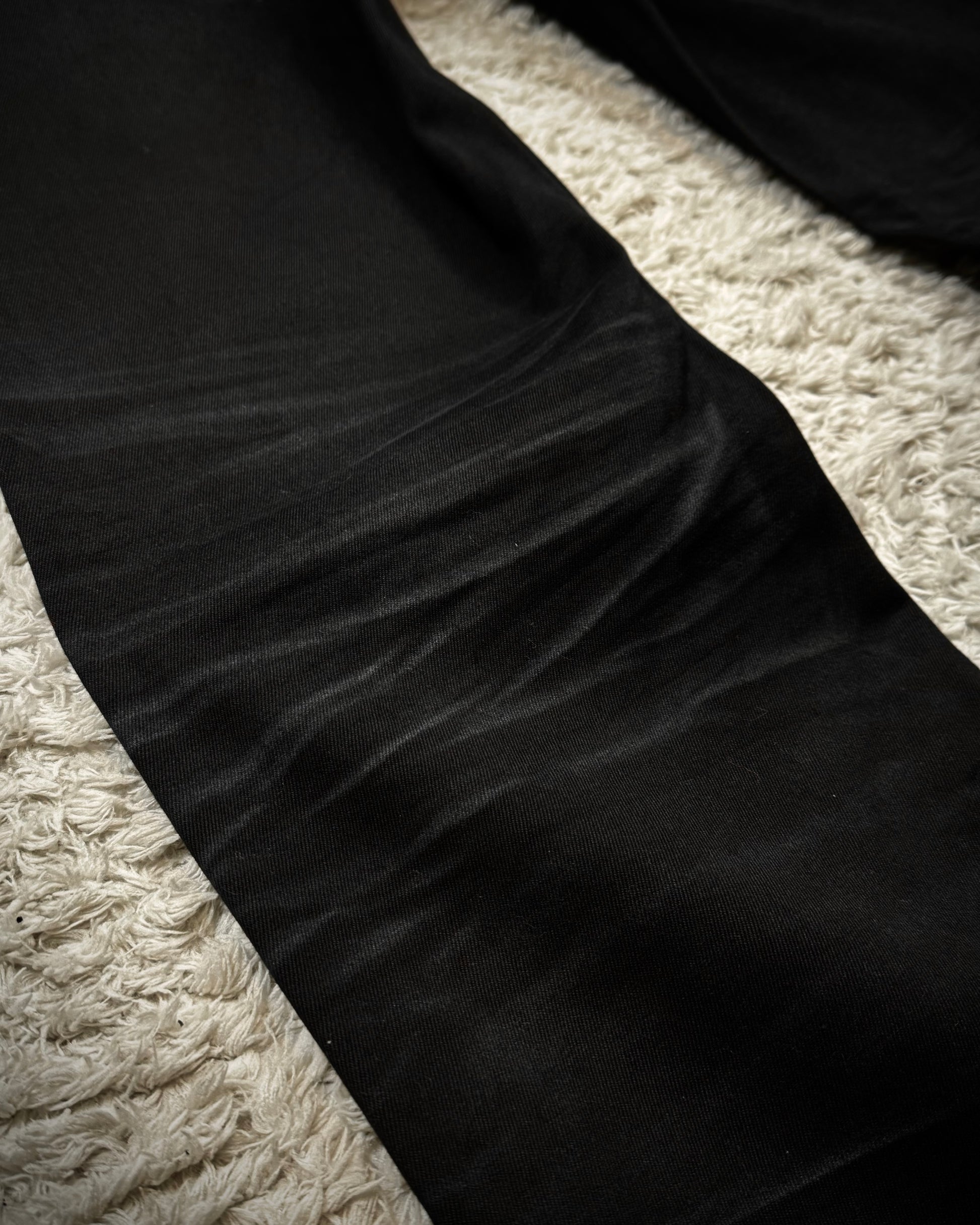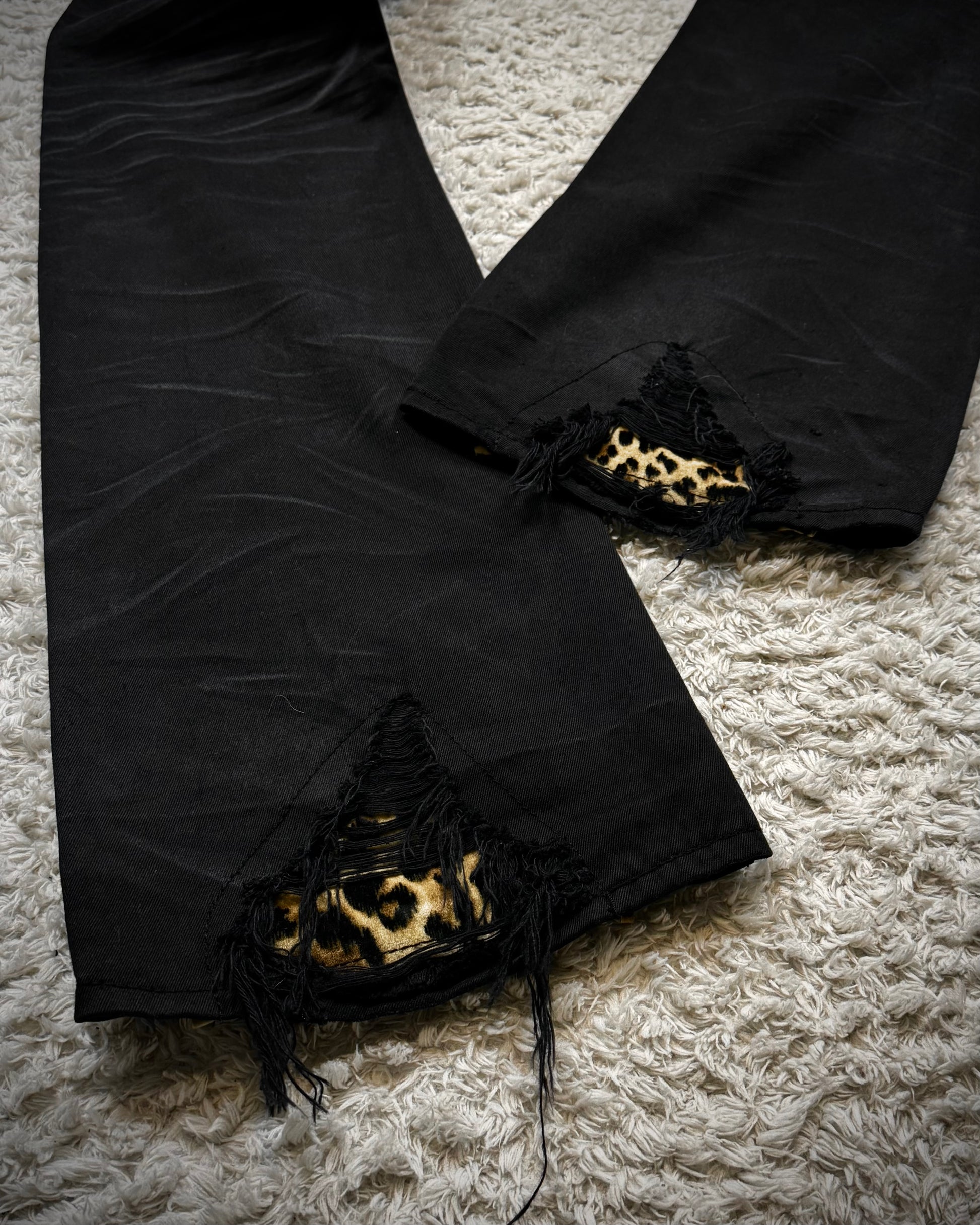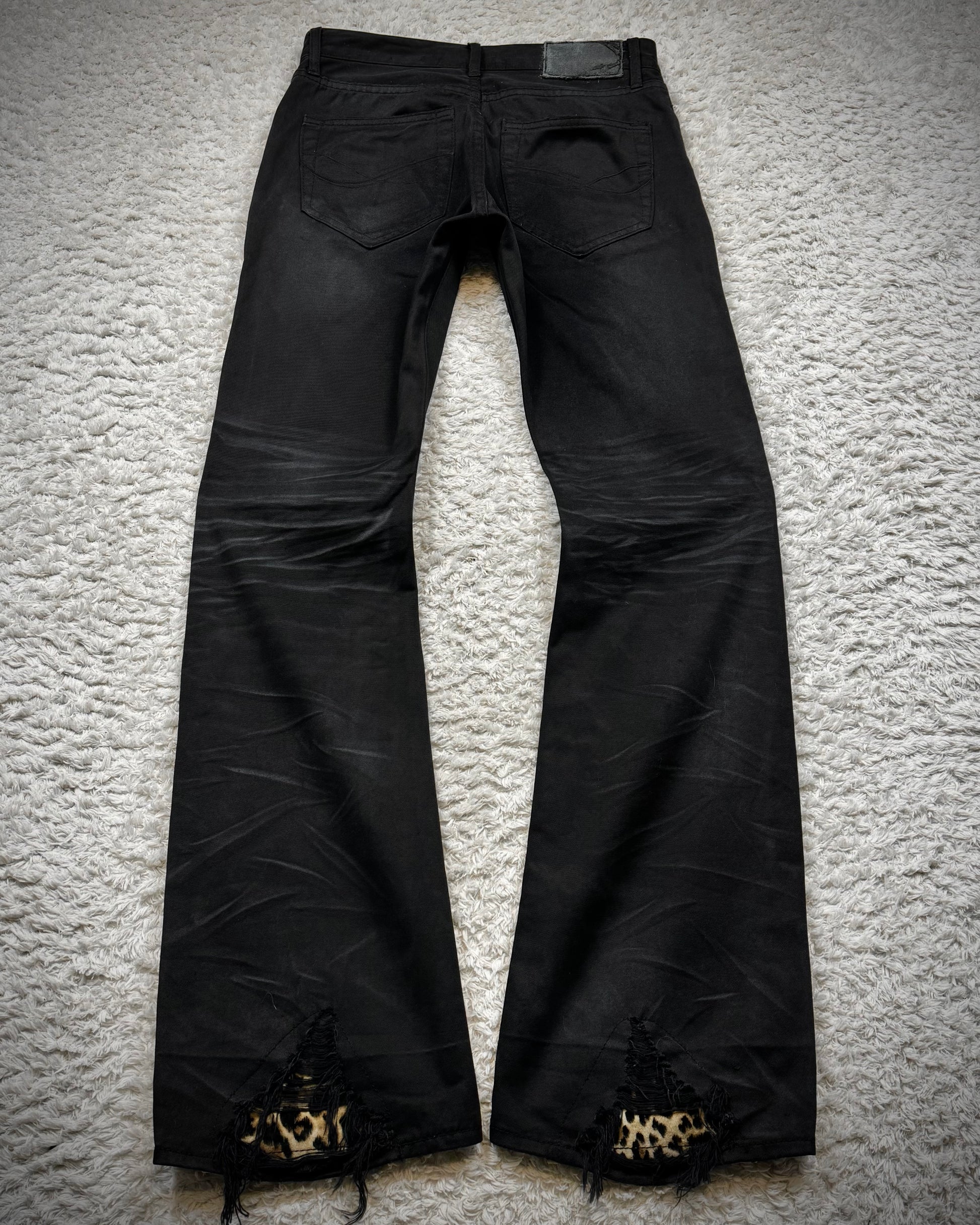These bootcut jeans from Japanese brand CavariA feature distressed areas repaired with leopard pattern fabric. Pyramid studs decorate the left front pocket, and the denim is finished with a subtle whisker wash.