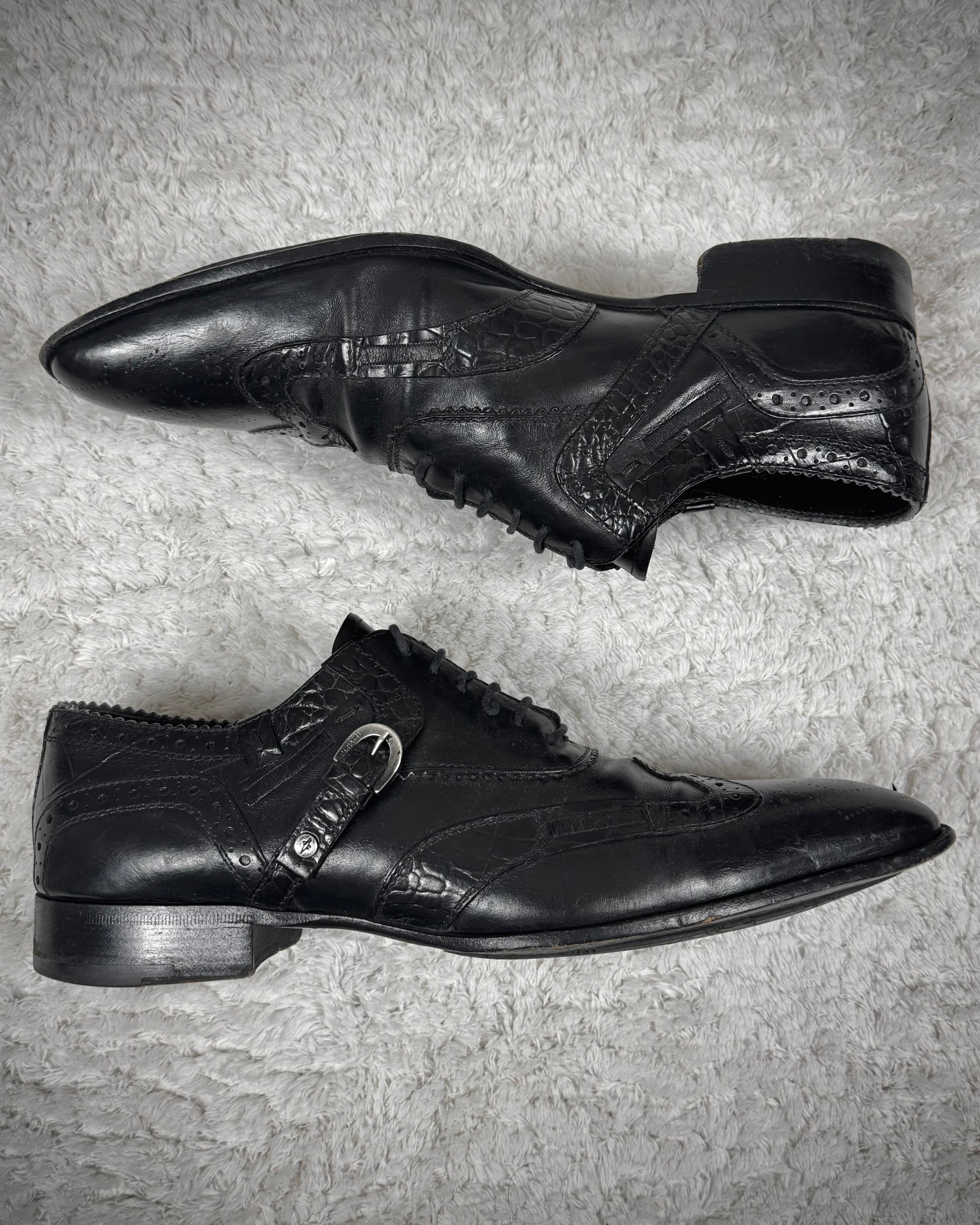 These dress boots from Italian brand Cesare Paciotti feature crocodile-textured detailing and a branded belt accent across the sides.