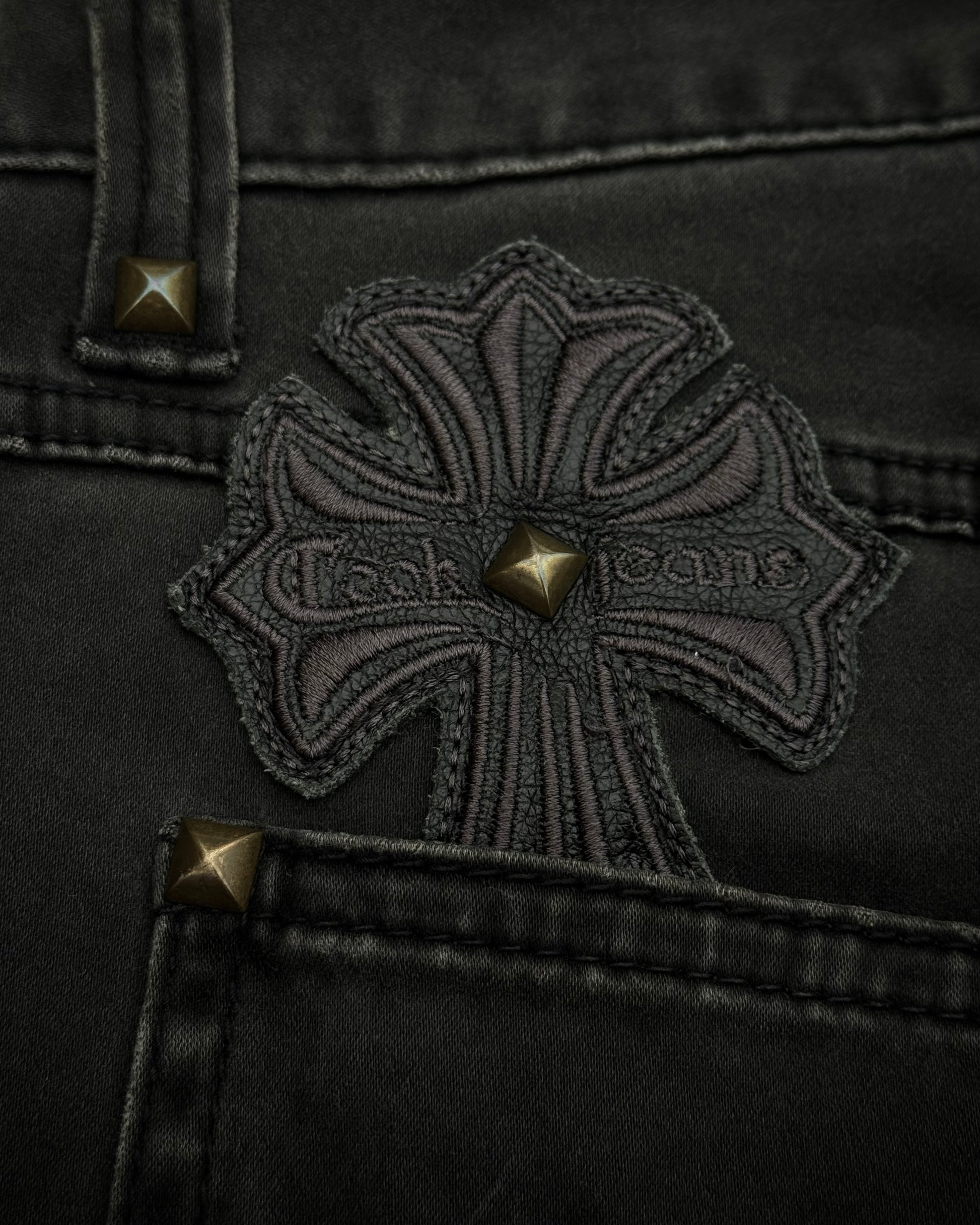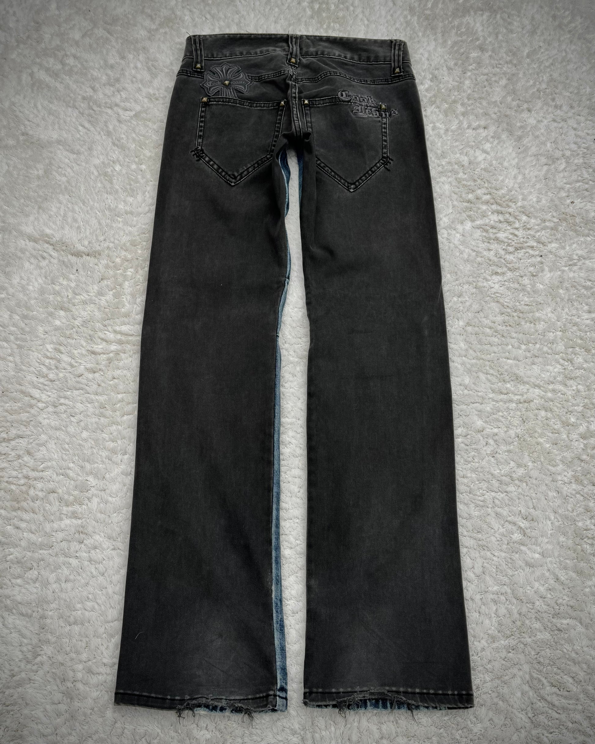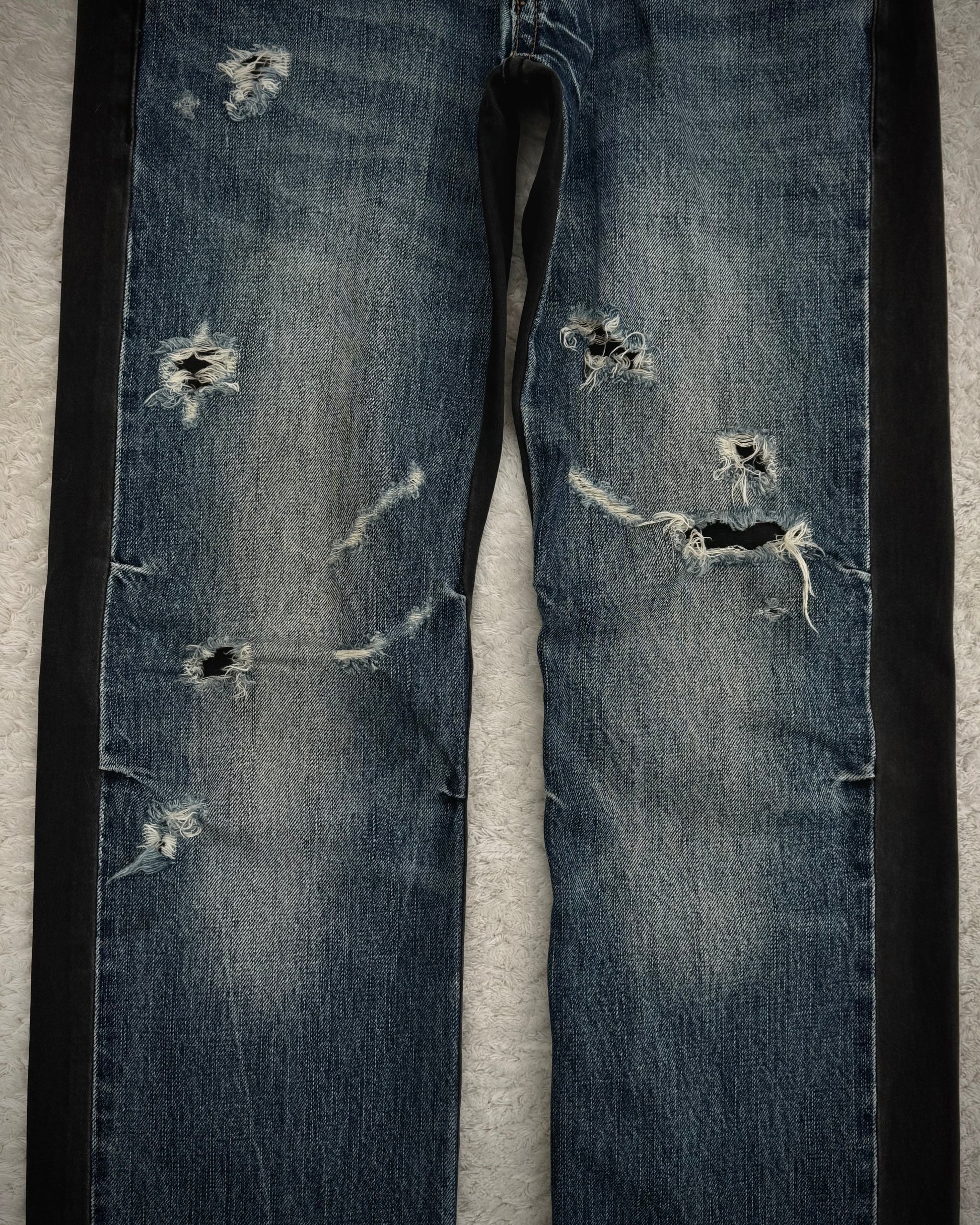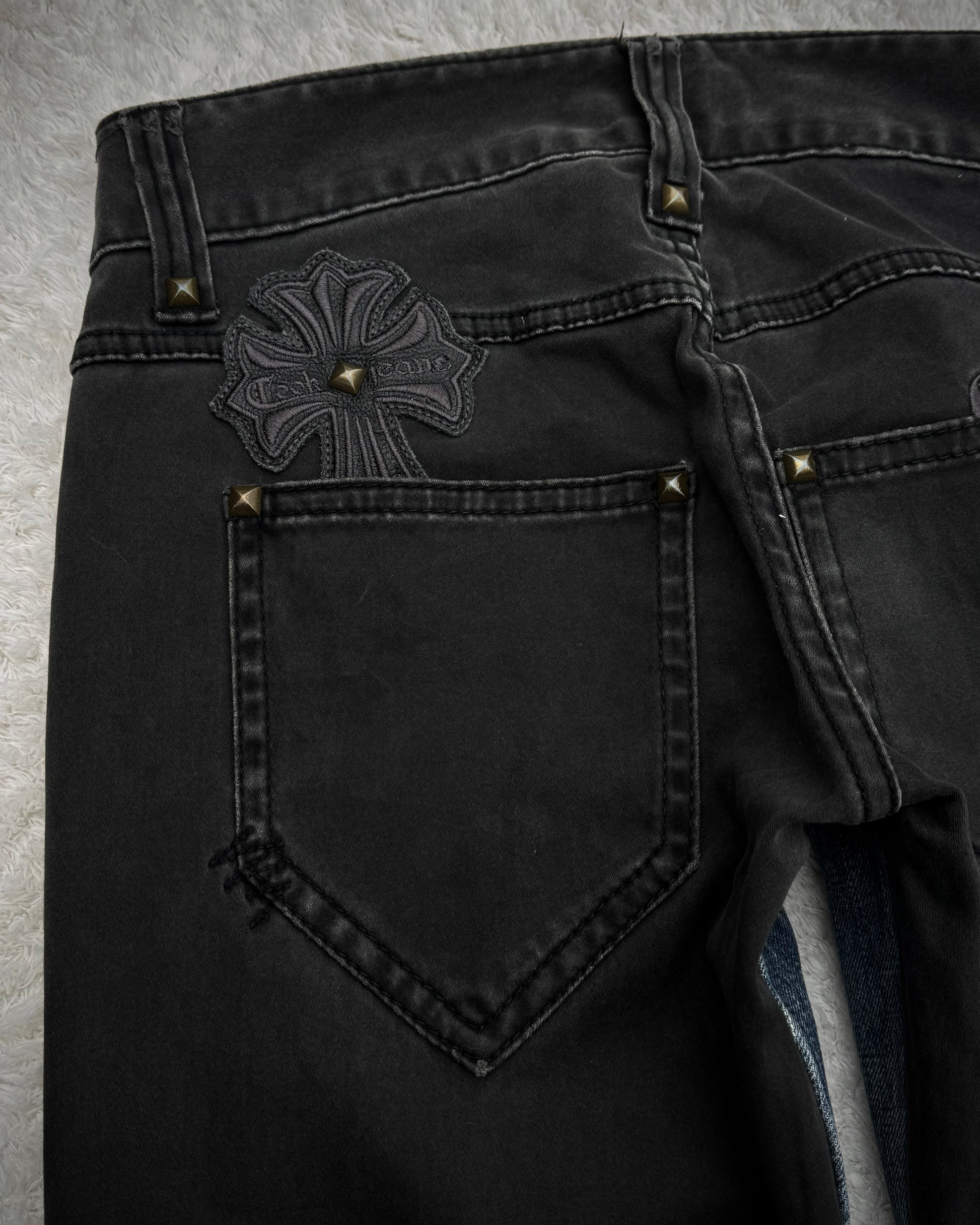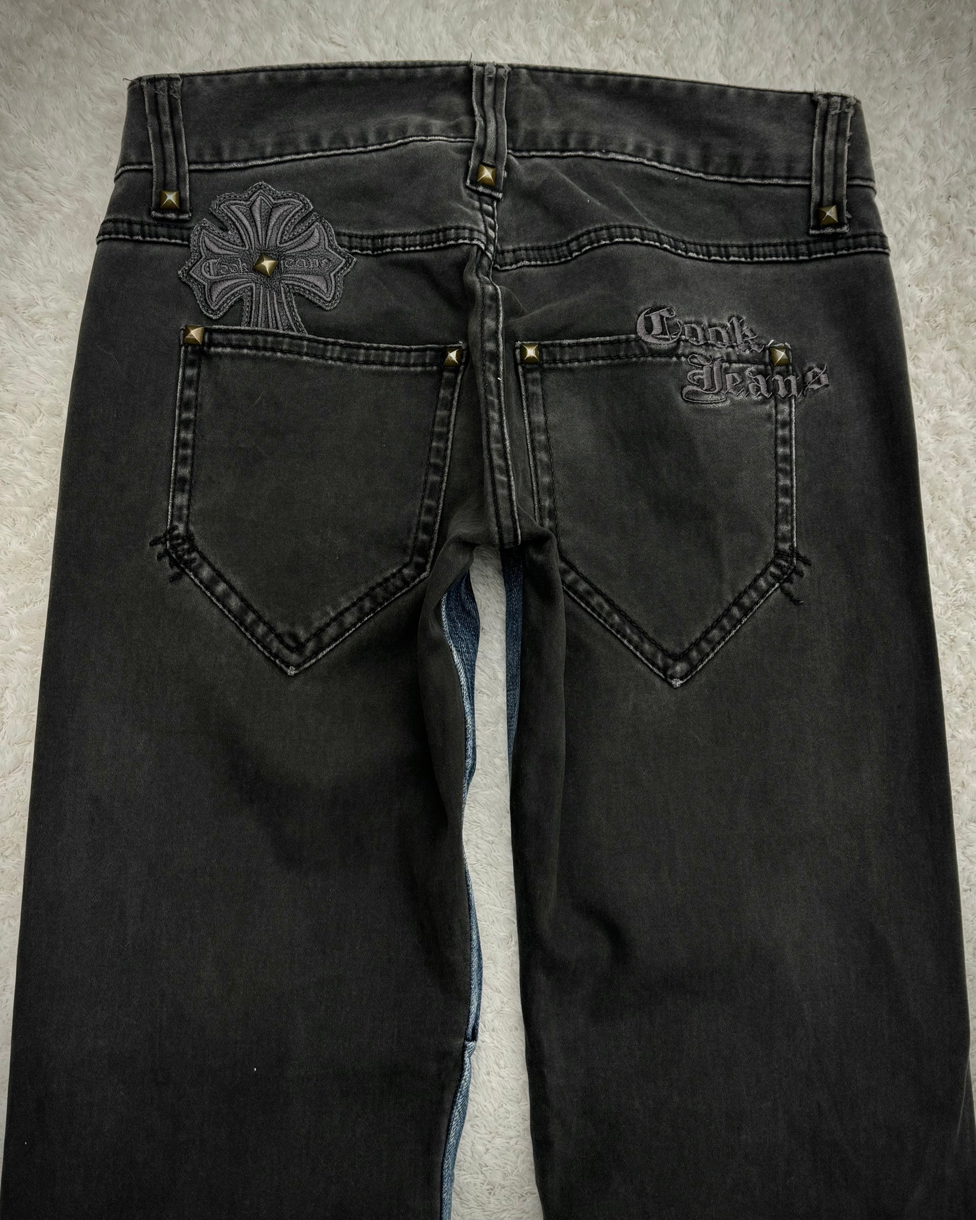 These split colored jeans from Japanese brand Cook Jeans feature a washed blue denim front with subtle distressing, while the back and waistband are made from lightly washed black cotton. The coin pocket is adorned with chunky pyramid studs, and the back pockets are decorated with a cross and branded embroidery.