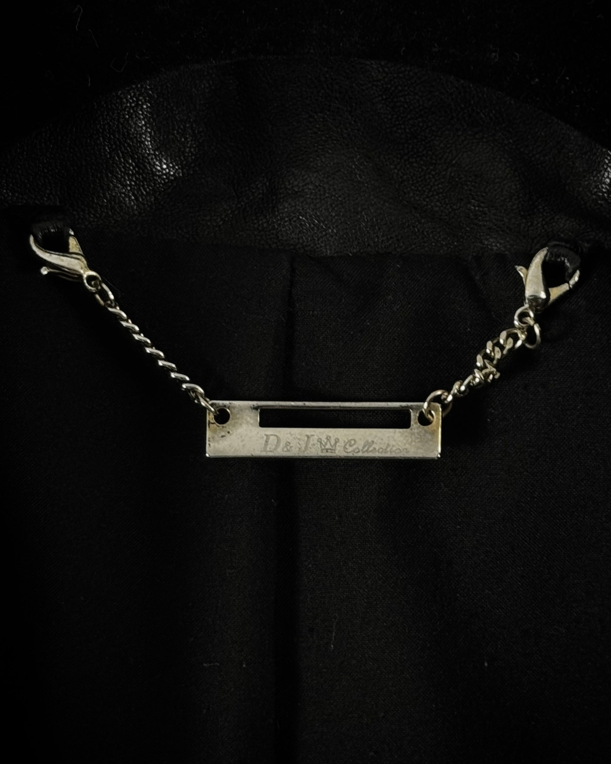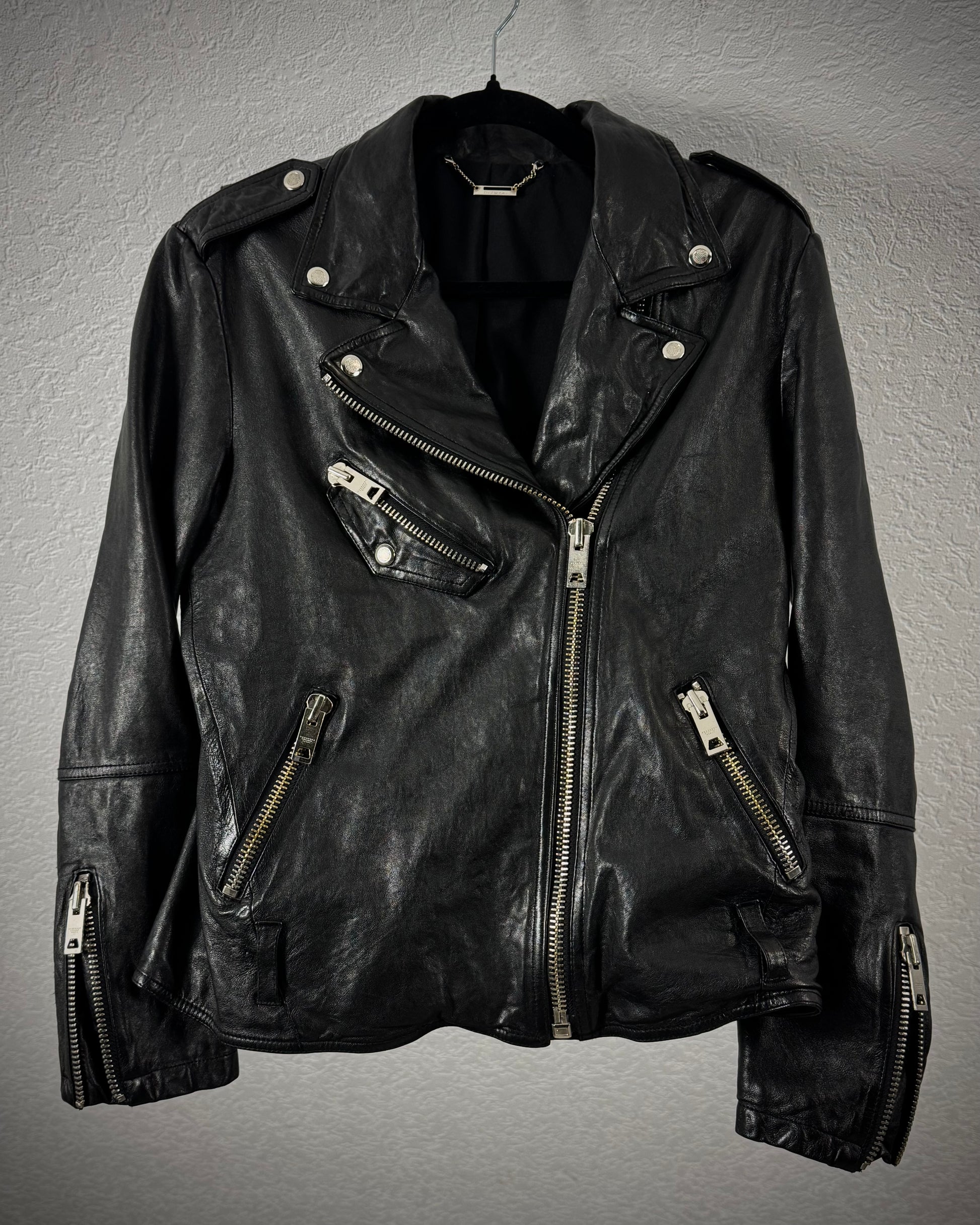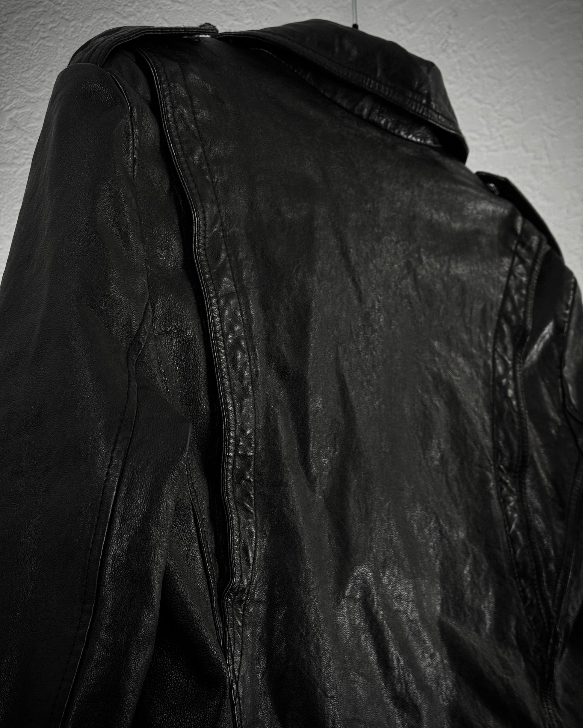 This biker jacket from D&J Collection is crafted from sheepskin leather imported from Italy to Korea. It features heavy, exposed hardware throughout the design and is constructed with a clean, structured finish.