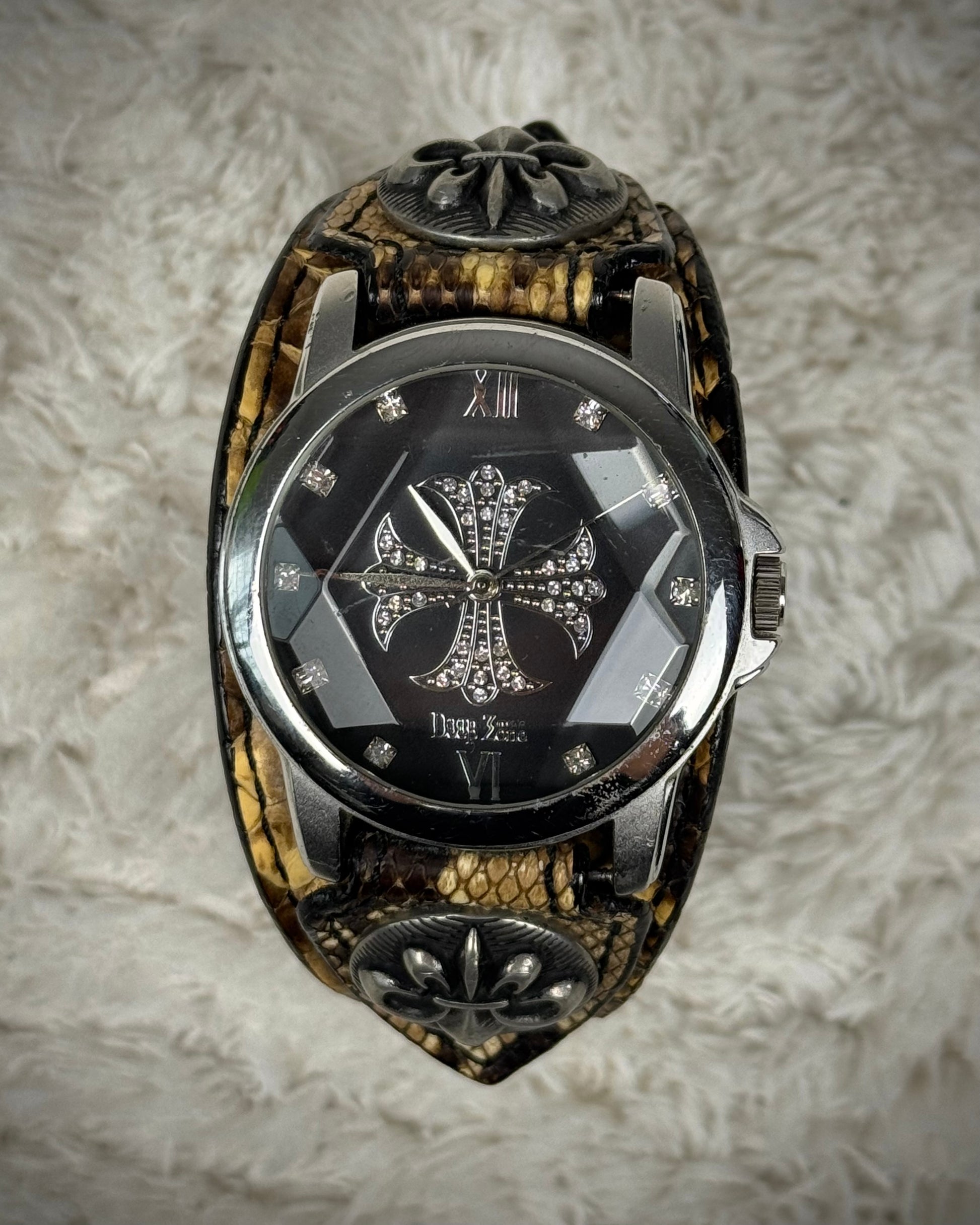 This watch from Japanese brand Deep Zone features a real python wrist band decorated with fleur-de-lis hardware. The prism-cut glass covers a dial that includes a cross motif and subtle crystal accents.
