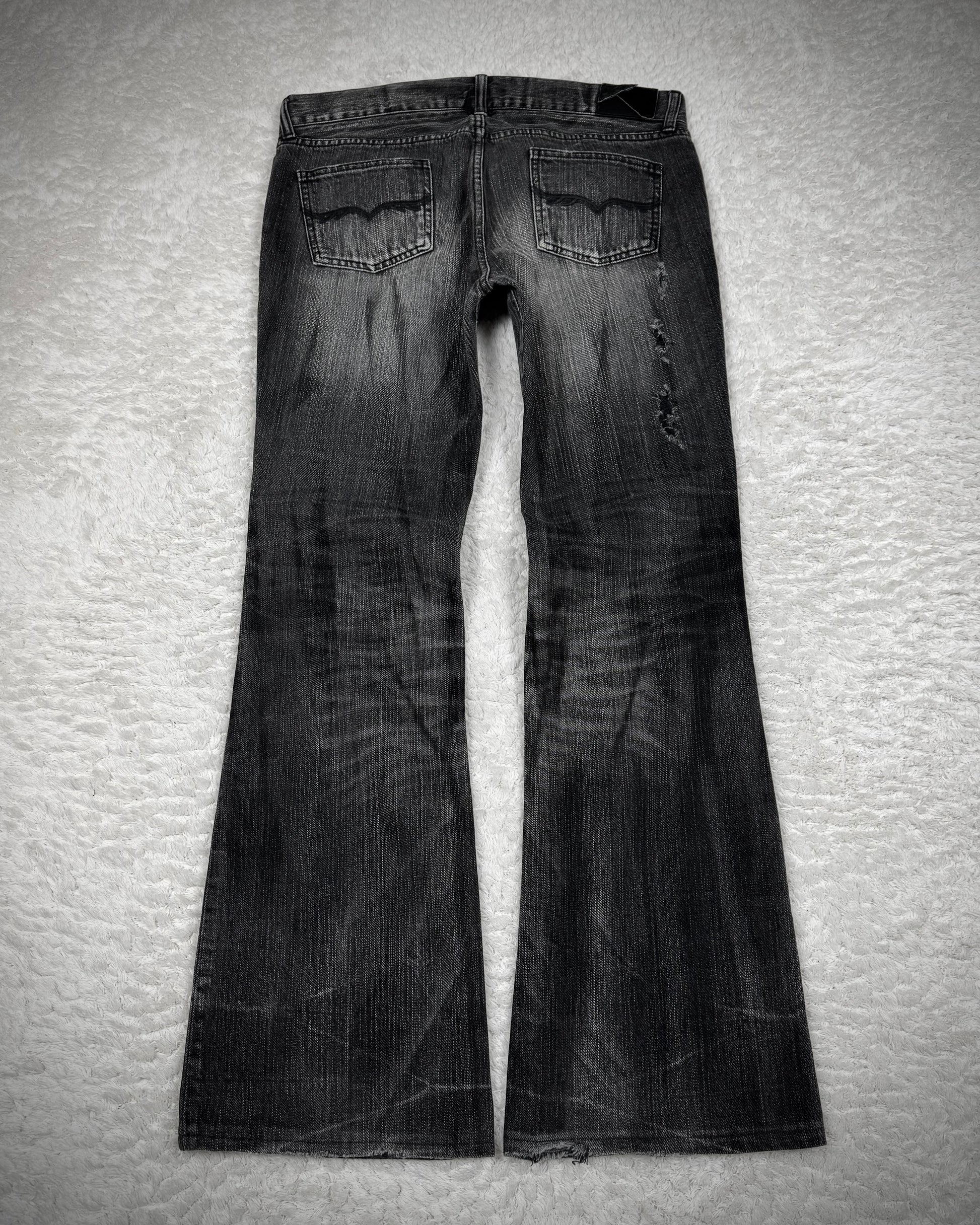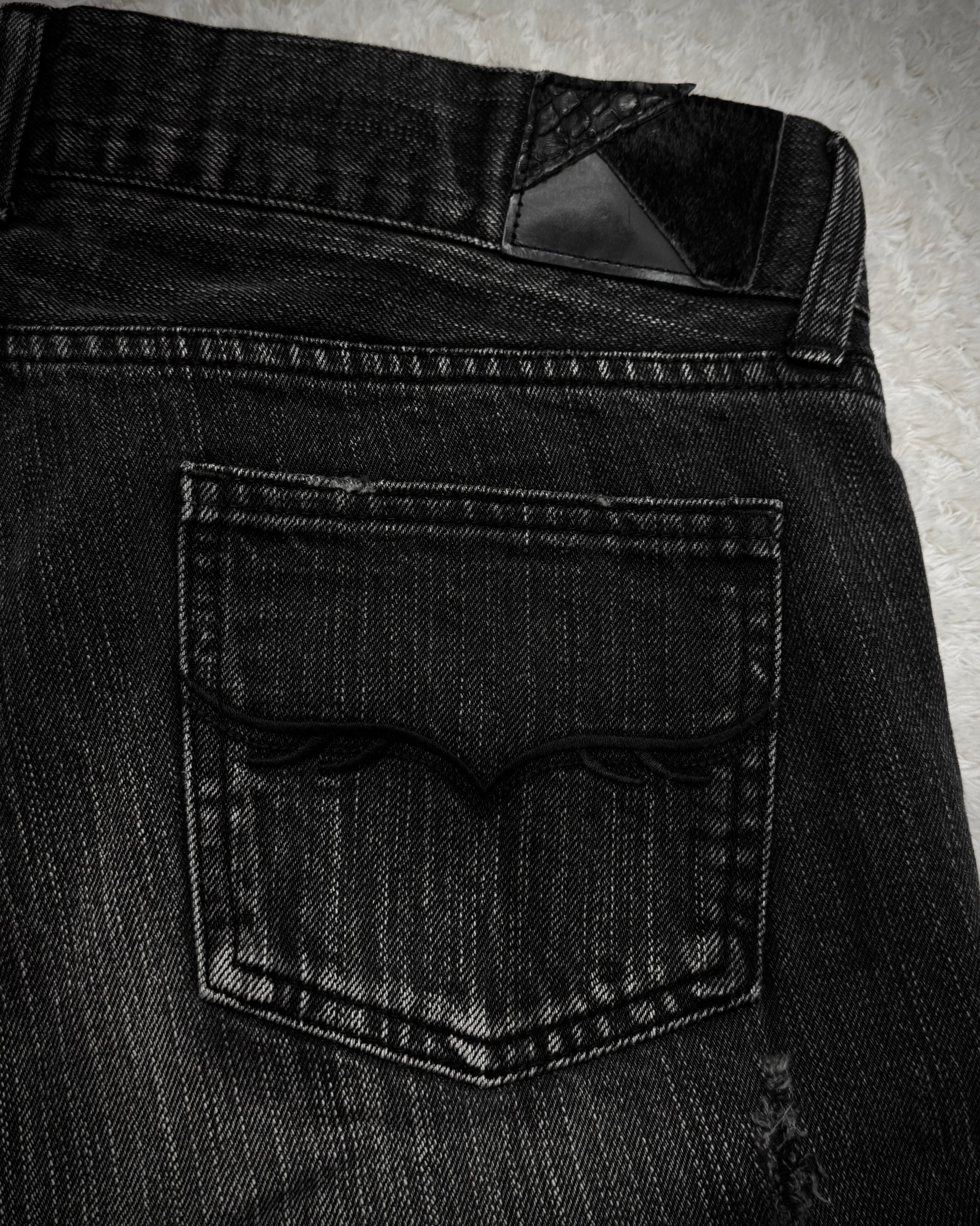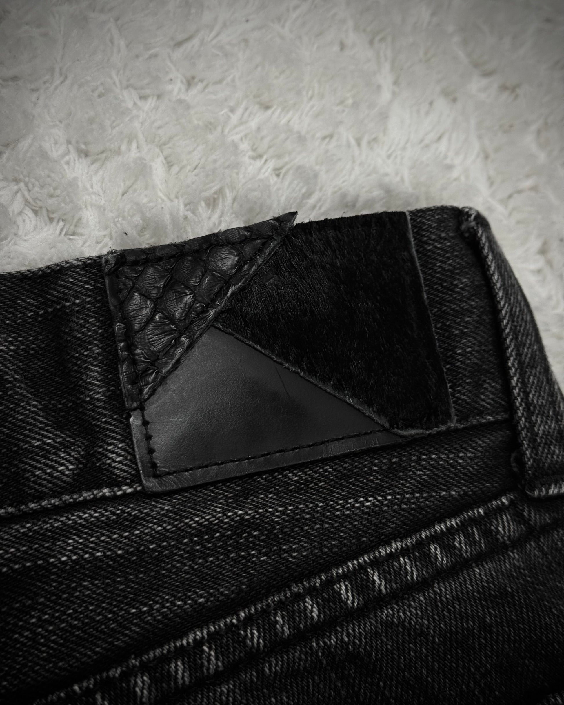 These flared jeans from Japanese brand Fuga feature a charcoal wash that creates a textured contrast. They include distressed areas, the brand’s signature embroidery on the back pockets, and a tag made from snakeskin, horsehair, and leather.
