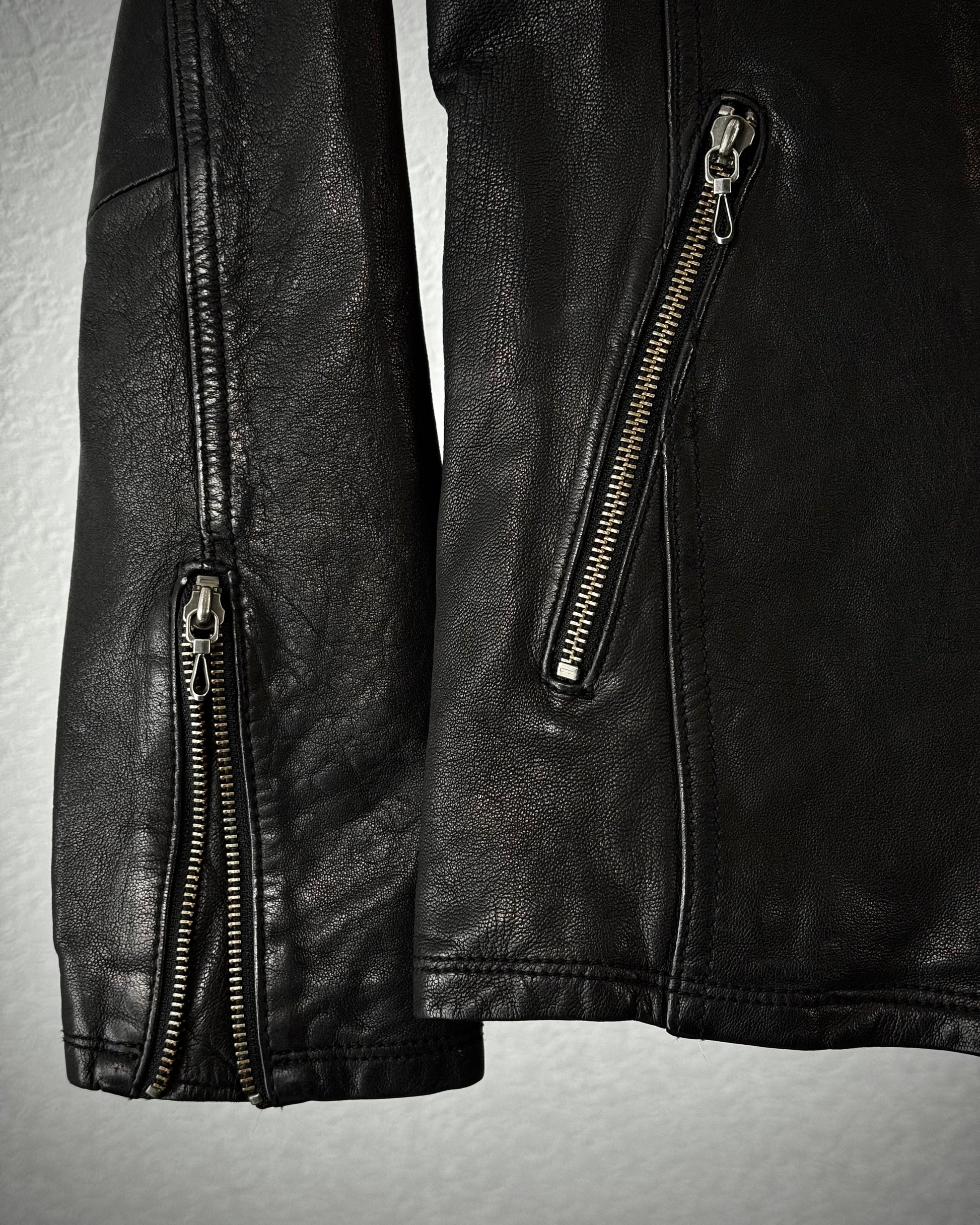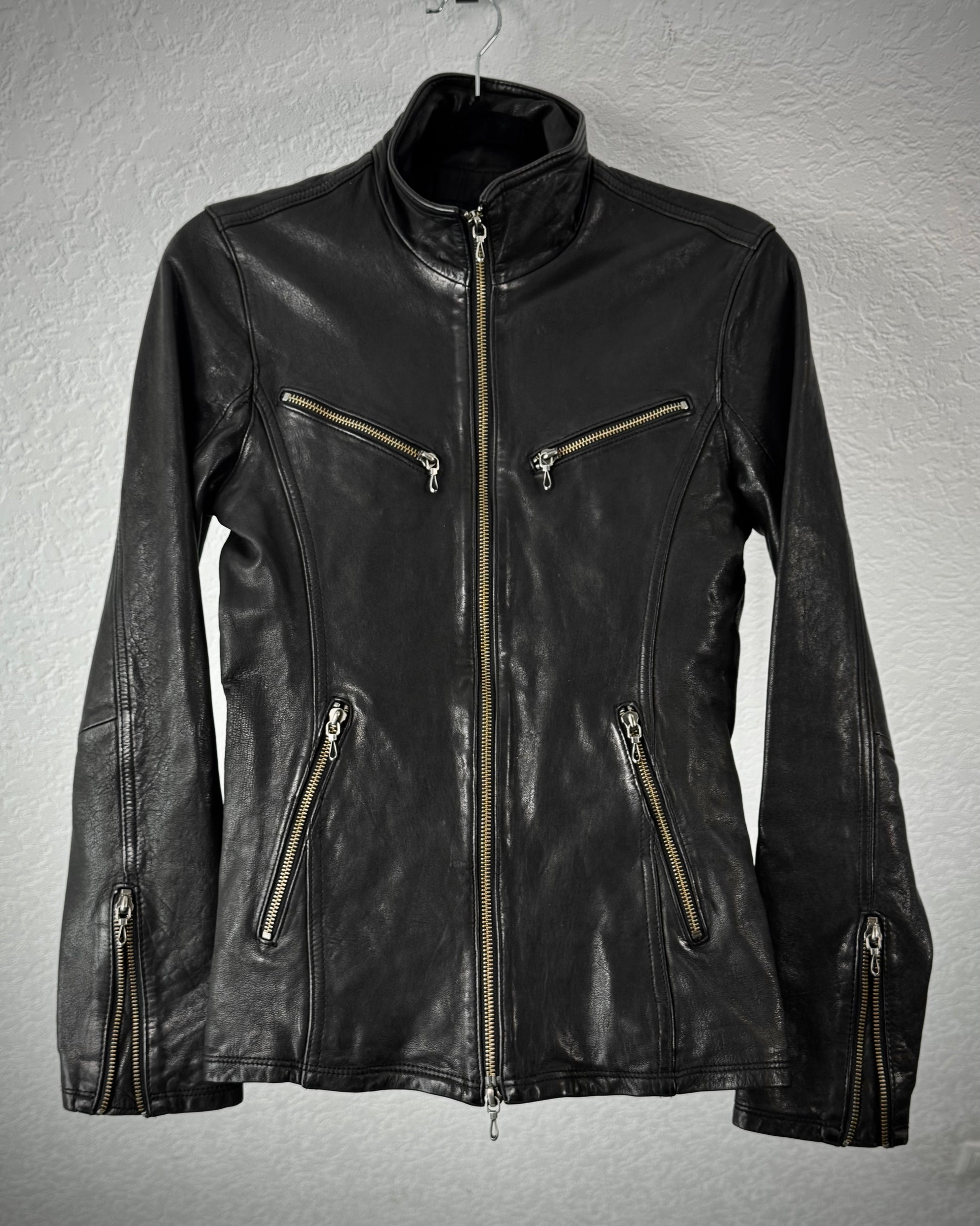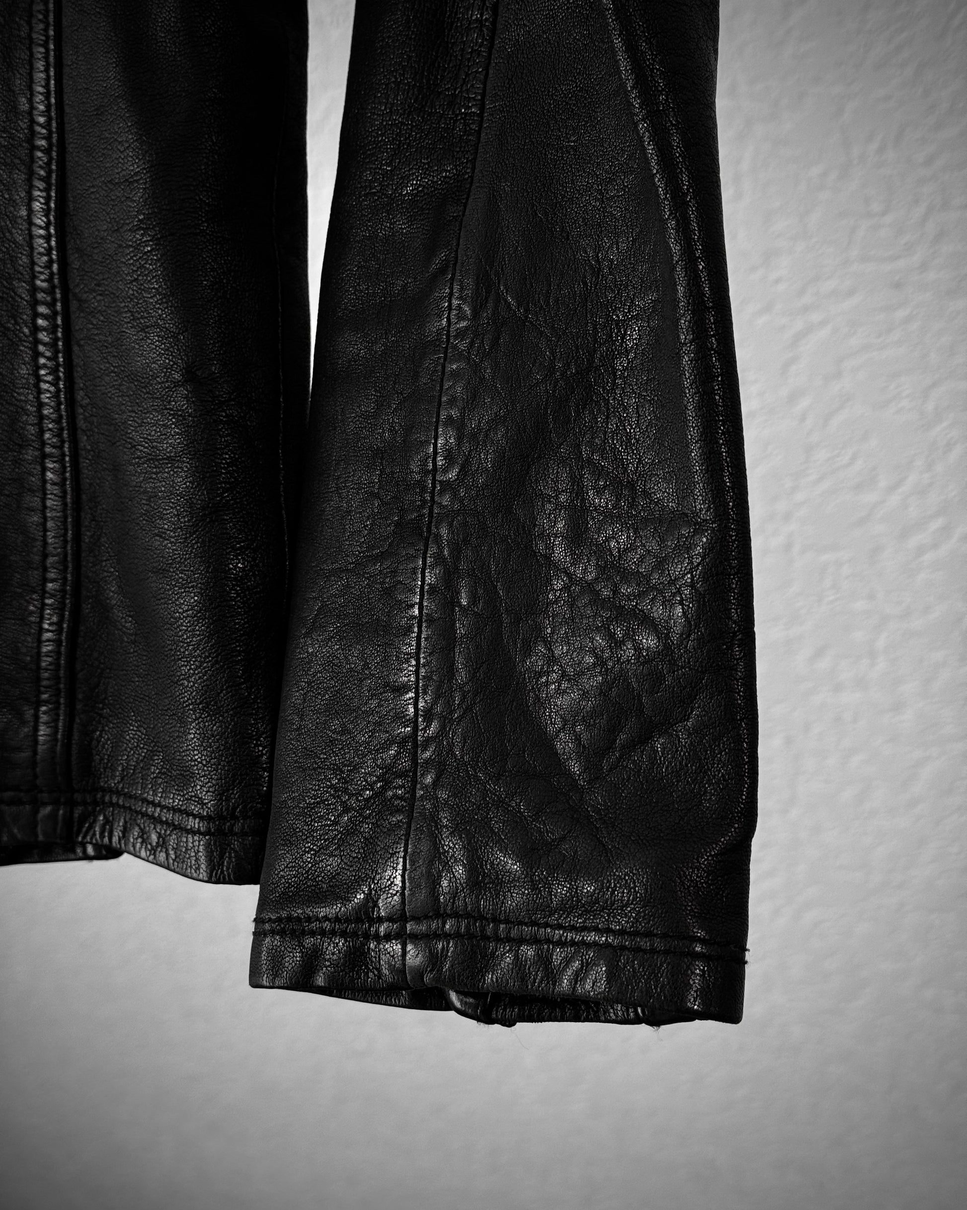 This leather jacket from Japanese brand Fuga is crafted from textured sheepskin leather and features a clean, structured execution. It has a high neck collar and includes multiple zippers, including cuff zippers that allow the cuffs to be flared if preferred.