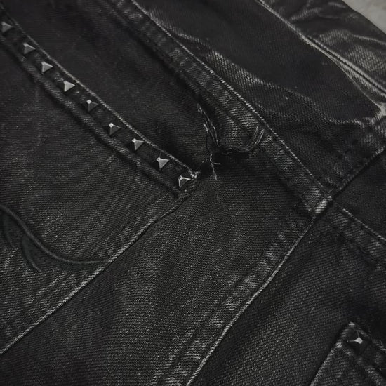 These flared jeans from Japanese brand Fuga feature skull embossing on the thigh and a whisker wash throughout. They include distressed areas with intentional heel bite, along with studded back pockets finished with the brand’s signature embroidery.