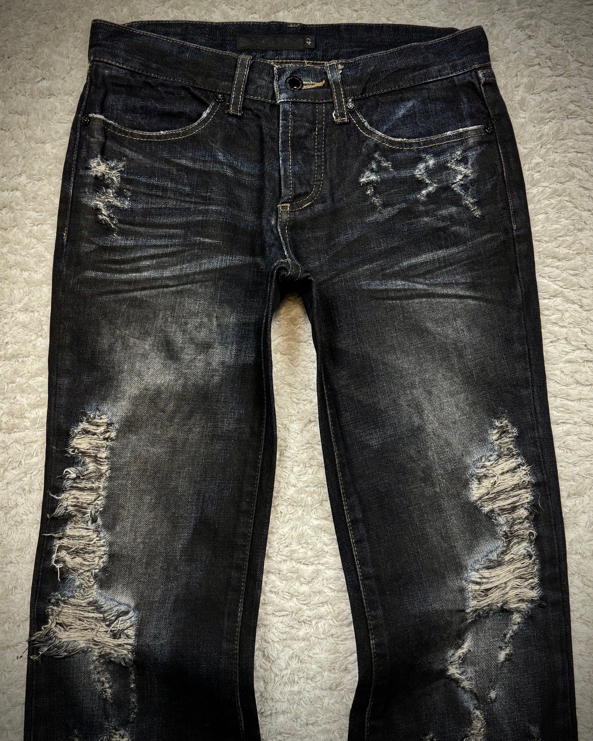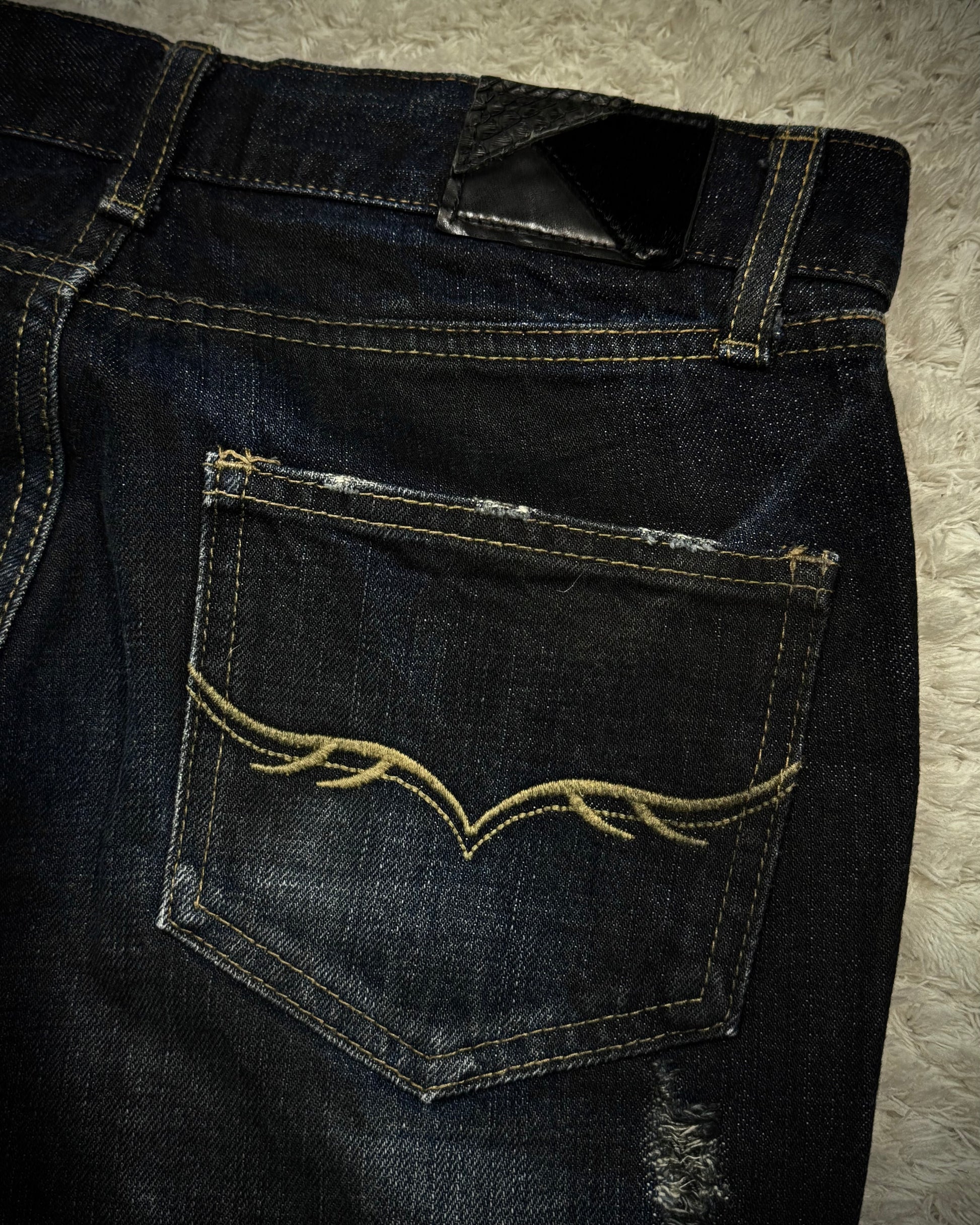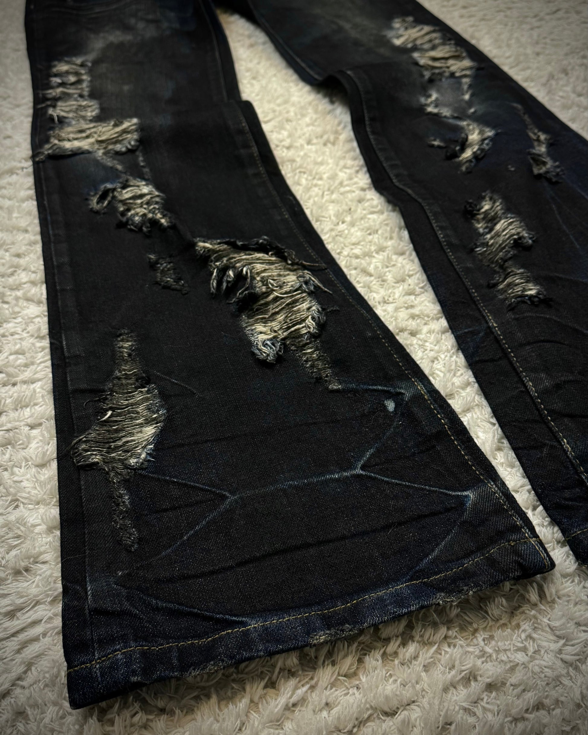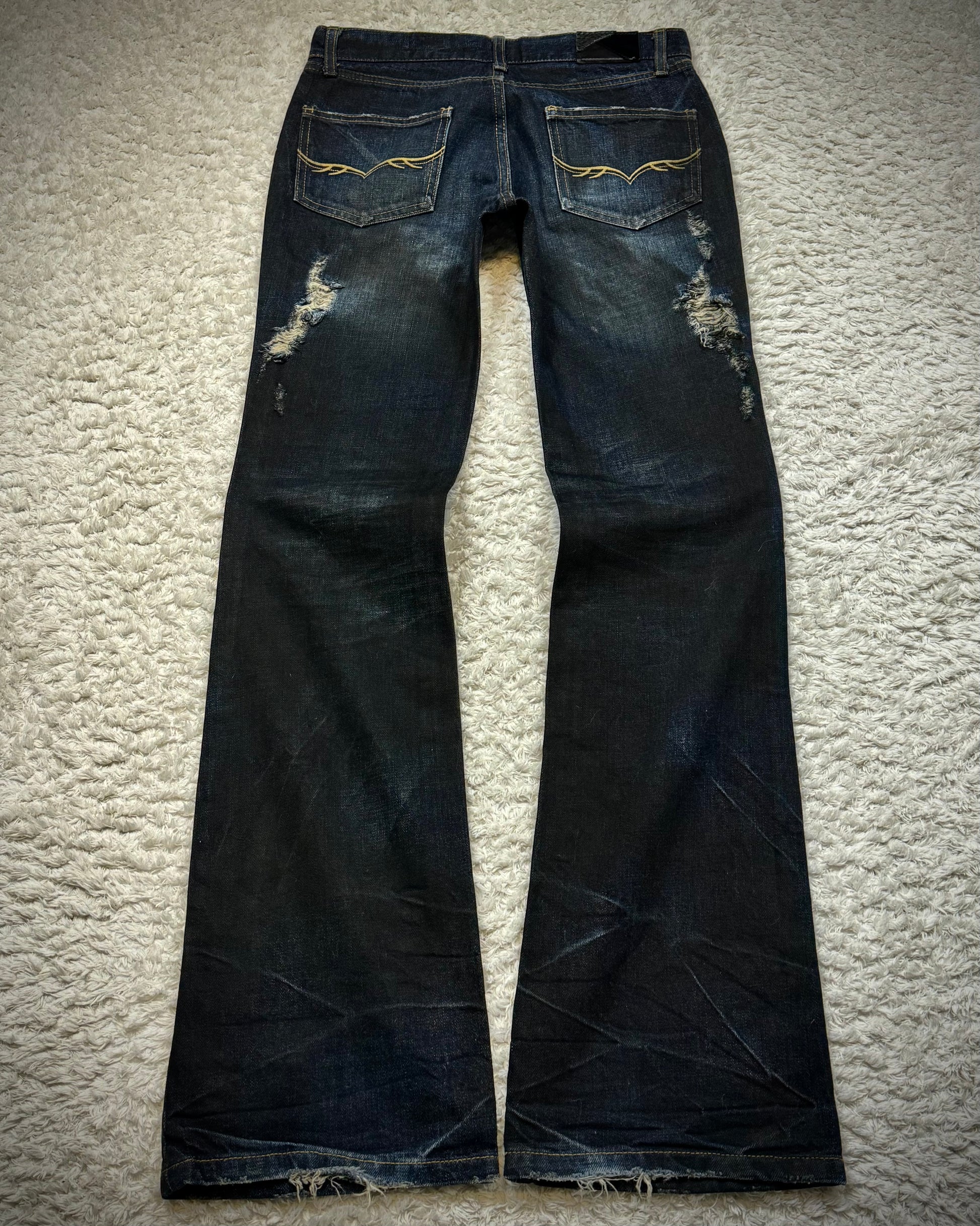 These bootcut jeans from Japanese brand Fuga feature dark clawmark washing applied to a textured denim base. They include distressed areas with added surface texture, honeycomb wash lines at the hems, and the brand’s signature embroidery on the back pockets.