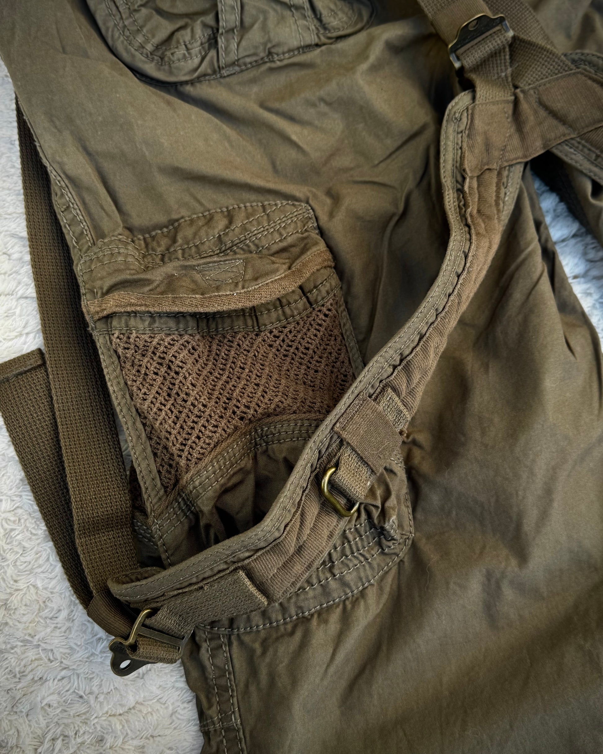 These flared suspender cargo pants from Japanese brand G.O.A are an iconic model of the brand. They come in earthy colors and feature detachable suspenders. The design includes various cargo pockets, including net pockets, along with an elastic ribbed waistband.