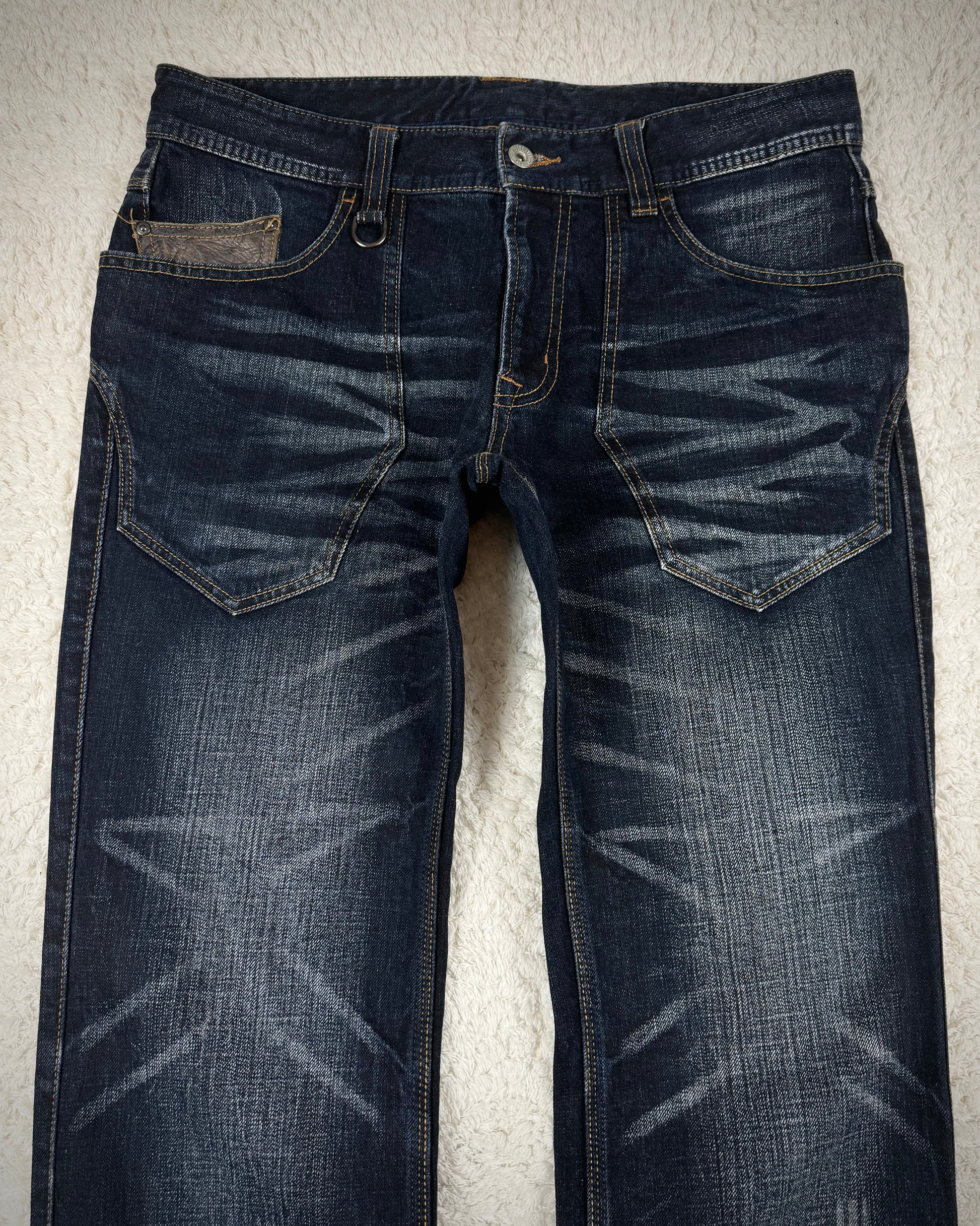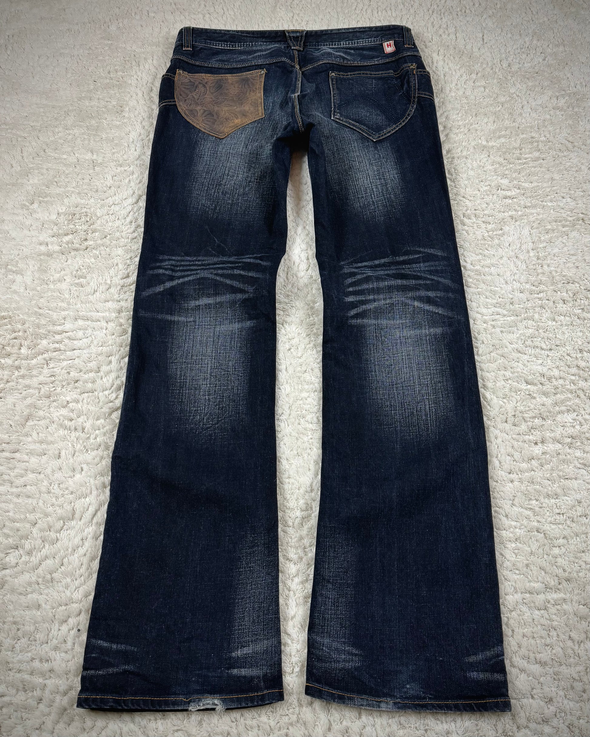 These bootcut jeans from Japanese brand Hide Aways feature a vintage floral pattern leather design on the left back pocket and coin pocket. They are constructed with unique paneling and finished with a whisker wash.