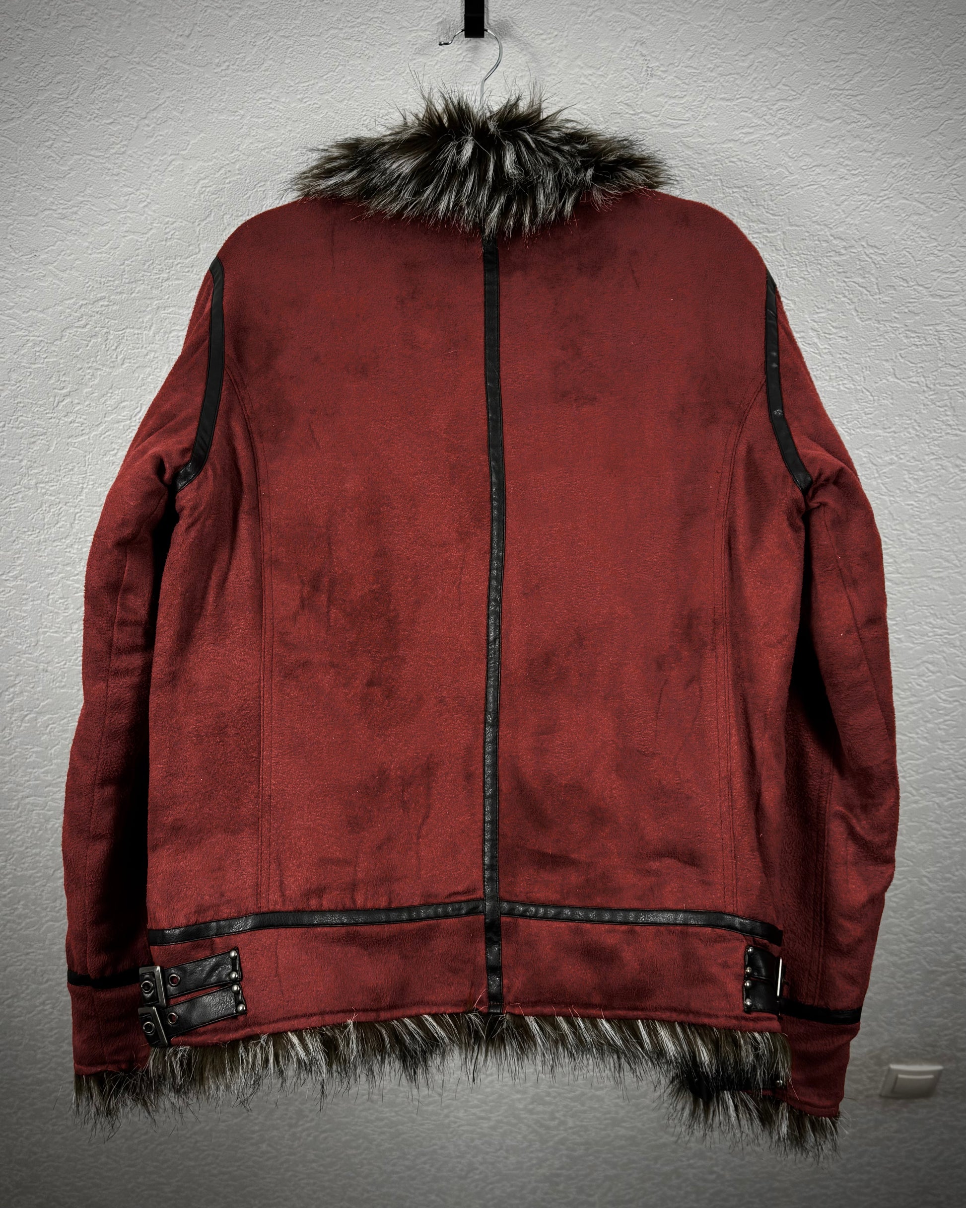 This jacket from Japanese brand In The Attic features a faux fur collar with additional interior fur detailing. It comes in a bloody crimson color accented by black faux leather elements and includes belted cuffs and belted sides at the waist. The jacket comes with the original tags.