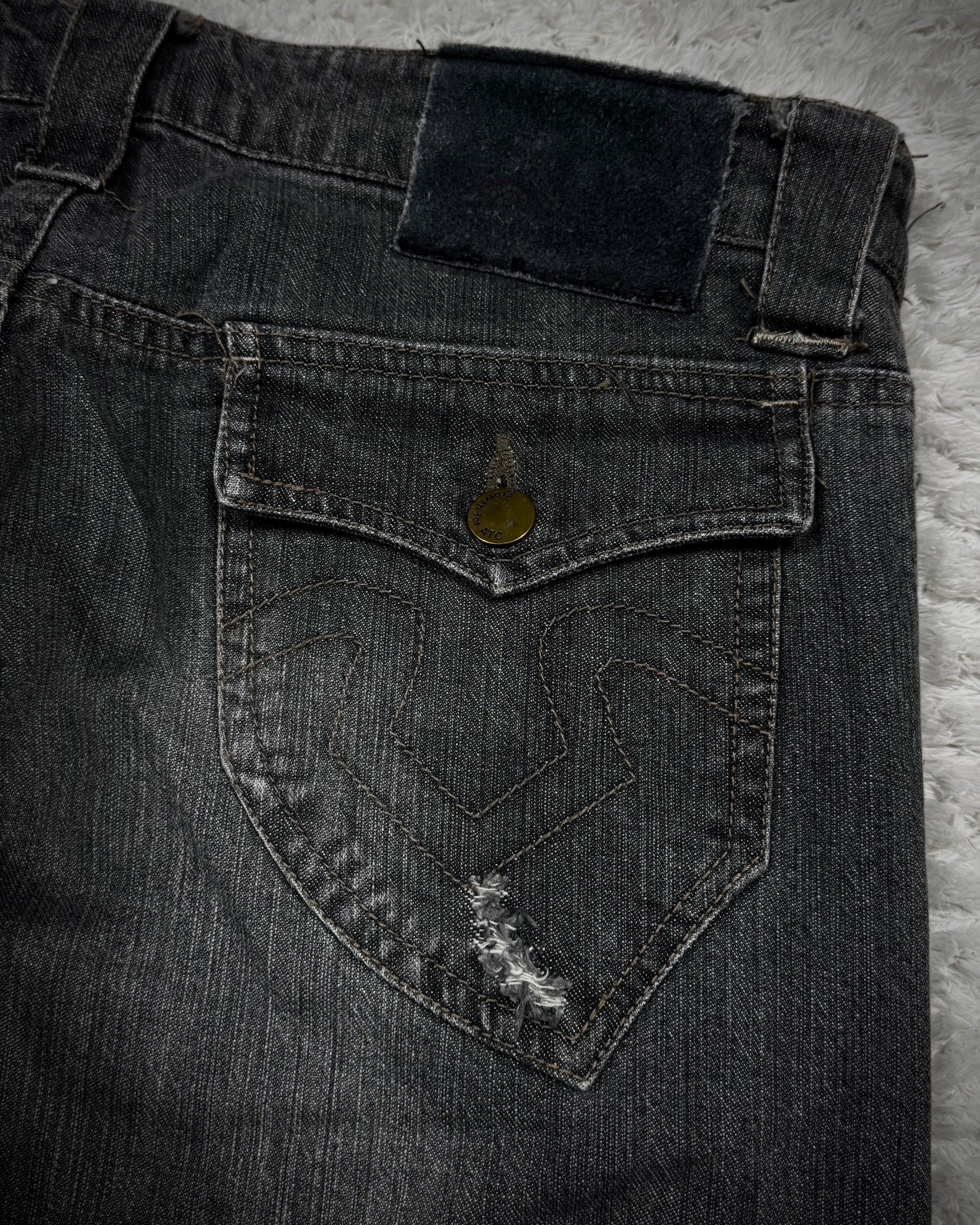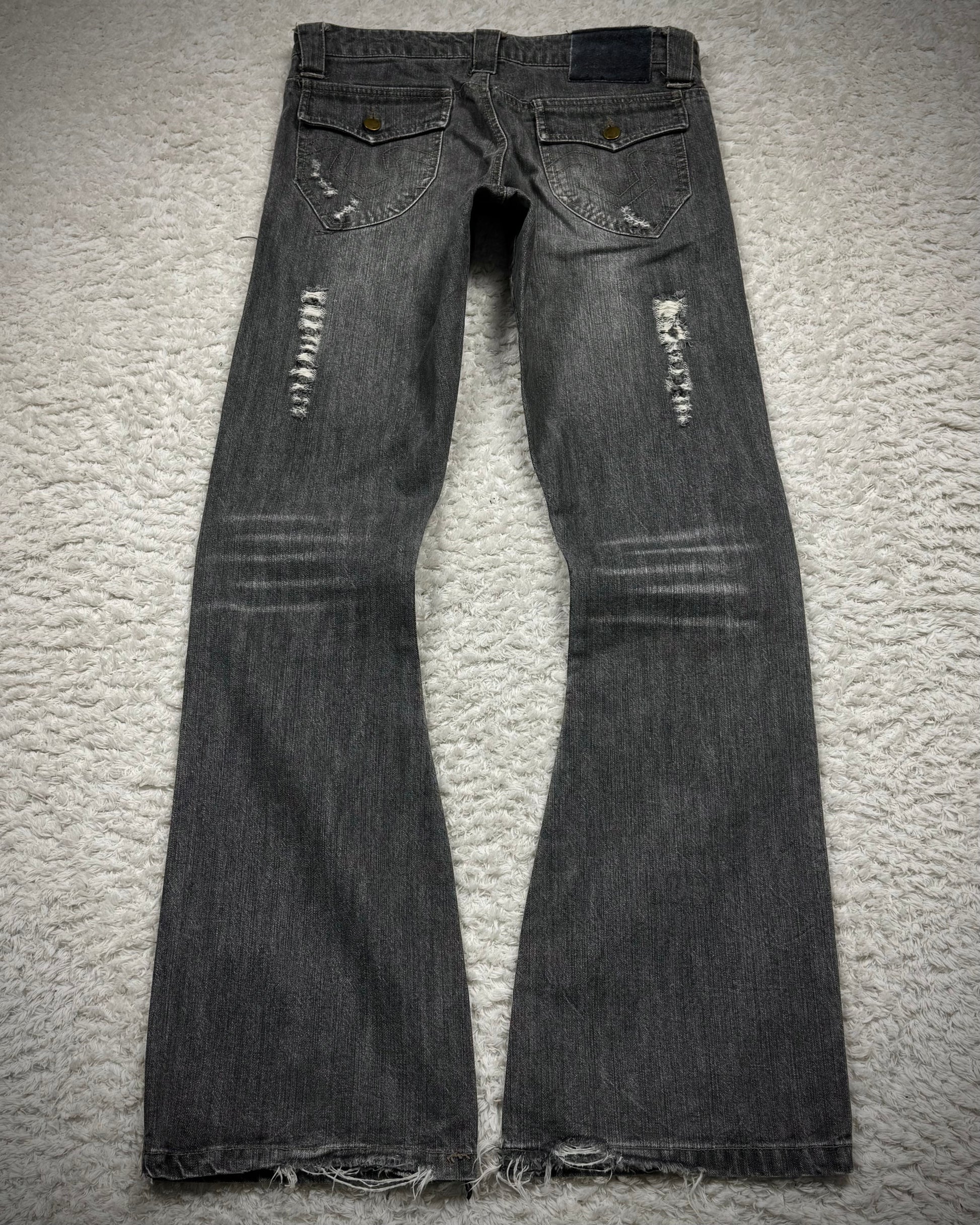 These flared jeans from Japanese brand In The Attic feature a whisker wash and a J-cut flared silhouette. They include subtle distressing, a frayed outseam, and flap back pockets.