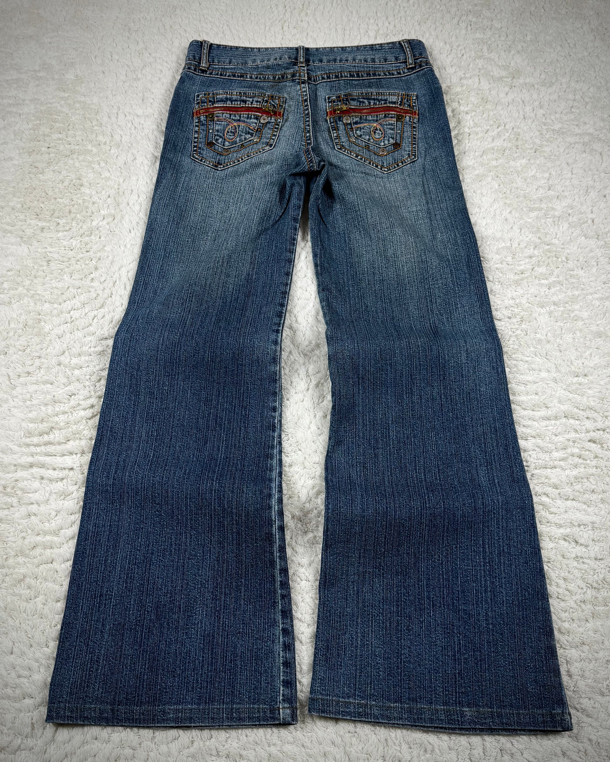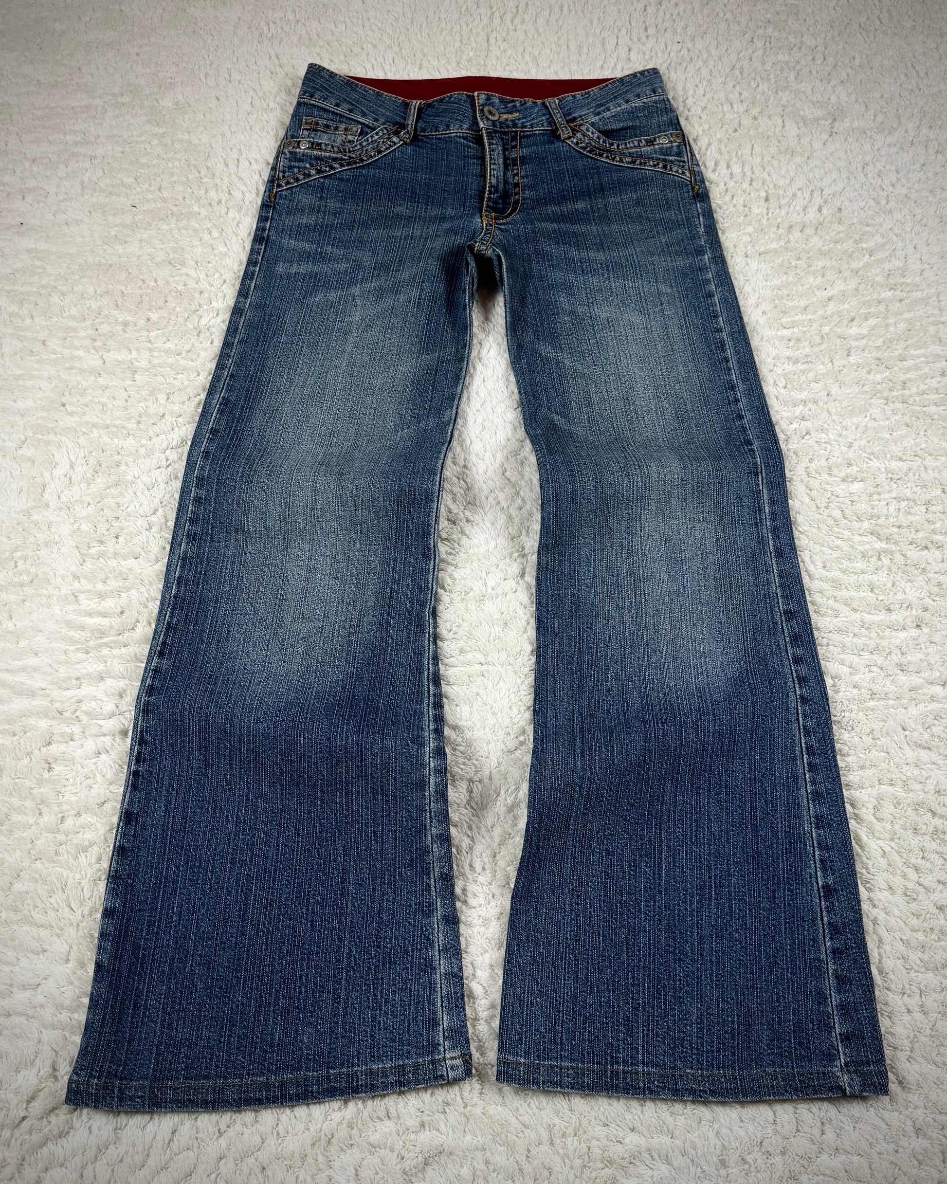 These flared jeans feature a unique pocket design and a vintage aesthetic.