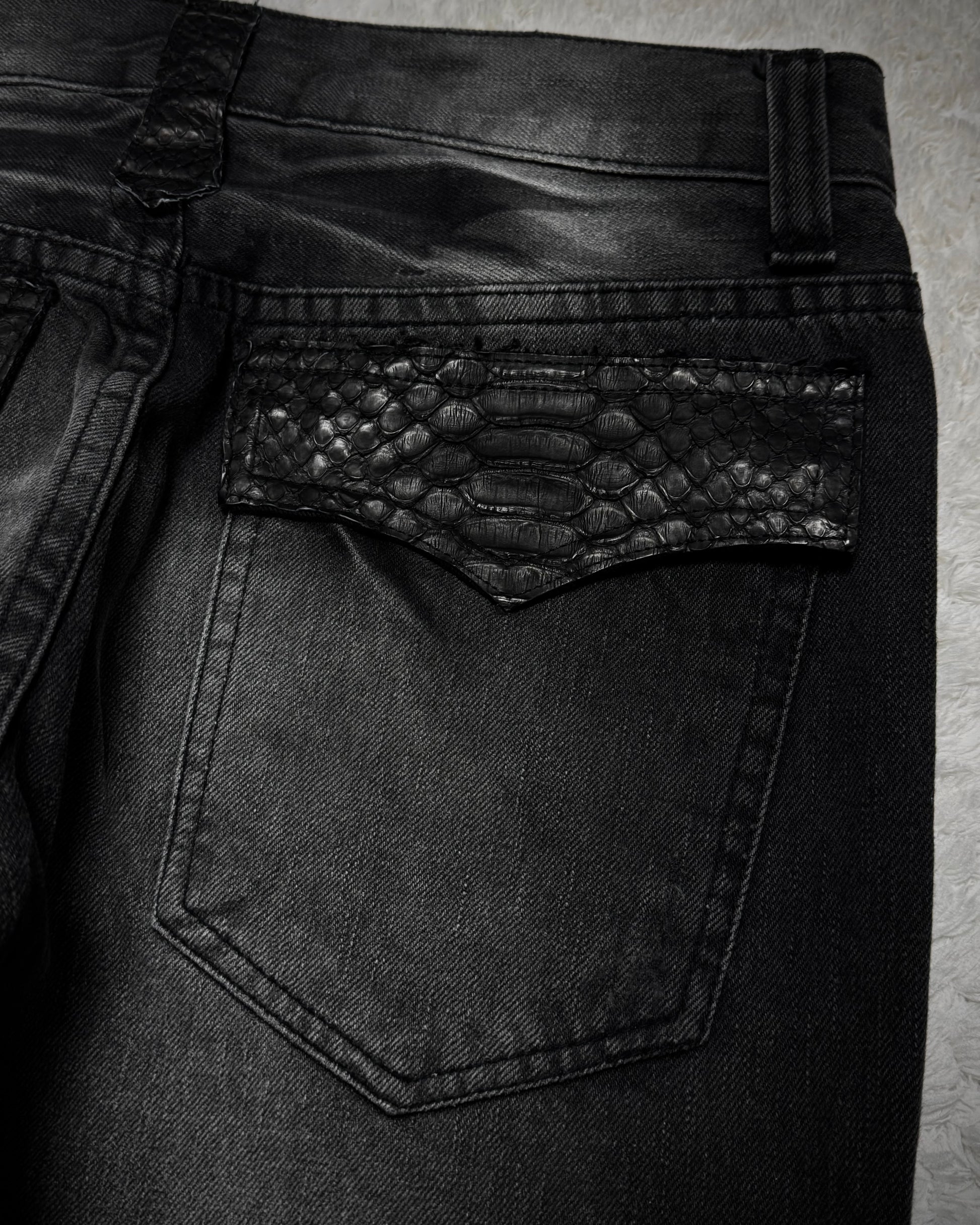 These flared jeans from Japanese brand K.U.I feature python flaps on the back pockets, python belt loops, and a python-detailed coin pocket. They include various hardware elements such as piercings, chains, and a snake charm, along with lace-up panels.