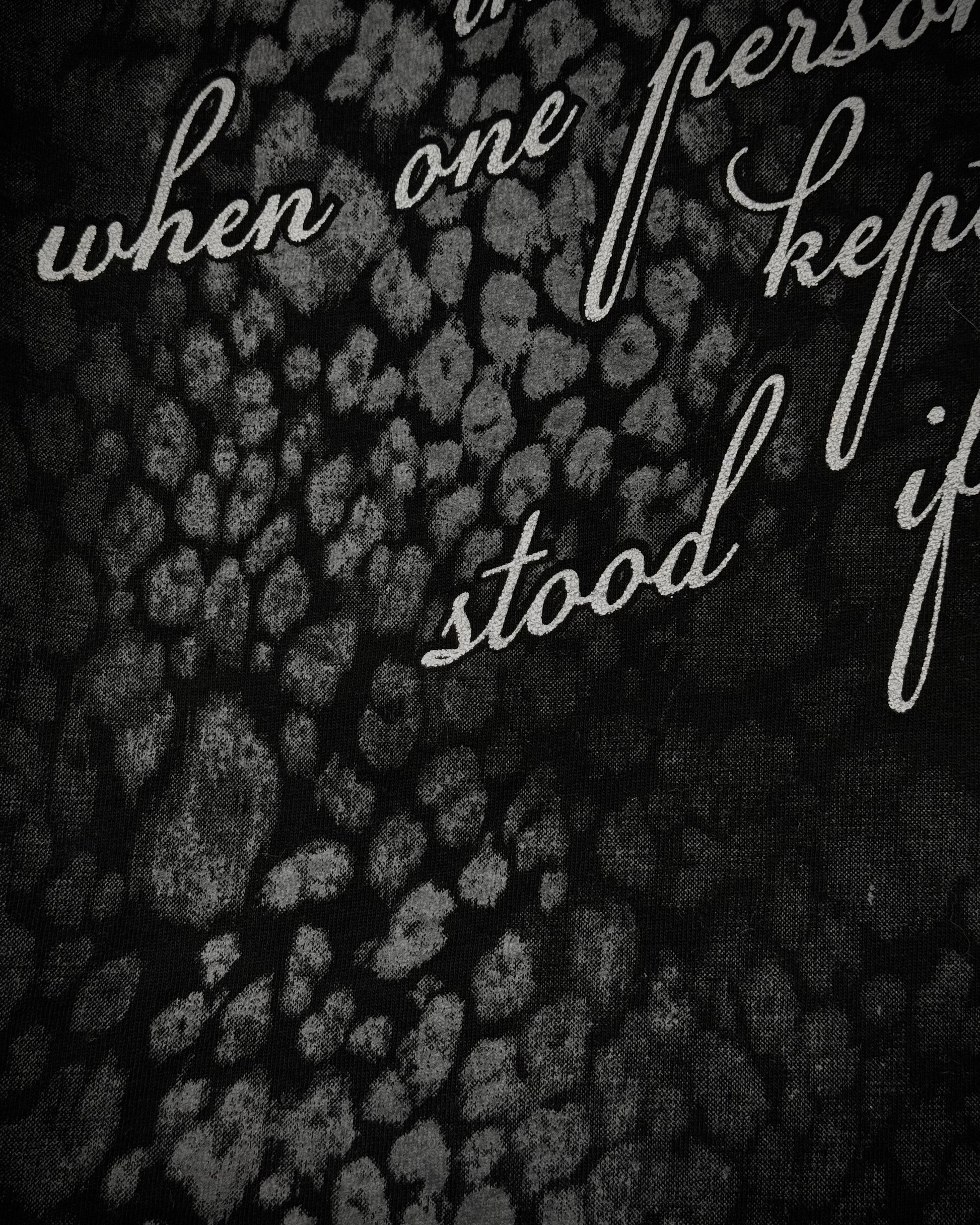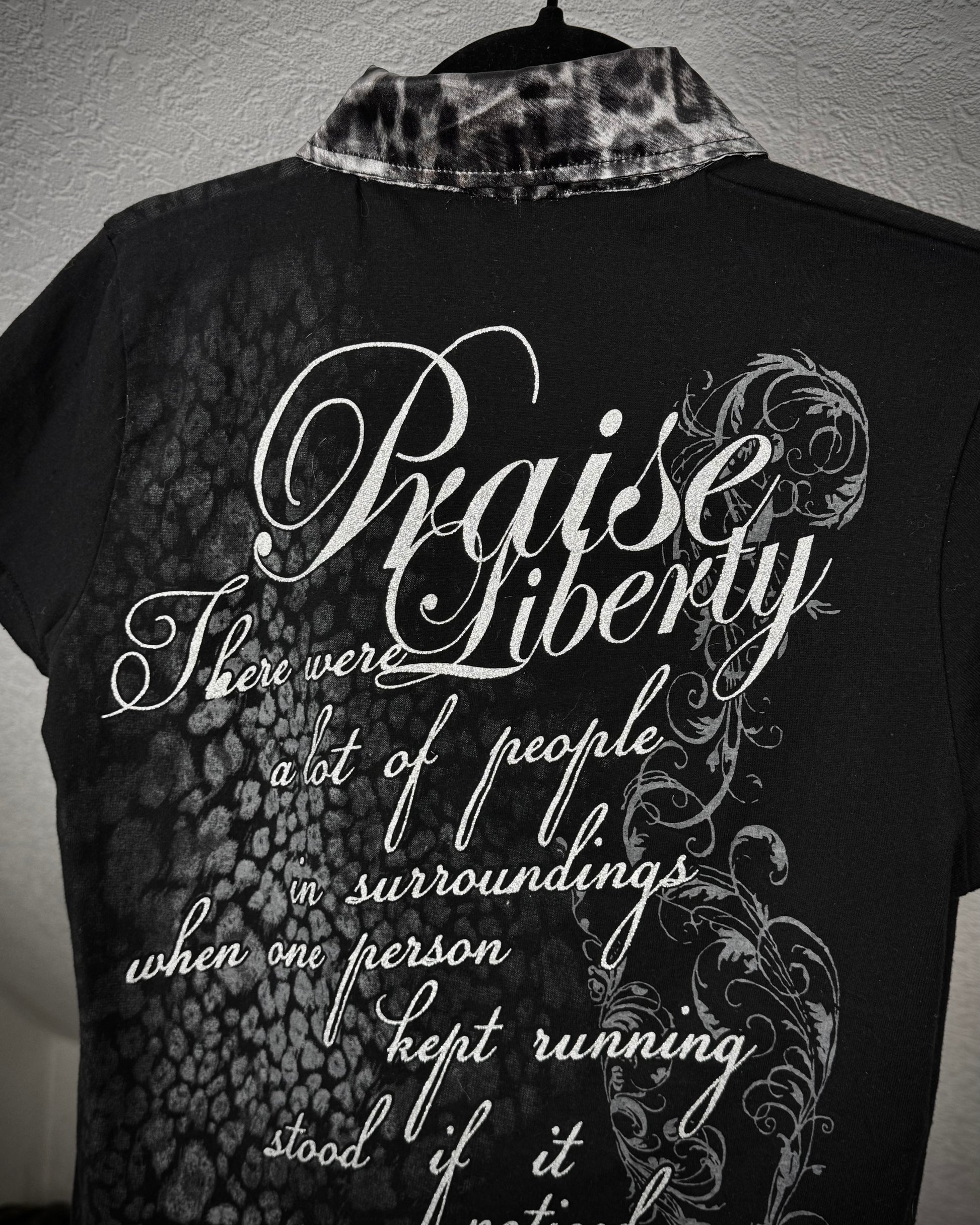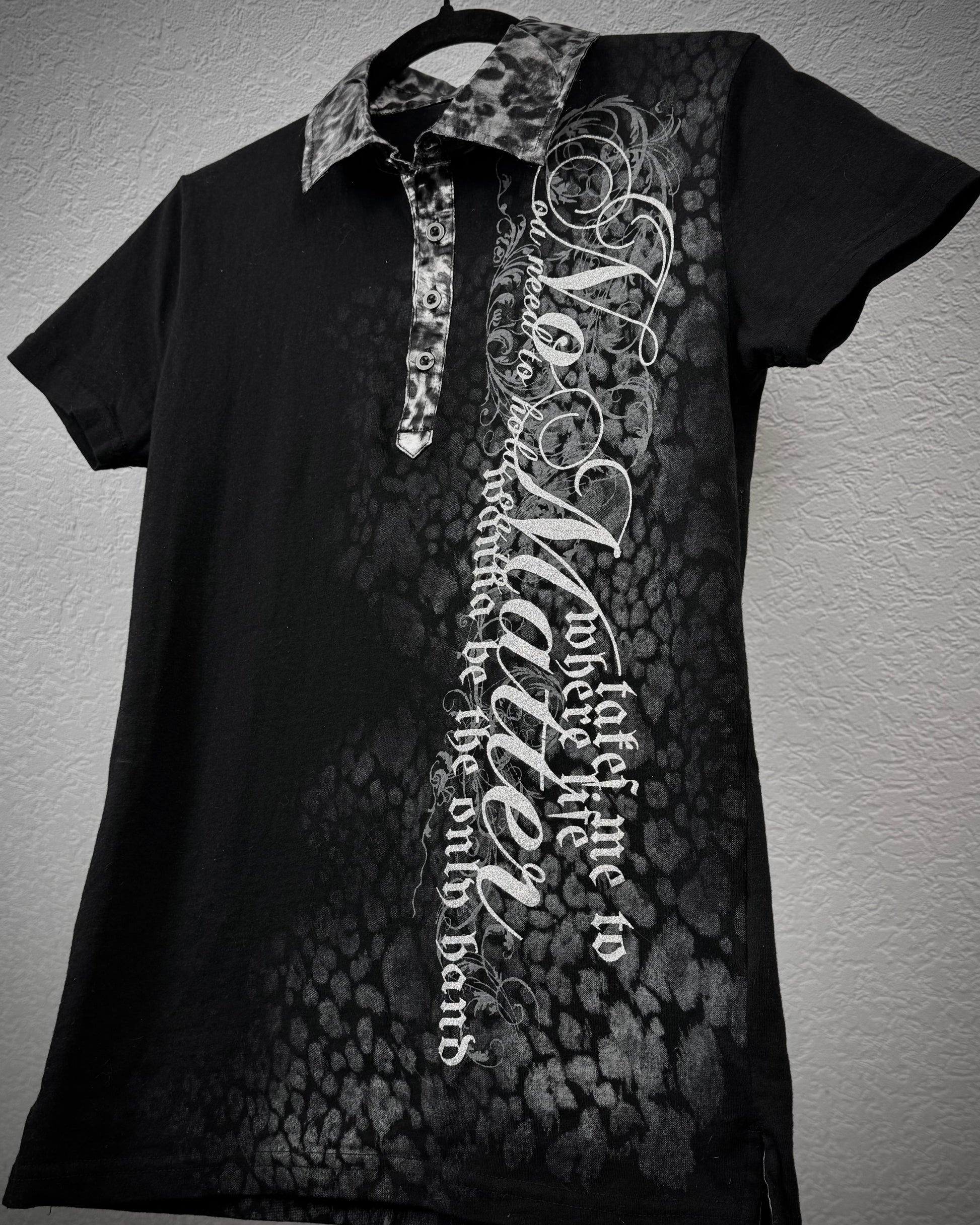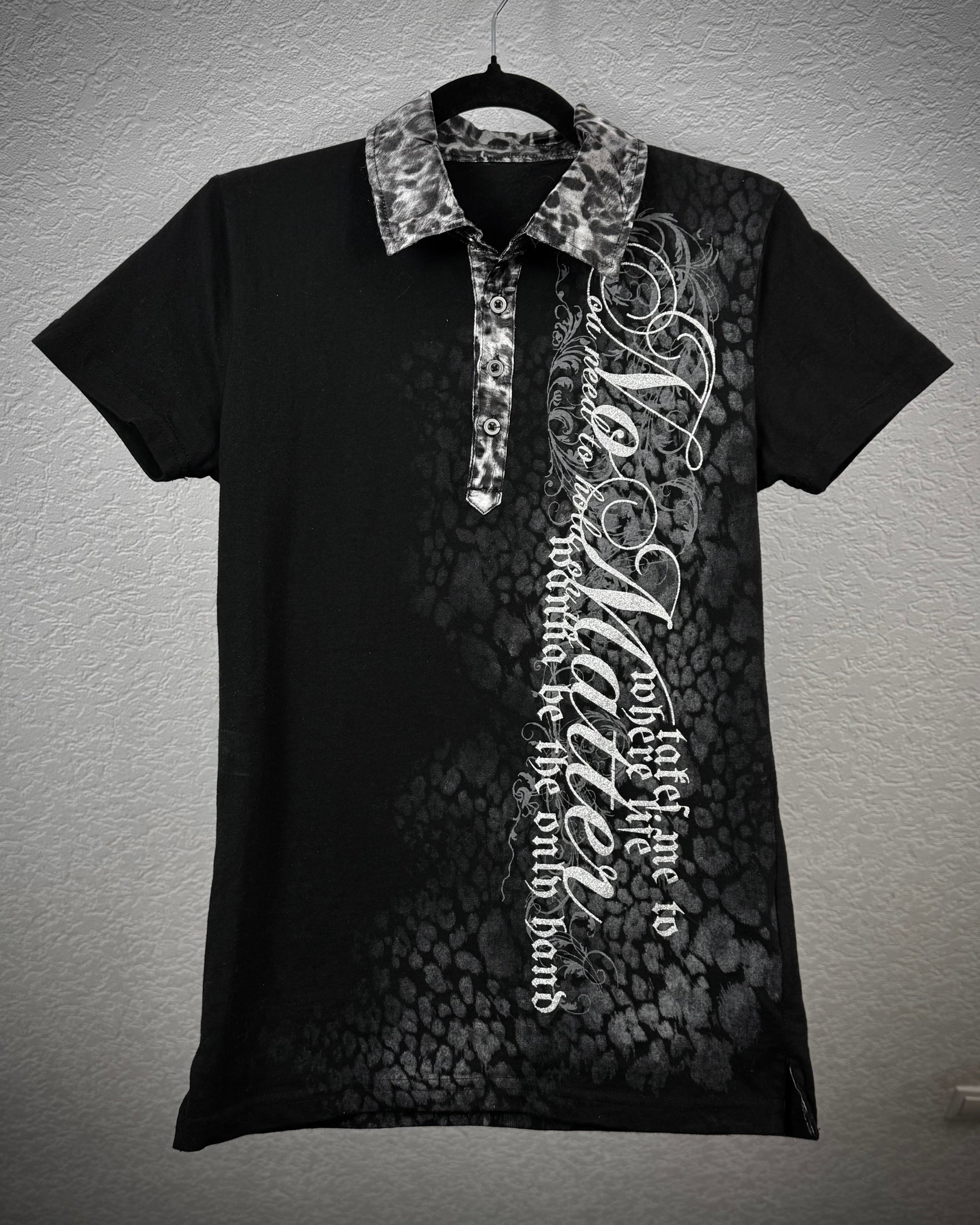 This polo shirt features a leopard pattern collar and a graphic that combines leopard prints with poem text that has a subtle shimmer.