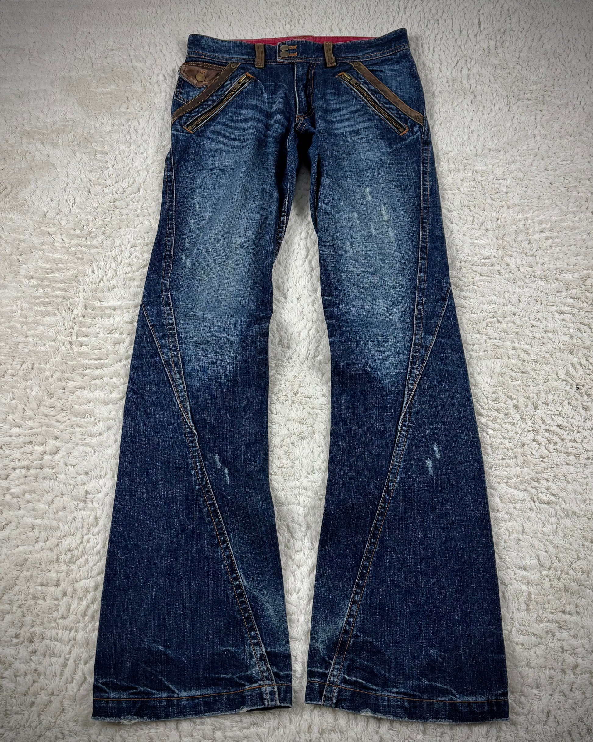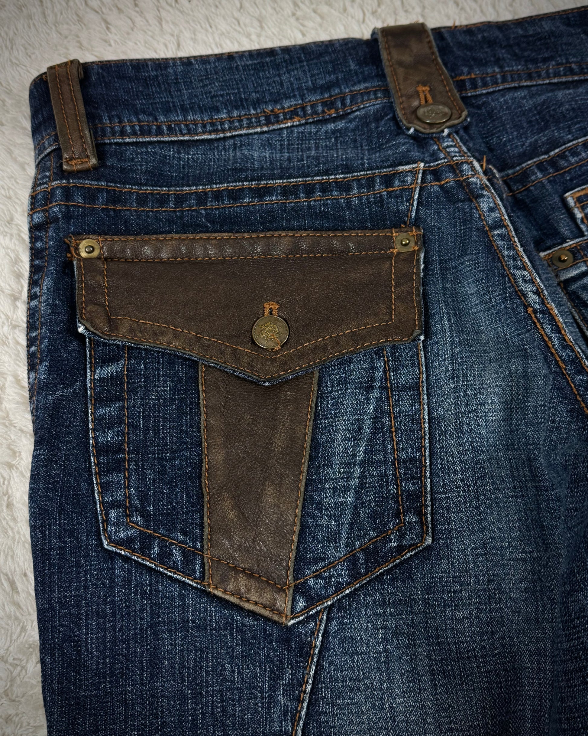These spiral cut flared jeans from Japanese brand Michel Klein feature leather accents adorning the pockets and a whiskered wash. The overall design carries a distinct vintage aesthetic.