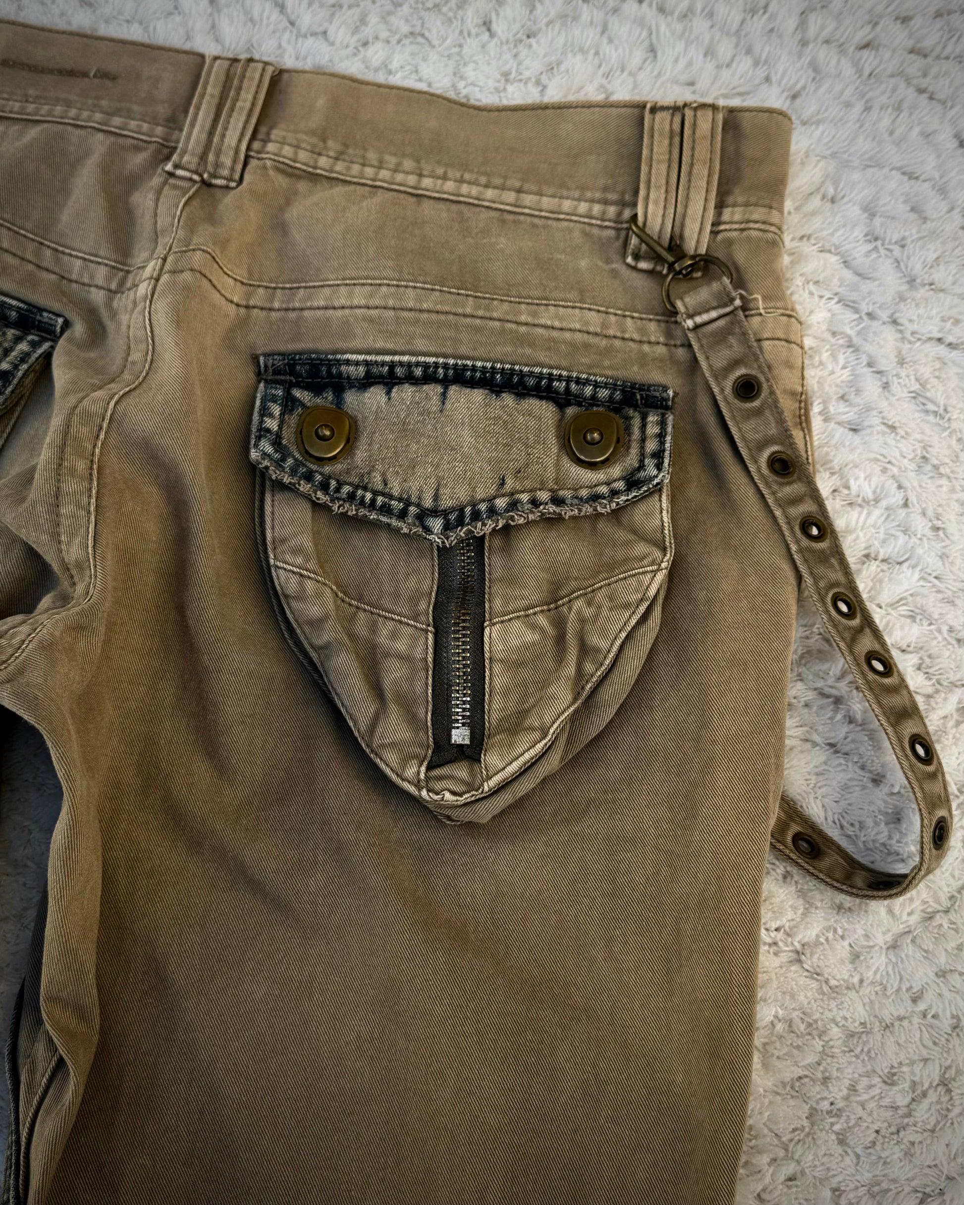 These flared pants from Japanese brand Midas feature two distressed and heavily washed-out denim panels for aesthetics. They include various pockets such as 3D gas mask flap pockets and zippered pockets. An eyeletted detachable strap attachment adds to the construction. The pants come in a washed beige tone.
