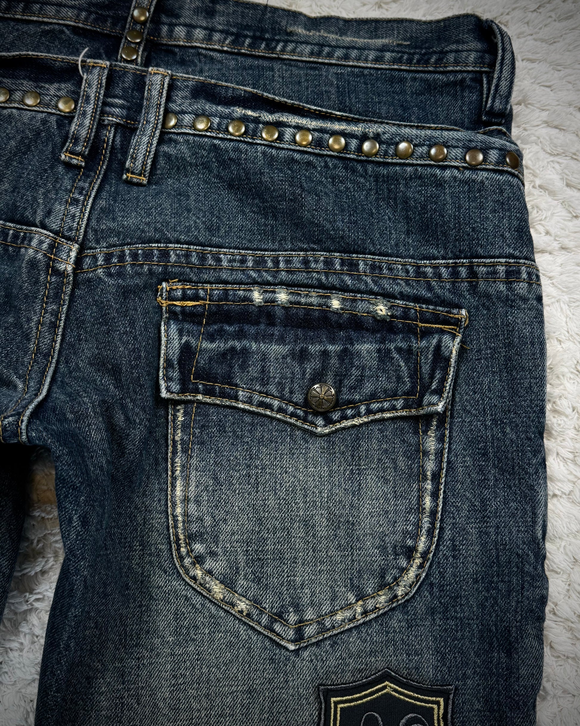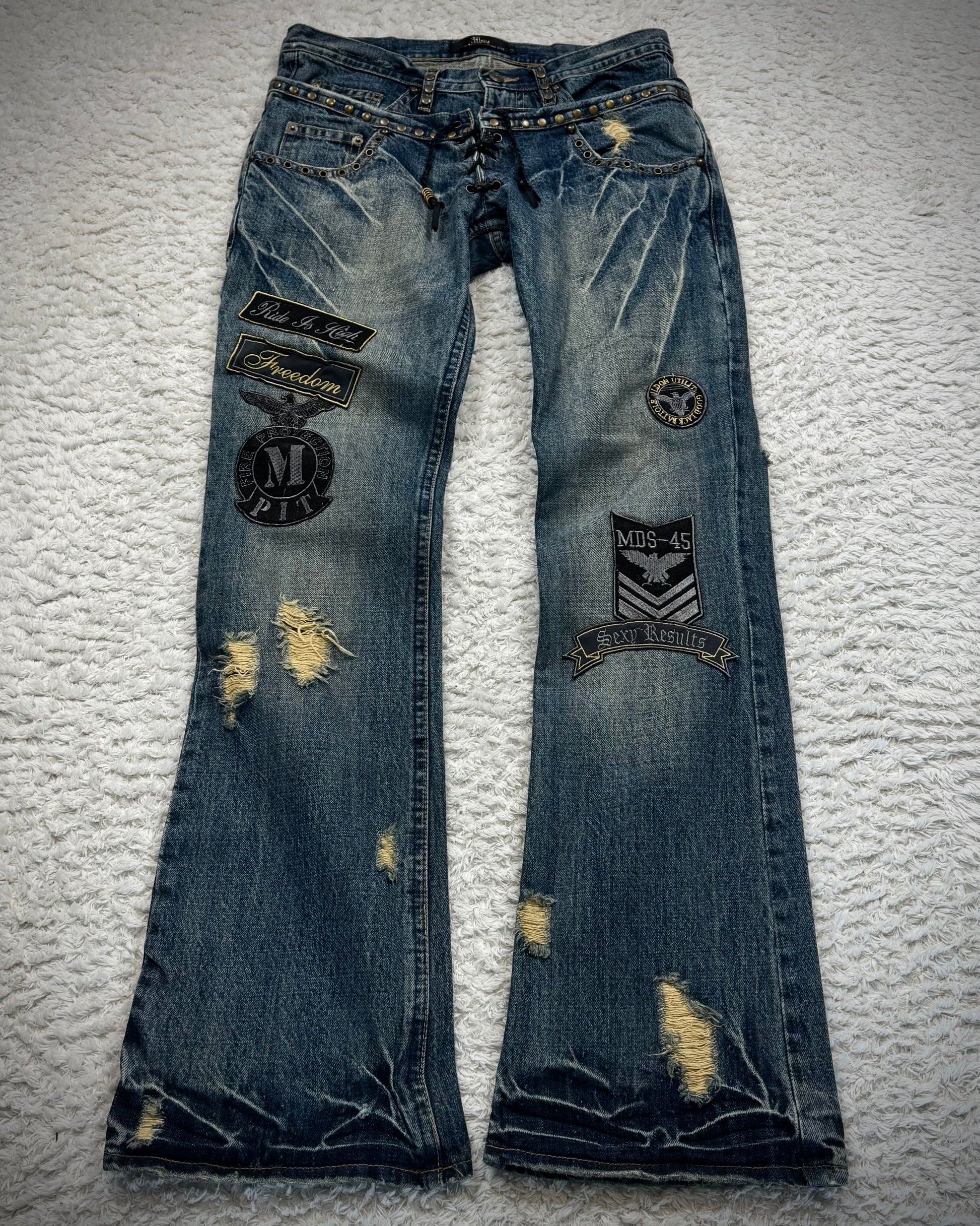 These flared jeans from Japanese brand Midas feature a double-waisted construction, with a braided leather lace-up fly at the lower waist and a zippered fly on the upper inner waistband. They include studded detailing, patchwork accents along the legs, claw mark and wrinkle wash effects, and flap back pockets.