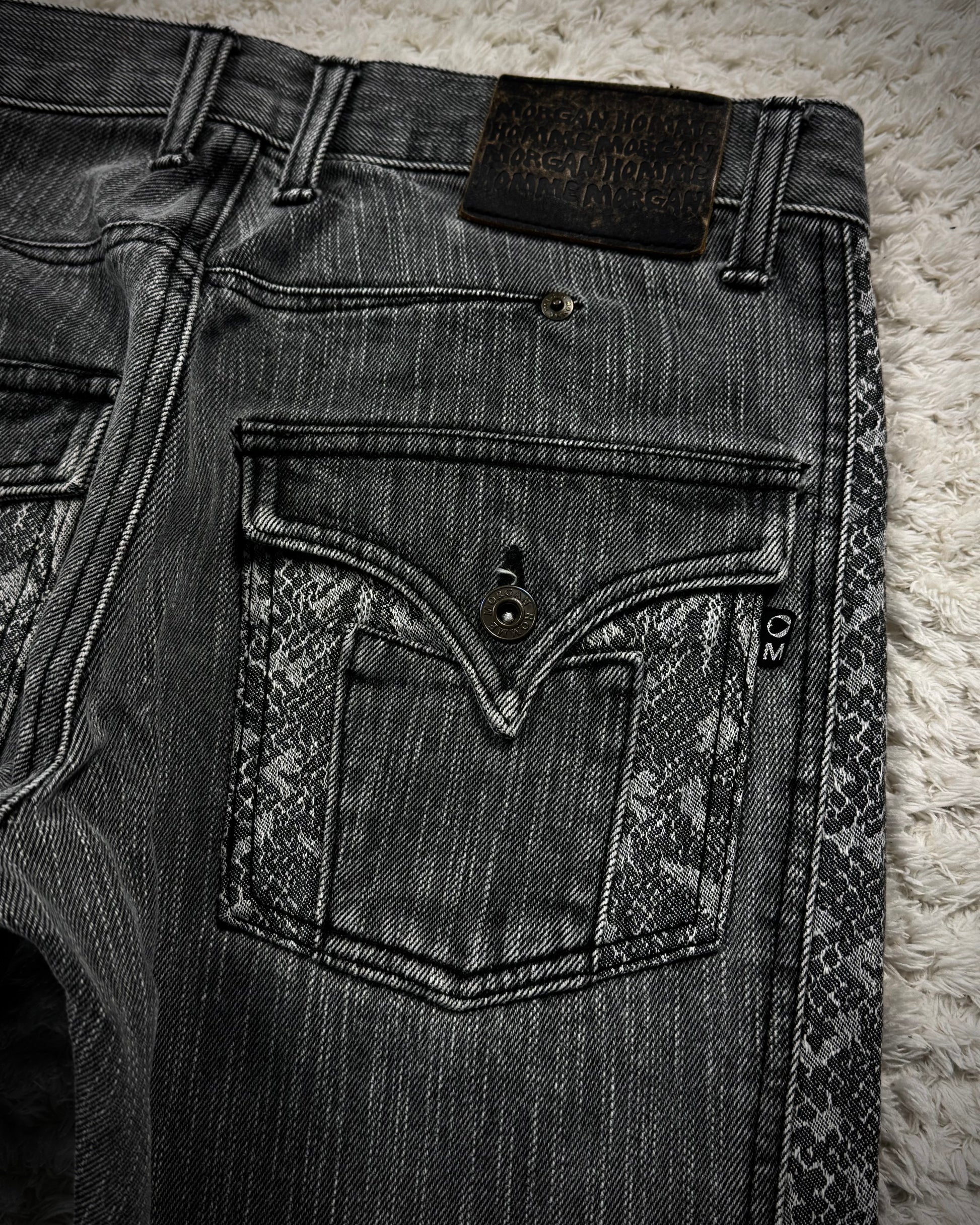 These flared jeans from Japanese brand Morgan Homme feature woven python pattern panels integrated into the construction. They include flap back pockets and maintain a clean, balanced flared silhouette.