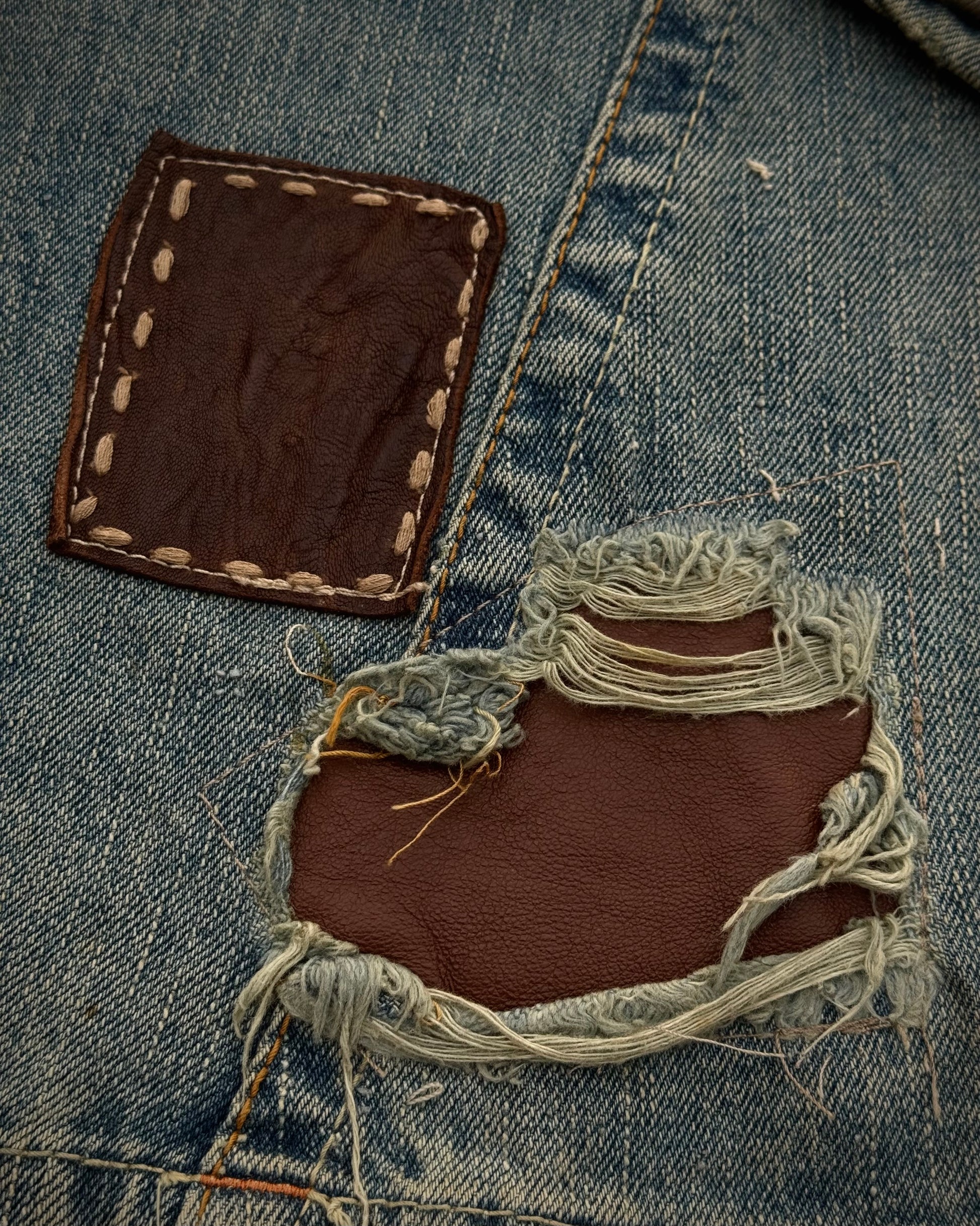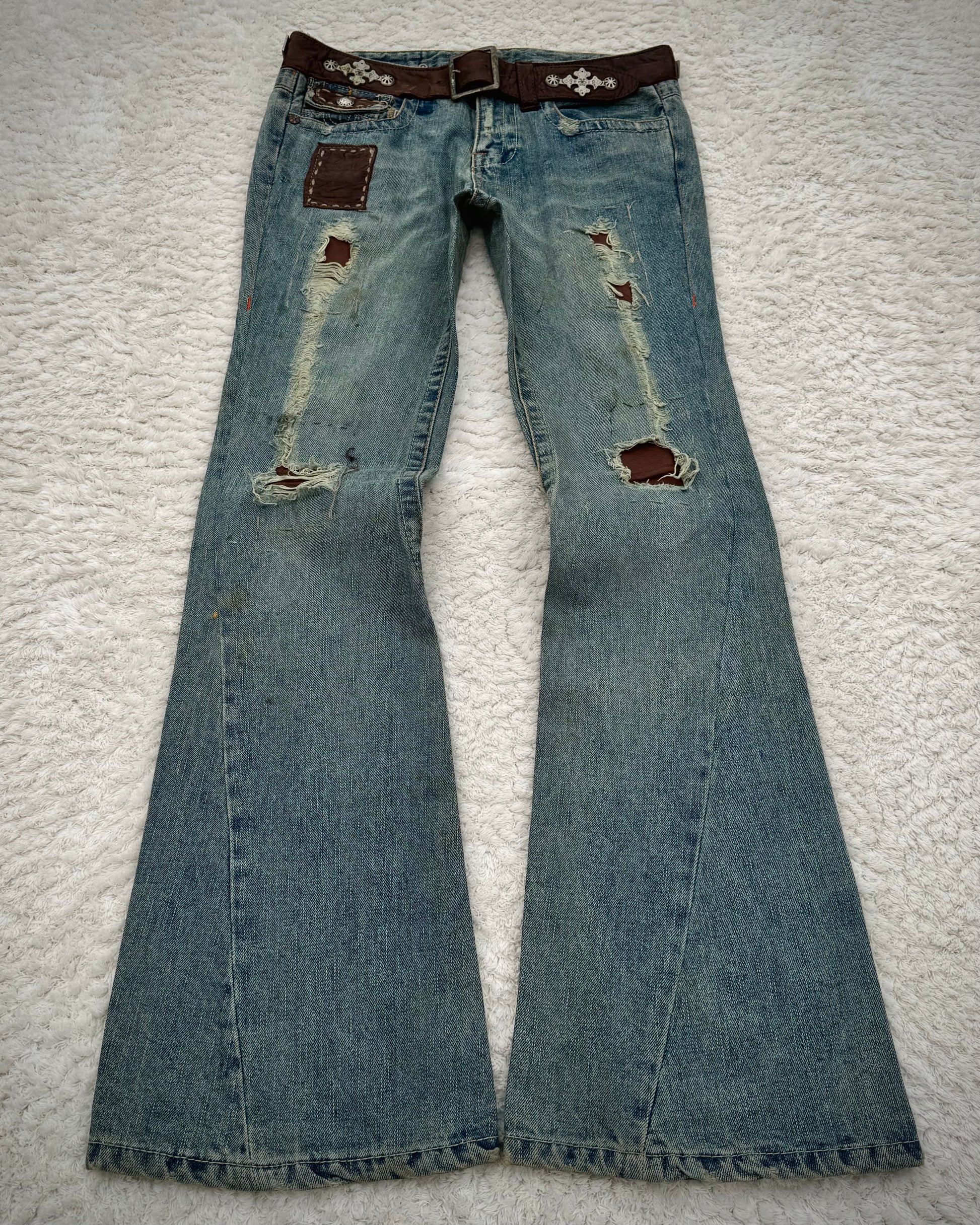 These spiral cut flared jeans from Japanese brand My Tribe feature an integrated leather belt with steel elements and metal button studs. Various leather panels are incorporated throughout the design, some functioning as decorative elements, others as visible repairs. Several of these panels are outlined with scar stitching, adding further structure and contrast to the piece.