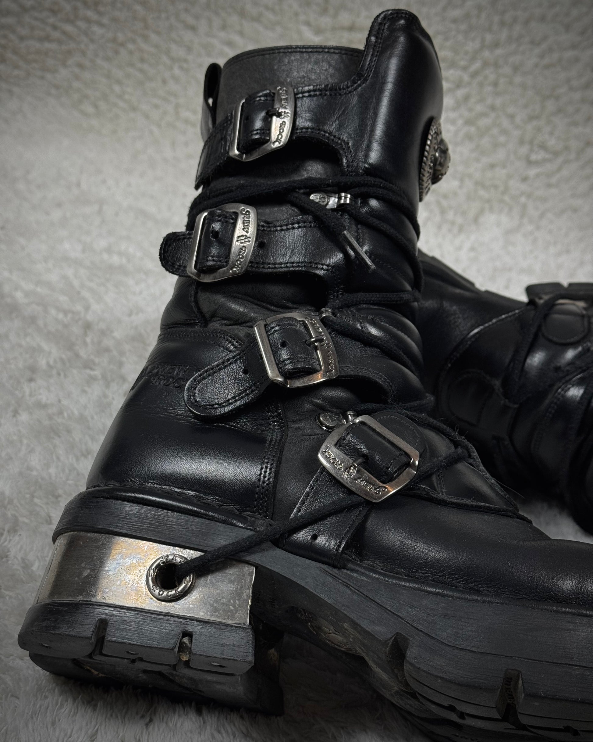 These leather boots from Spanish brand New Rock feature a chunky silhouette and a prominent steel heel threaded with laces. The design includes a substantial heel for added height and various metallic details throughout.