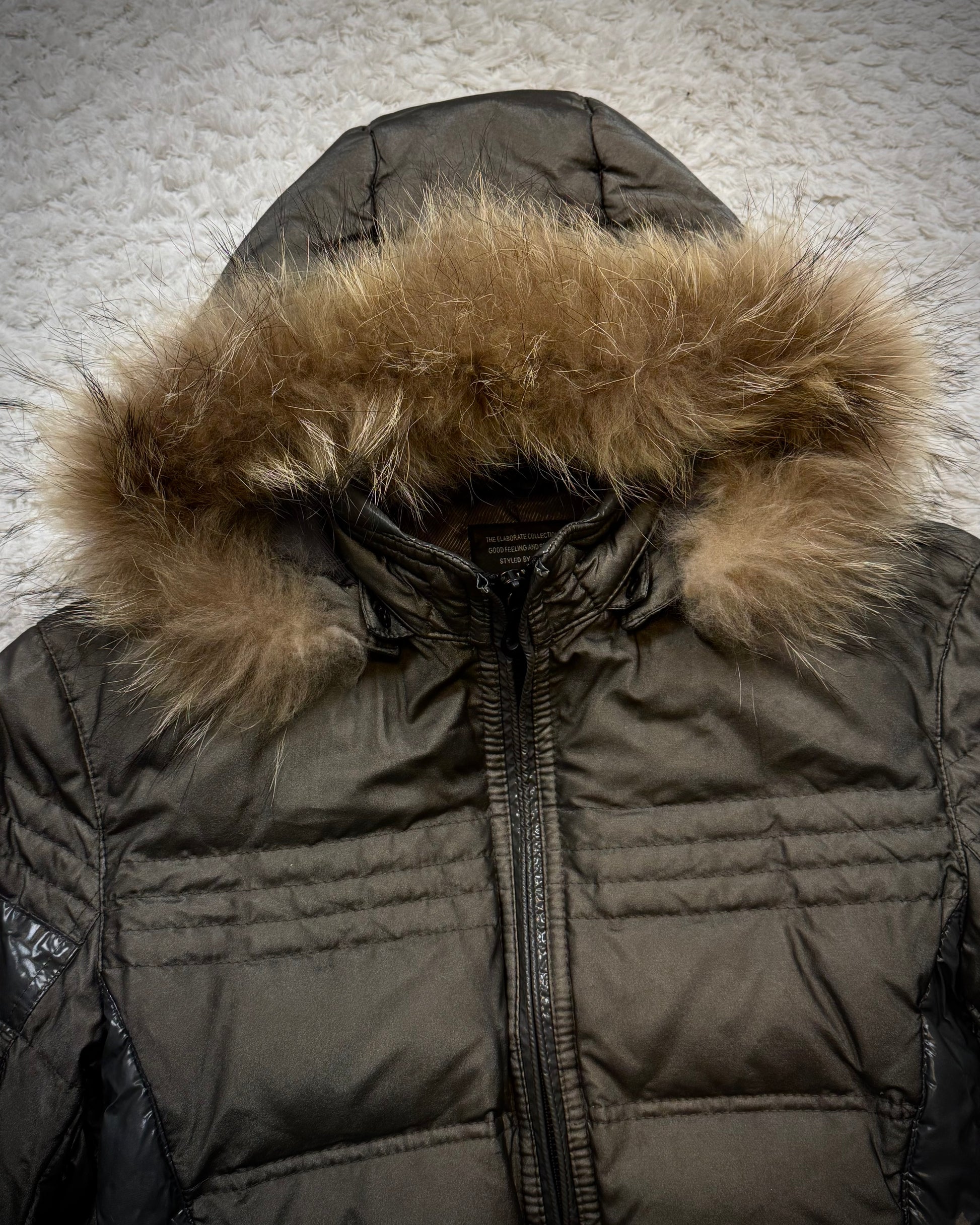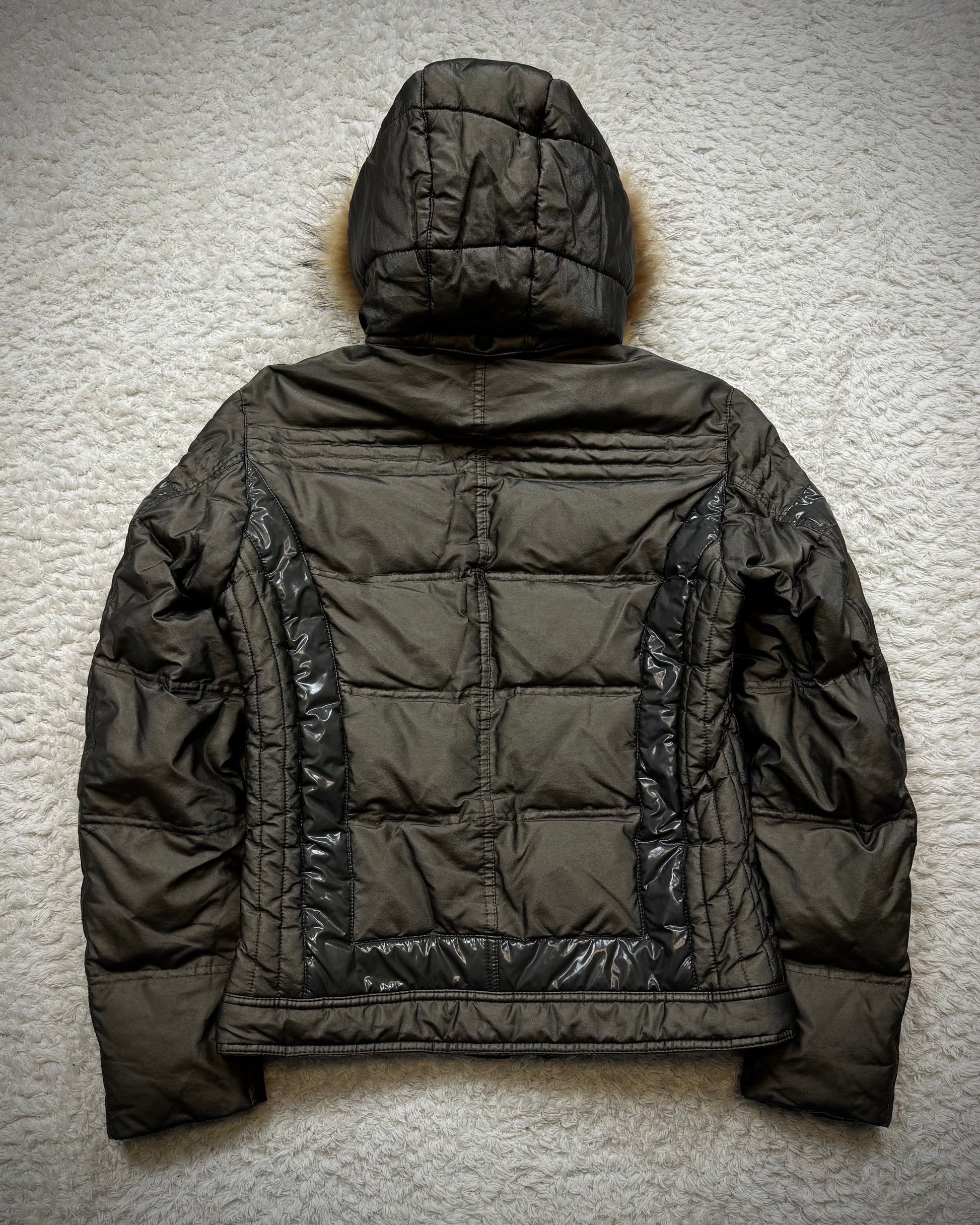 This puffer jacket from Japanese brand Nicole Club features a detachable raccoon fur hood and comes in a khaki color with glossy accents. It includes zippered cuffs that can be flared out.
