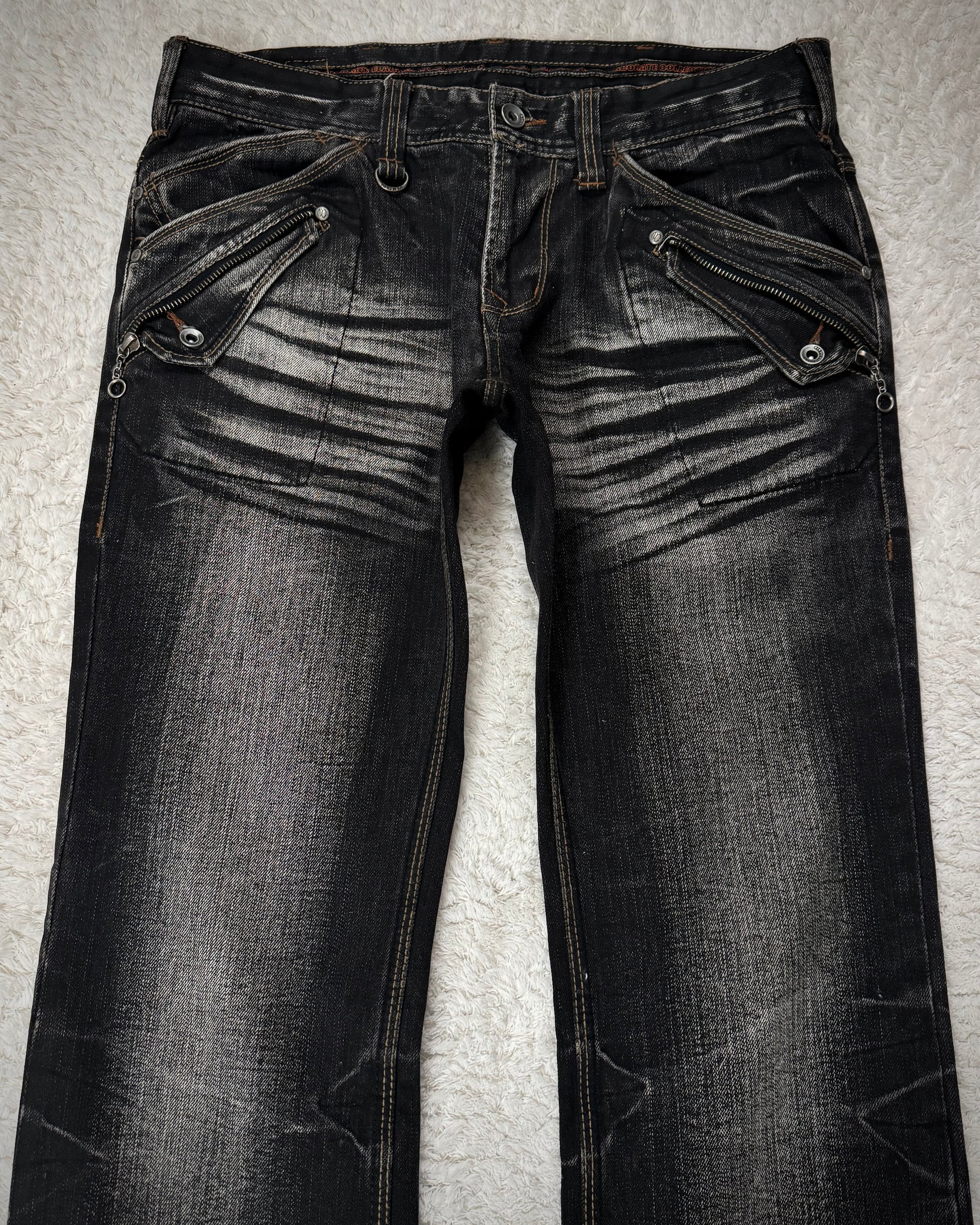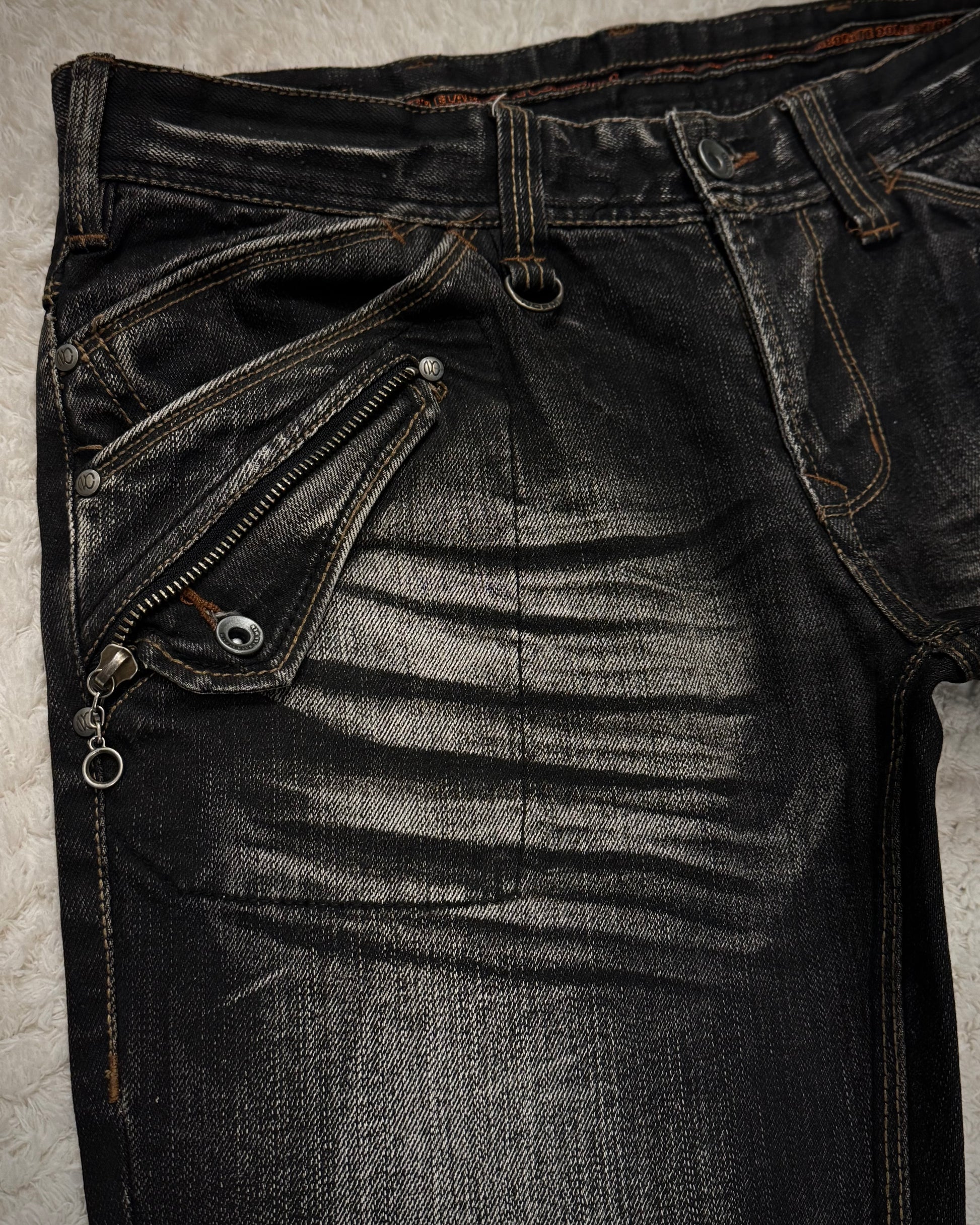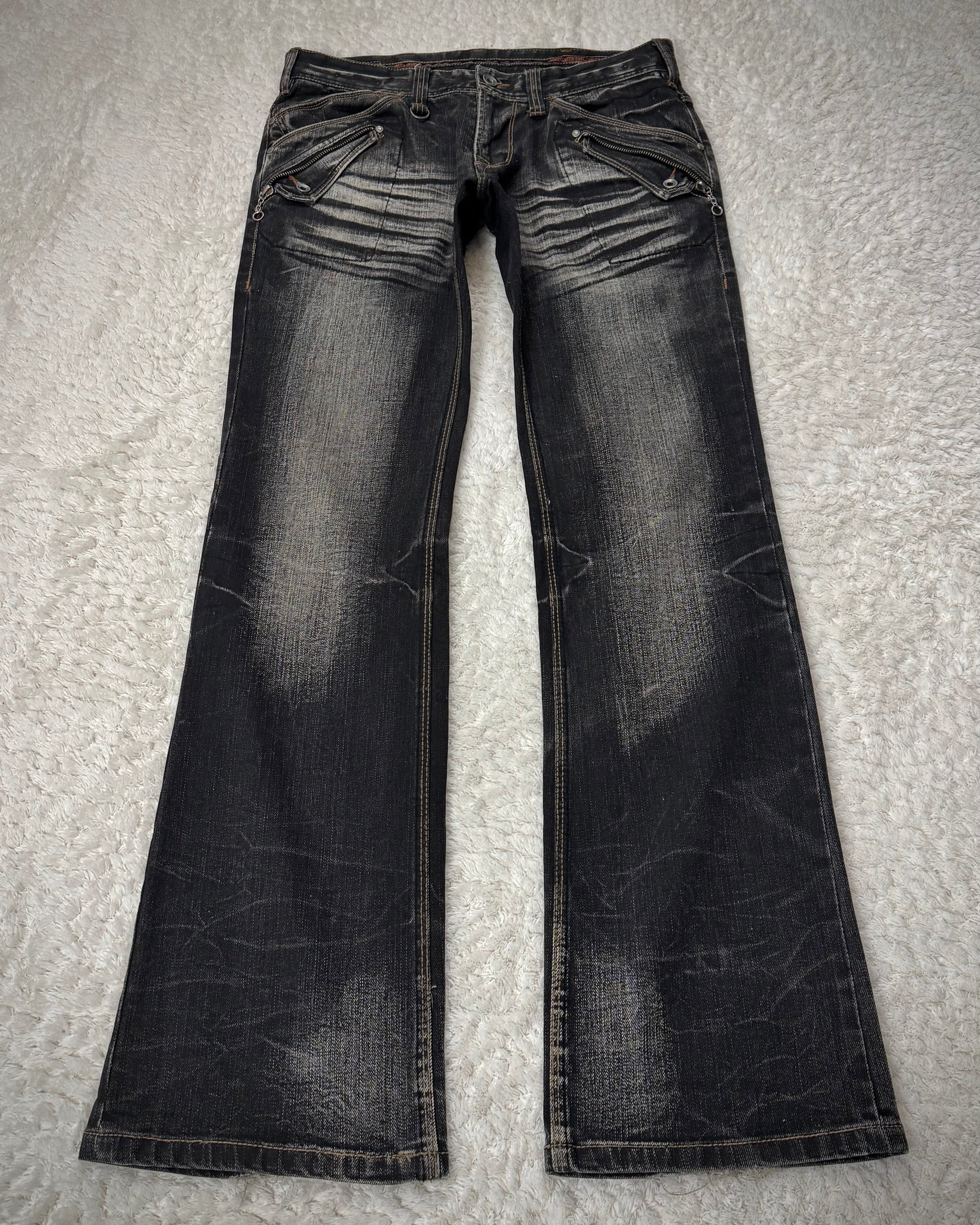 These bootcut jeans from Japanese brand Nicole Club feature a whisker wash and a unique pocket design that includes overlapping panels, flaps, and zippers. The style is structured yet versatile, making it suitable for everyday wear.