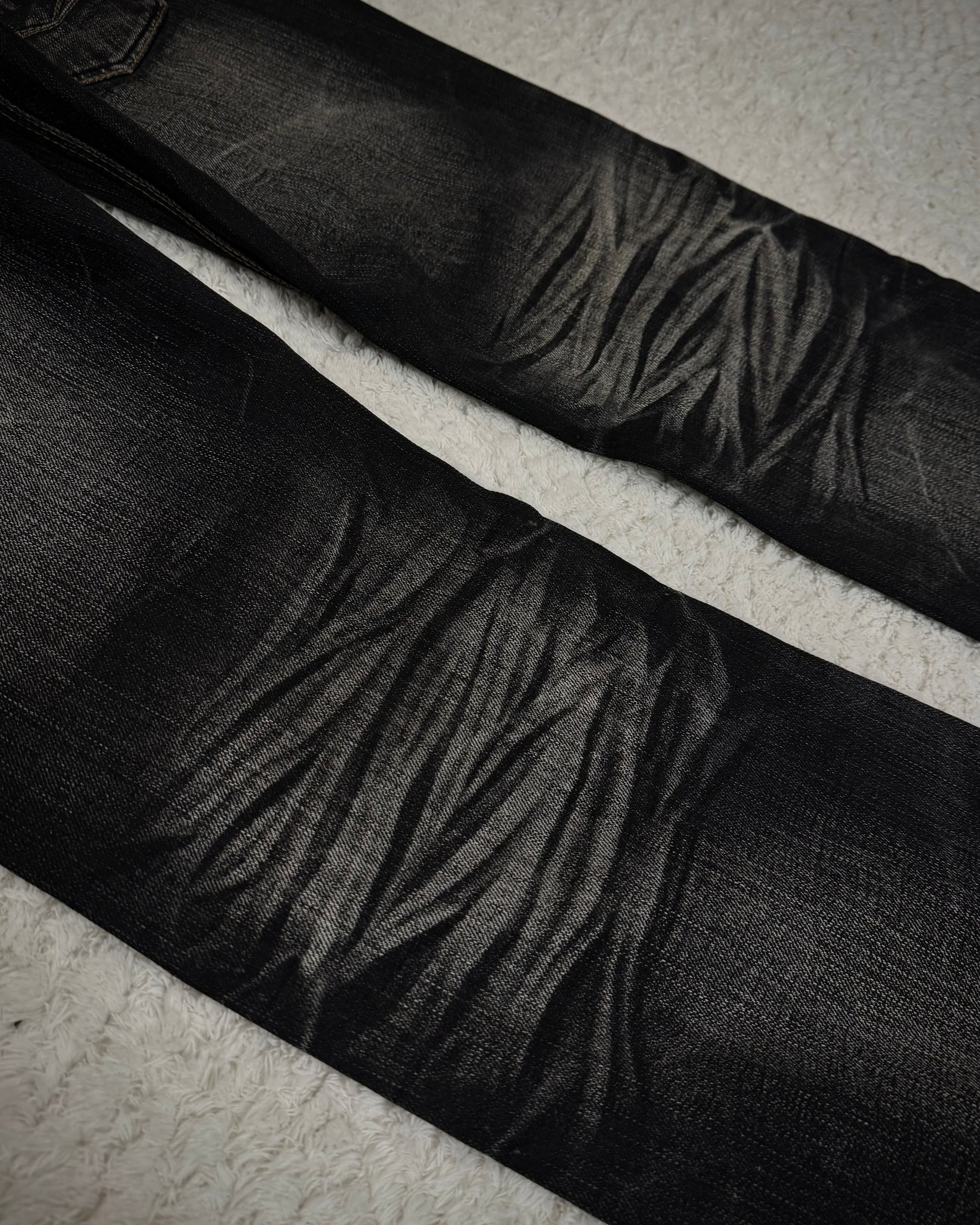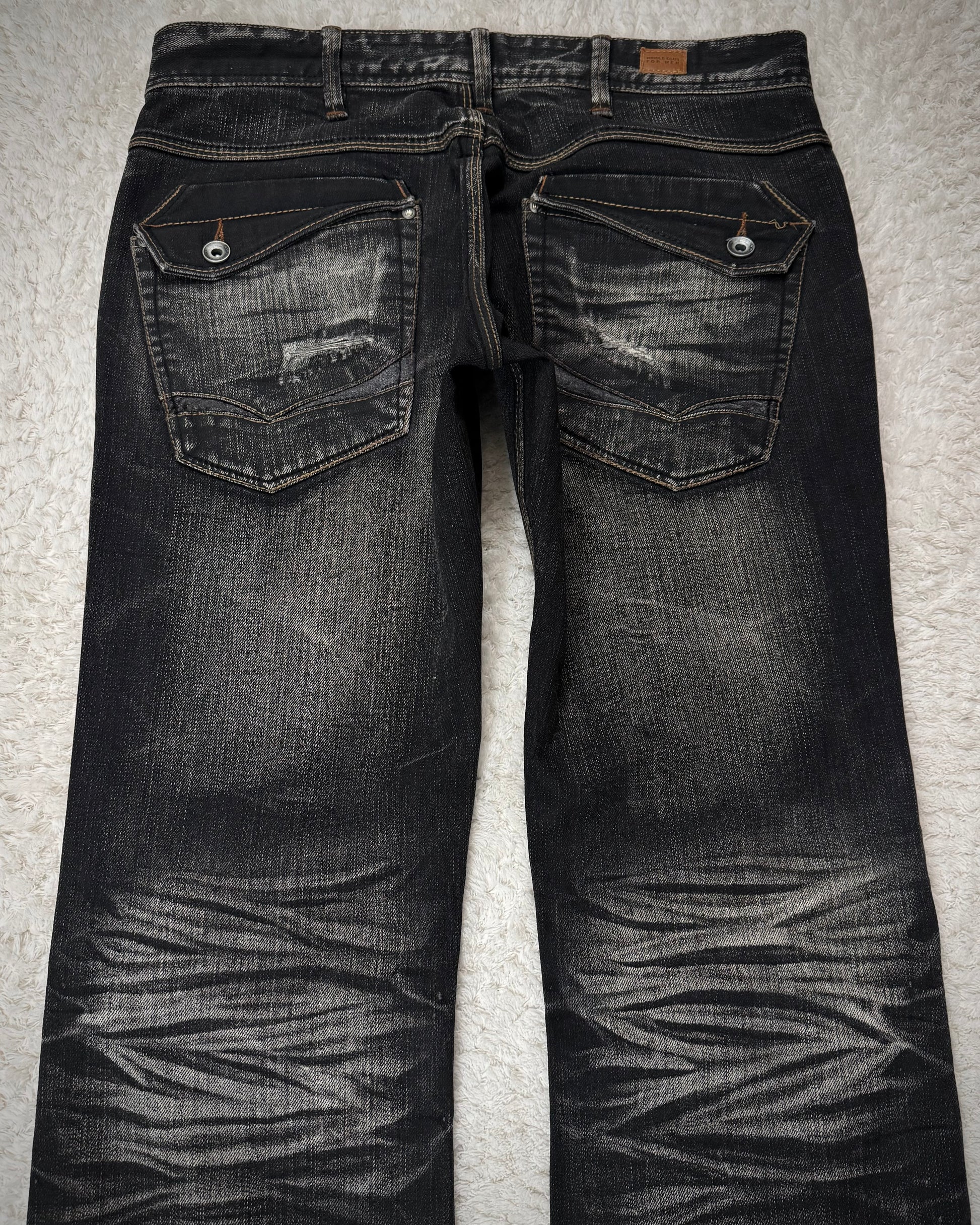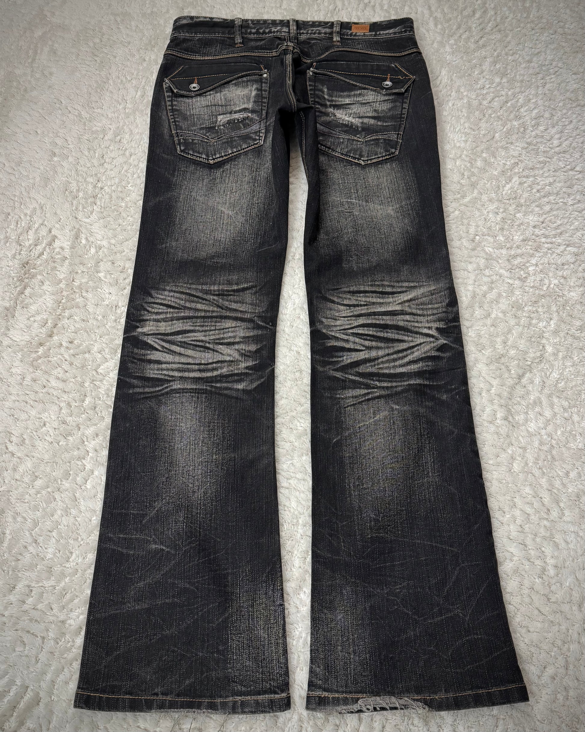 These bootcut jeans from Japanese brand Nicole Club feature a whisker wash and a unique pocket design that includes overlapping panels, flaps, and zippers. The style is structured yet versatile, making it suitable for everyday wear.
