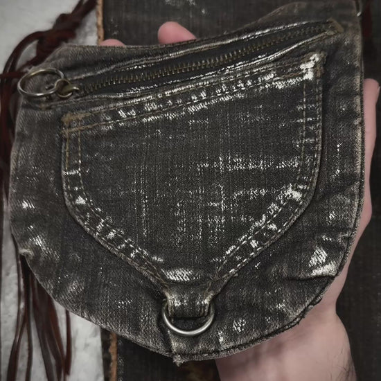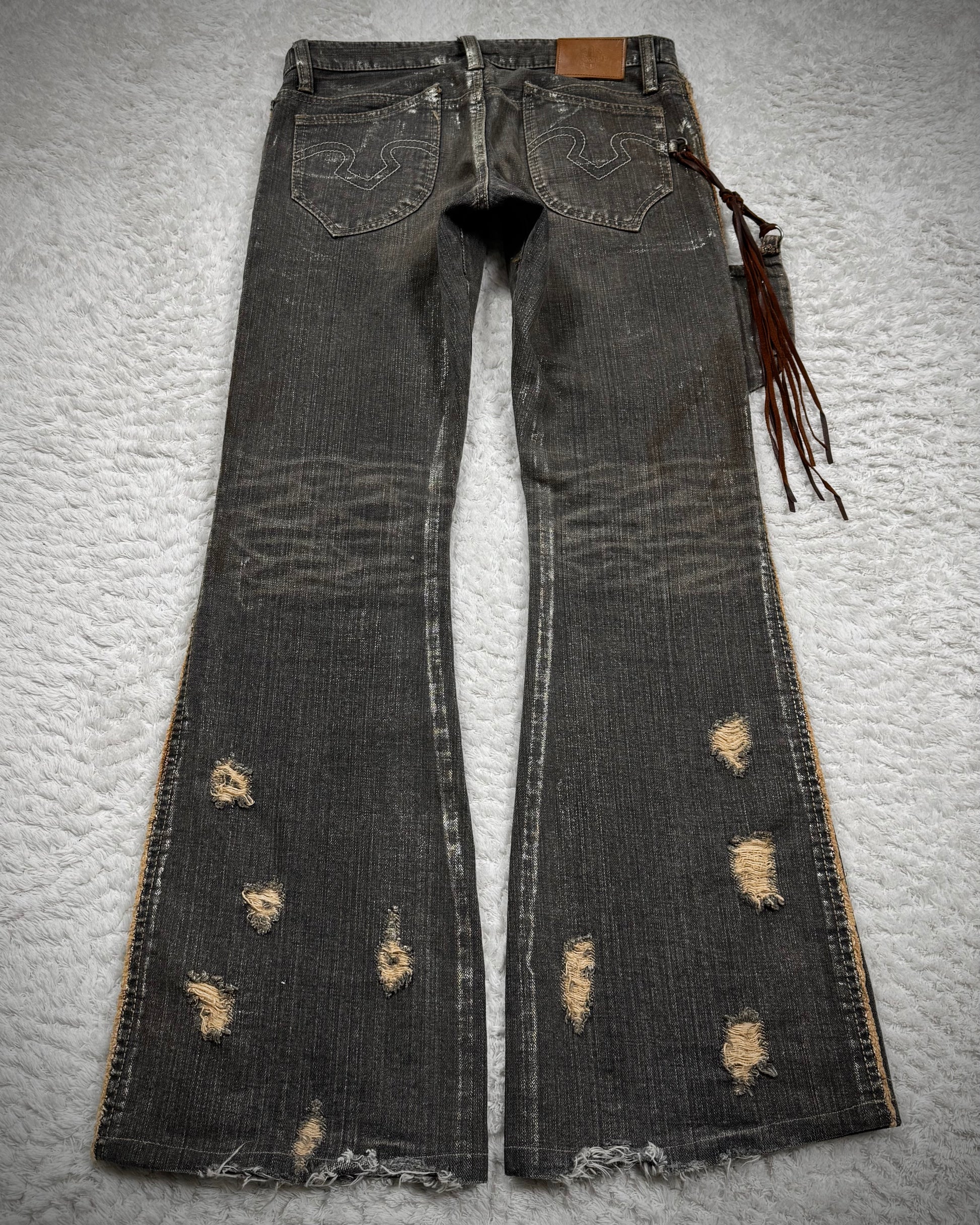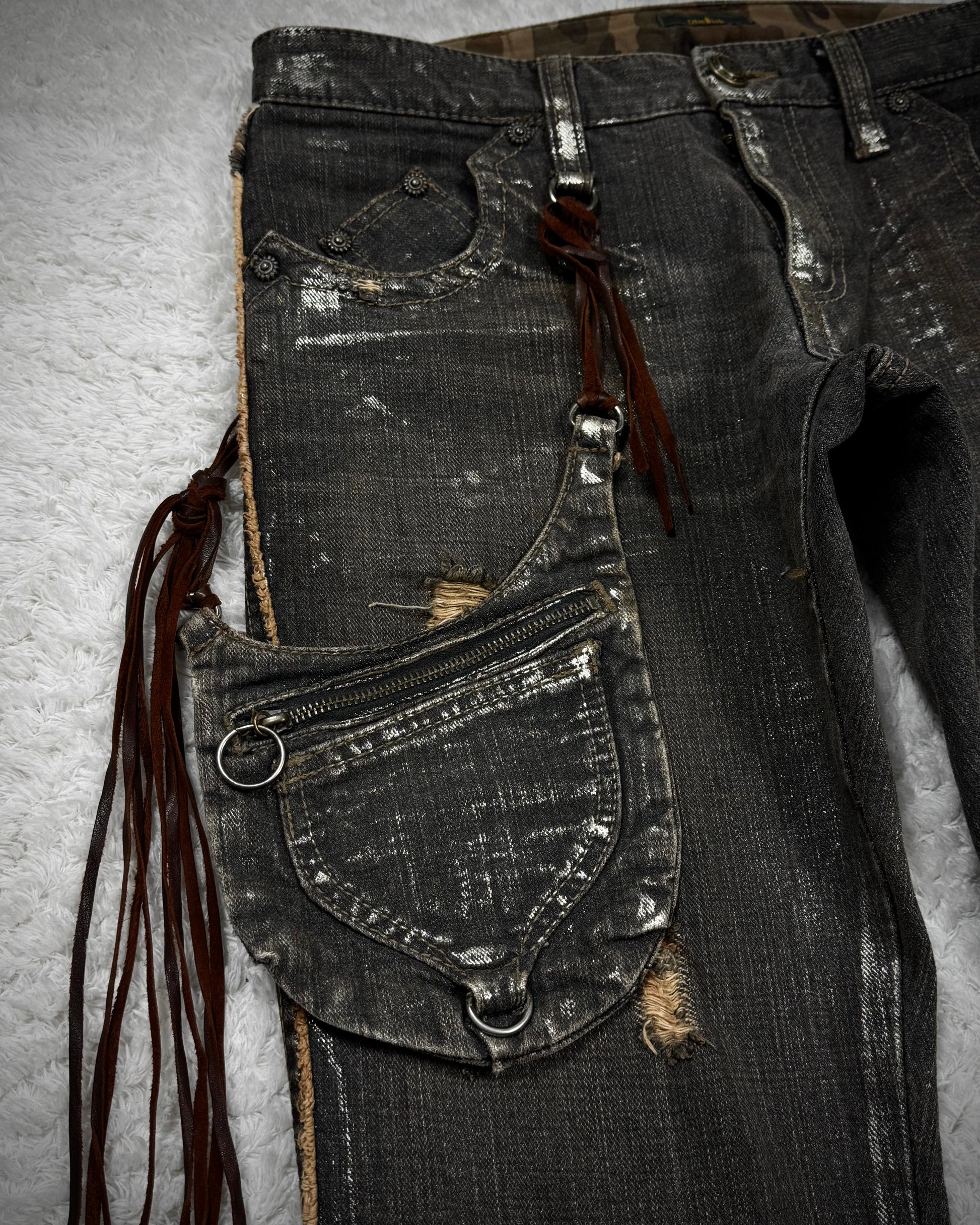 These flared jeans from Japanese brand Obelisk feature a detachable holster pouch with two compartments hanging from a brown leather rope. They include a silver waxed finish with hints of muddy tones, distressed areas, a short fringed outseam, and uniquely shaped pockets.