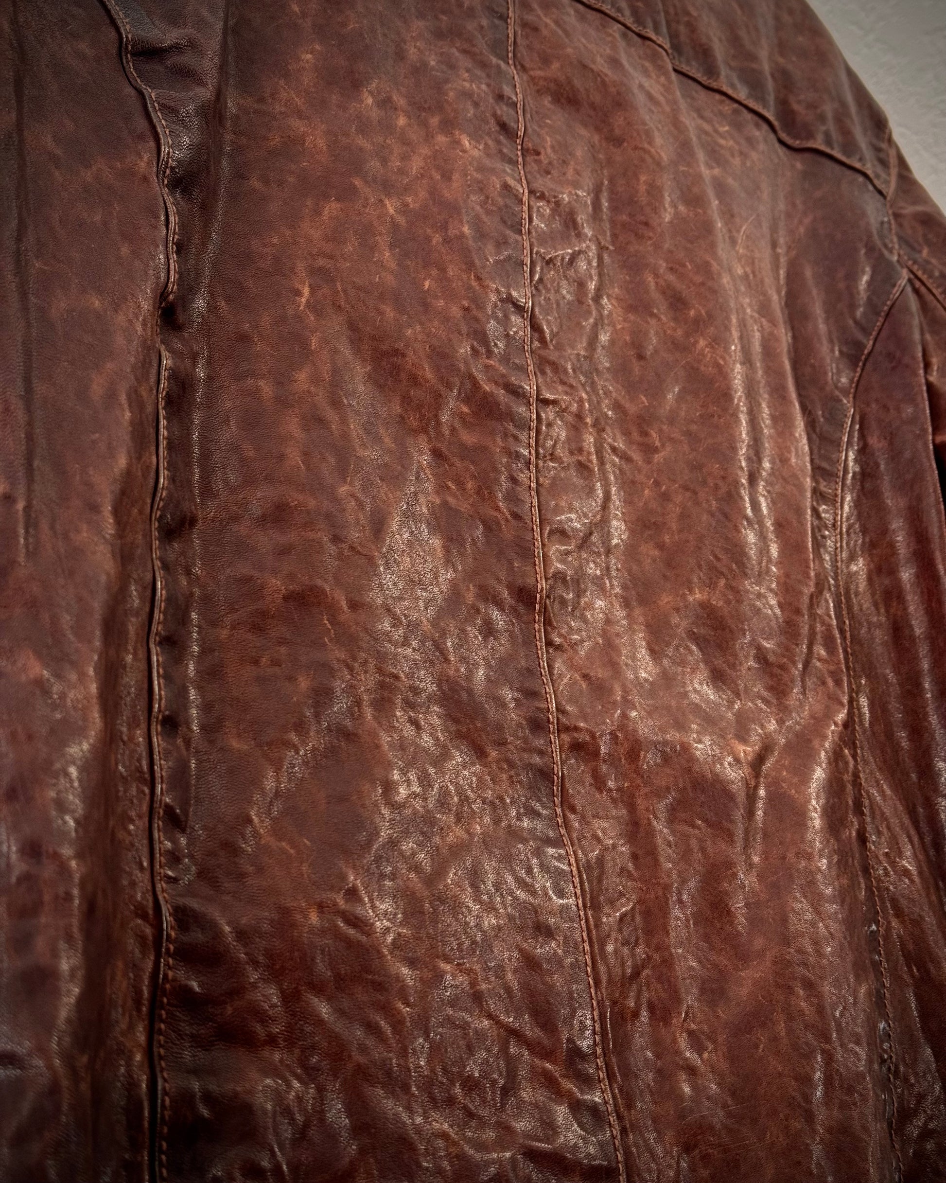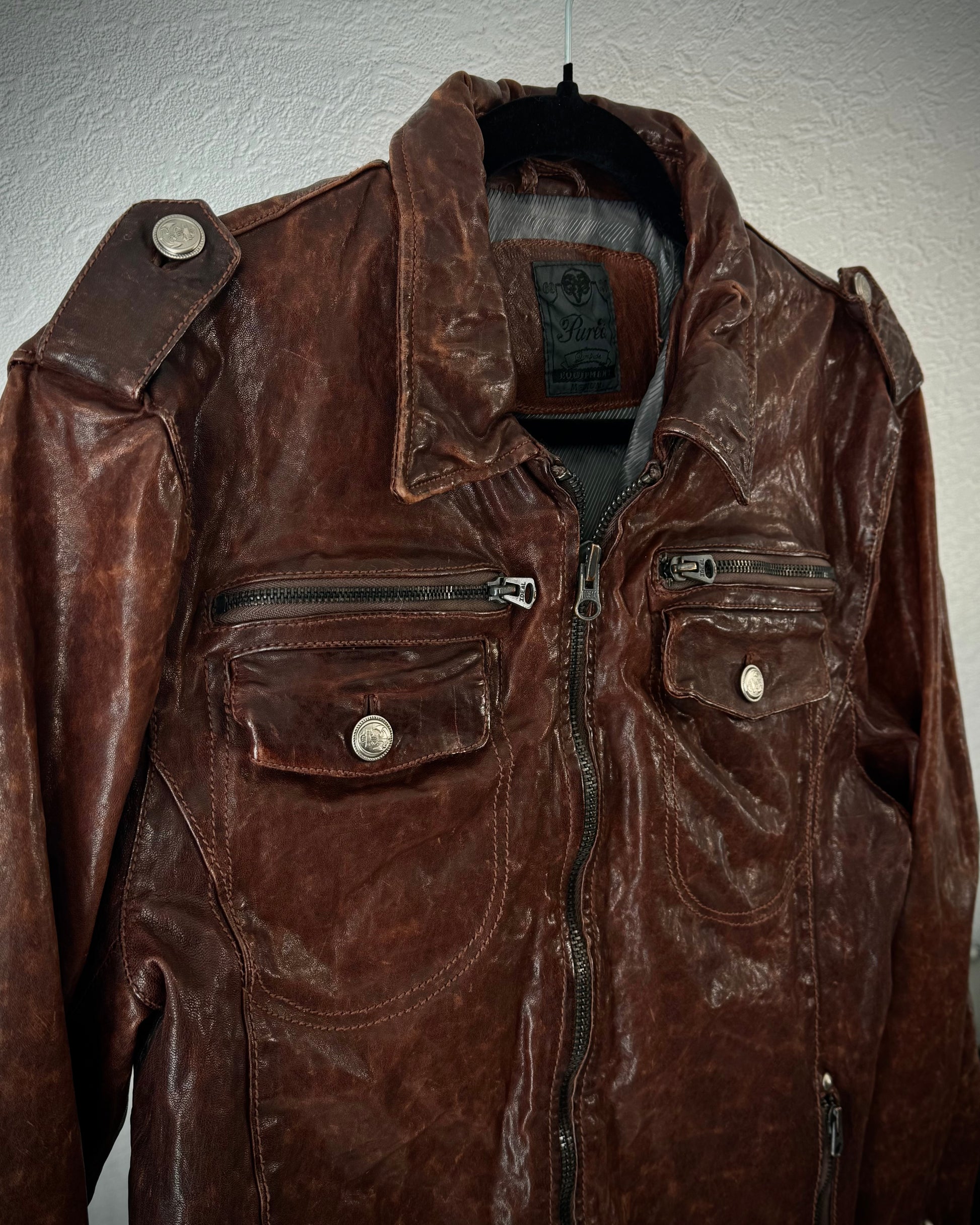 This leather jacket from Pureté features a quilted construction in a rust-toned burgundy with a heavily textured surface. It includes zippered and strapped cuffs.