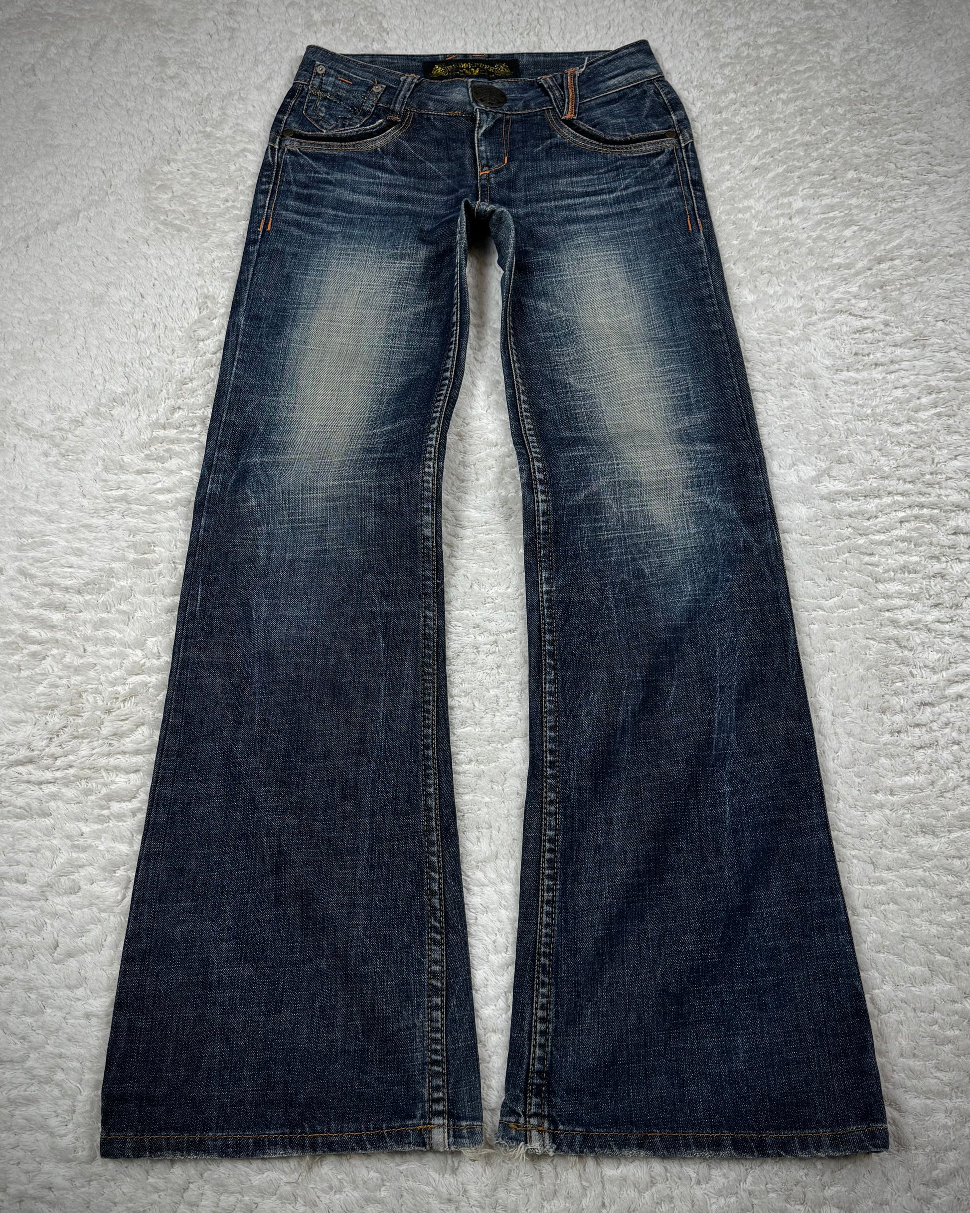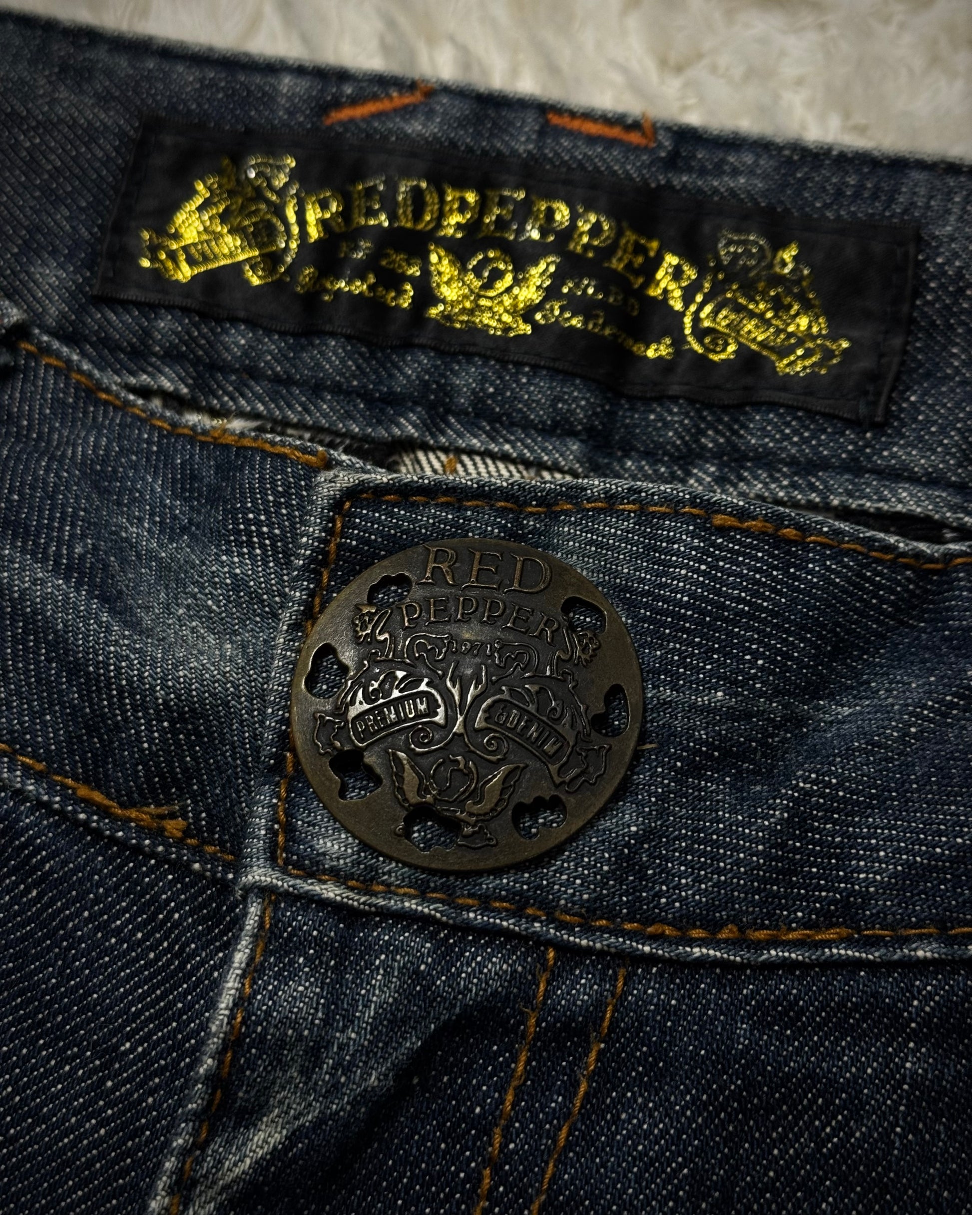 These flared jeans from Japanese brand Red Pepper feature a vintage aesthetic with decorated pockets and an embroidered back design. They include an extra large front button and showcase the brand’s signature attention to detail.