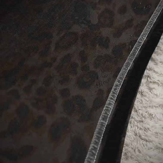 These slim cut jeans from Japanese brand Roen feature an all-over leopard pattern with subtle “Roen” text and skull prints integrated into the design. They have a luster finish that shimmers depending on the lighting, along with a D-ring attachment and a studded flap back pocket.