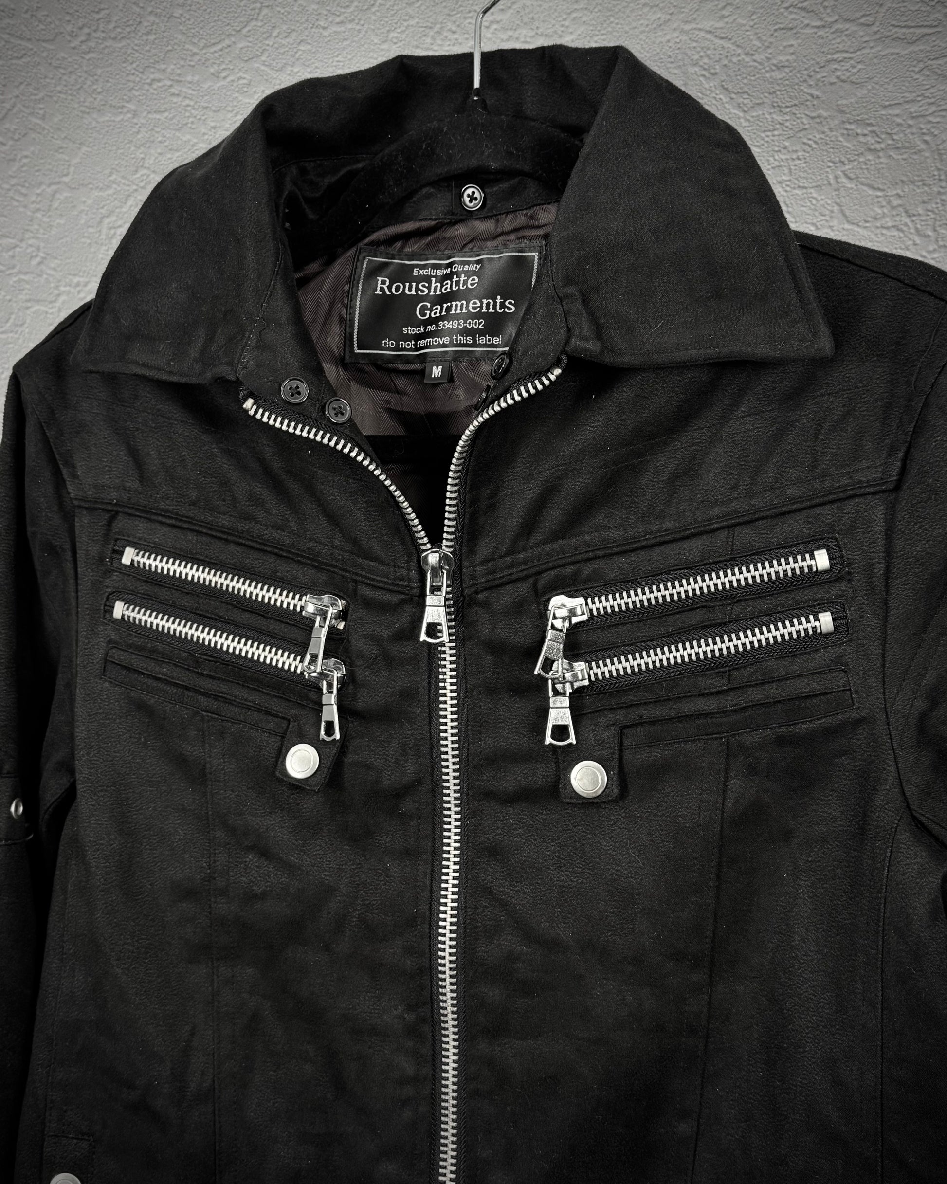This jacket from Roushatte is made from faux suede and features multiple silver zippers. It includes zippered cuffs with rib knit extensions and belted sides at the waist.