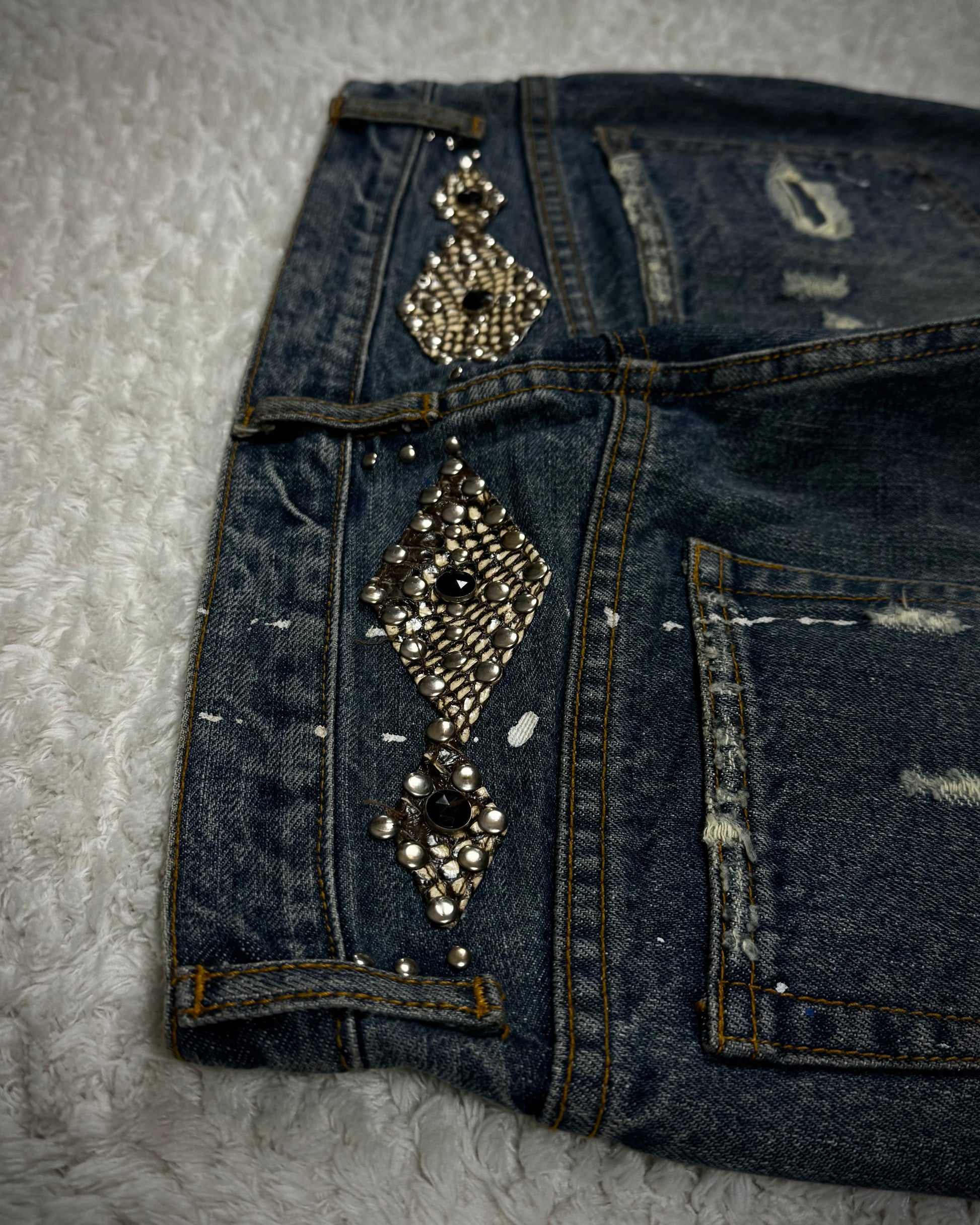 These bootcut jeans from Japanese brand Schlüssel feature python-detailed back waist panels decorated with studs and gemstones. They include repaired distressing, paint splatter detailing, and a wrinkle wash finish.