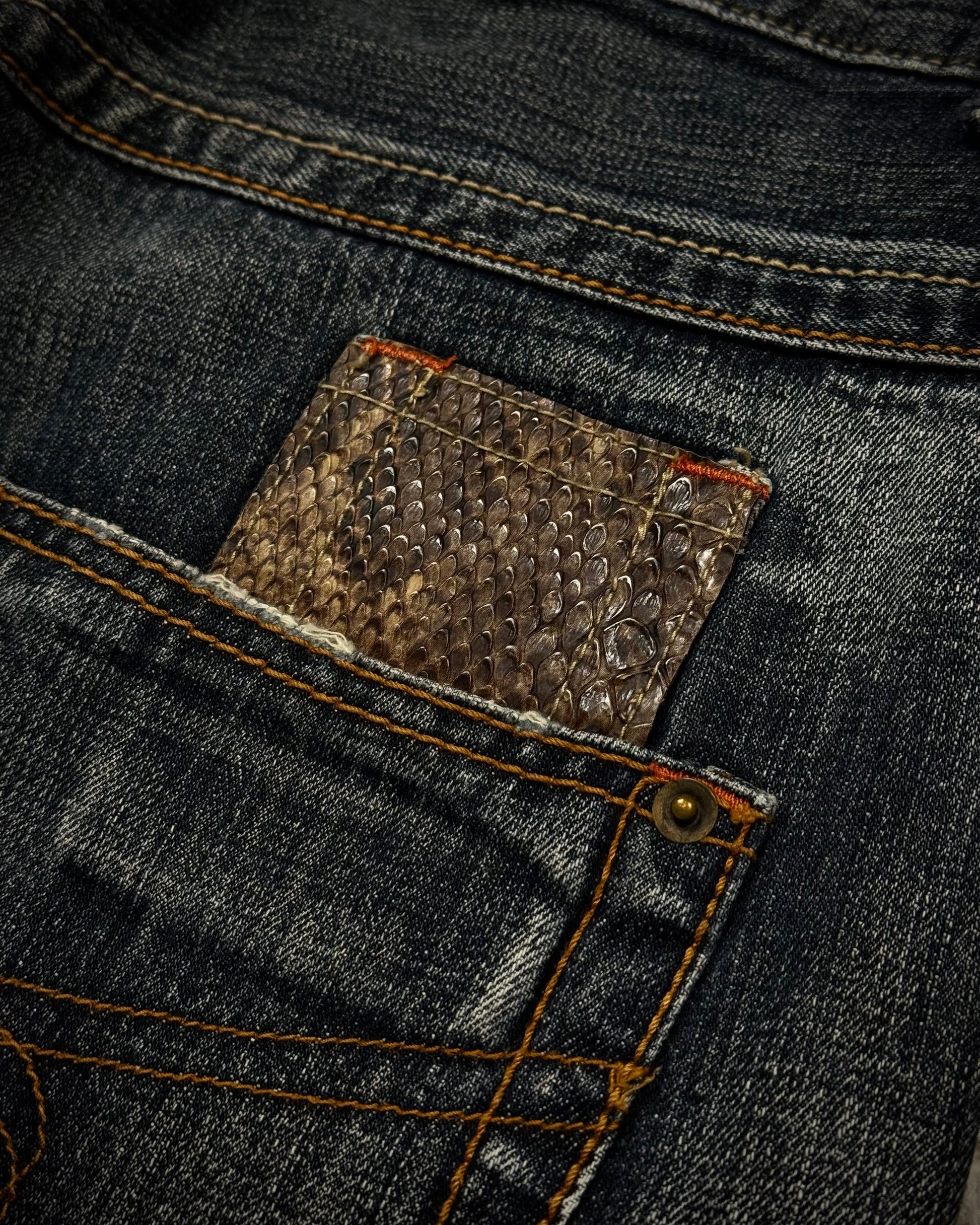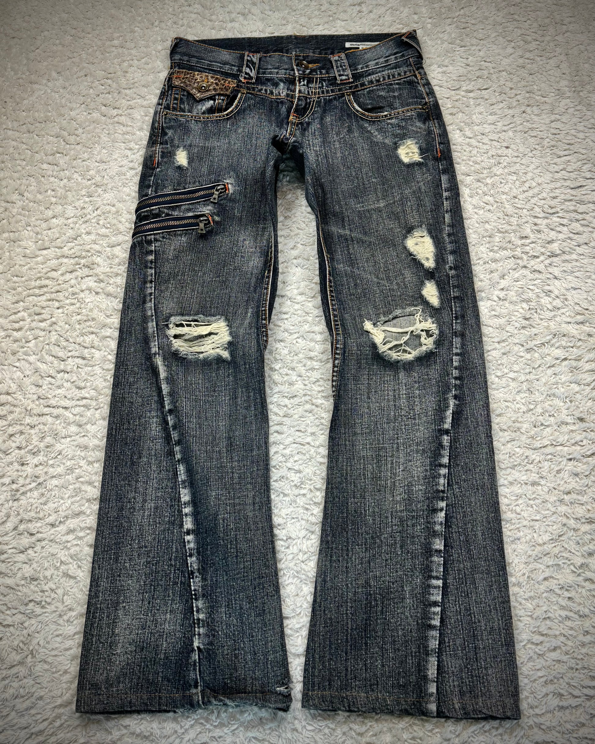 These flared jeans from Japanese brand Semantic Design feature a spiral flared cut and python-detailed pockets. They include two diagonal zippers on the thigh and show distressing throughout the denim.