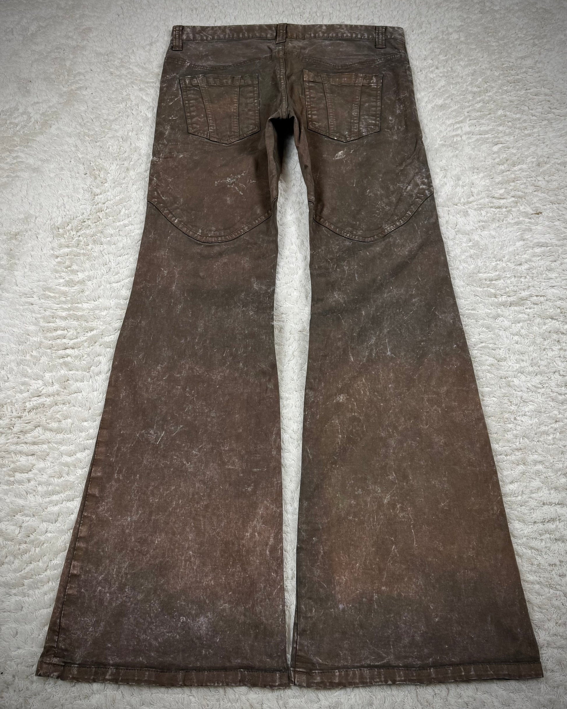 These flared jeans from Japanese brand Semantic Design are crafted from a brown textured fabric. They feature an interesting panel construction that enhances the overall structure and flow of the silhouette.
