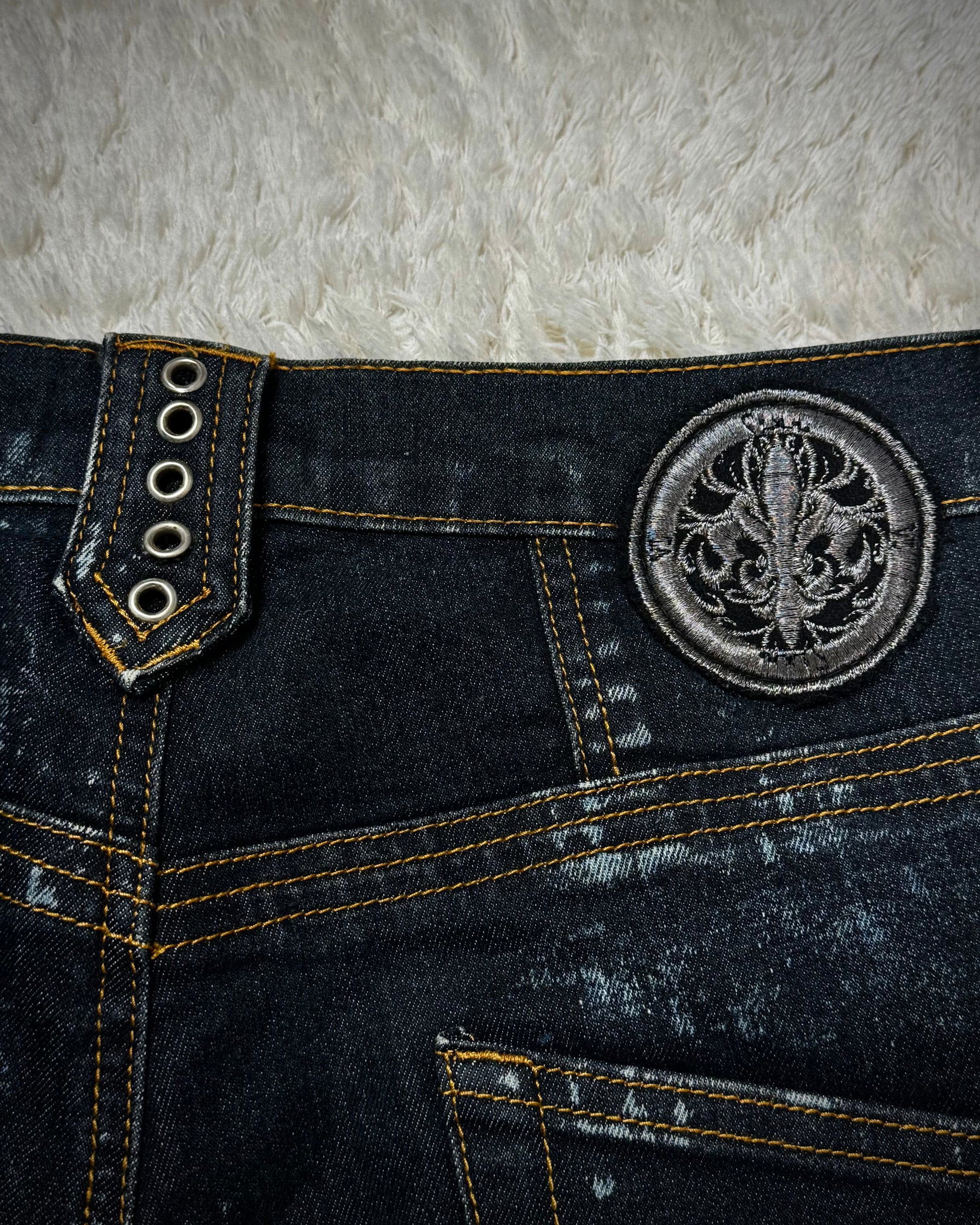 These flared jeans from Japanese brand Sixh draw inspiration from the iconic Tornado Mart Tribal Jeans, offering a unique interpretation of the concept. They feature tribal tattoo embroidery, sword-style knee paneling, and additional zippered front pockets. The jeans are finished with a distinctive whisker wash and an embroidered back tag on the waistband.