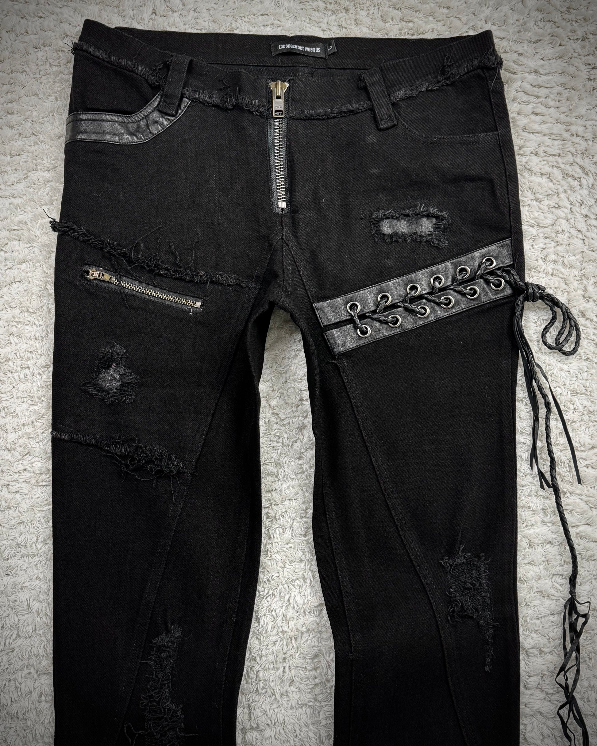 These pants from The Space Between Us feature a braided leather lace-up panel along the thigh and an exposed zipper fly. They include leather repair details and skull studs placed on the leather panel of the back pocket.