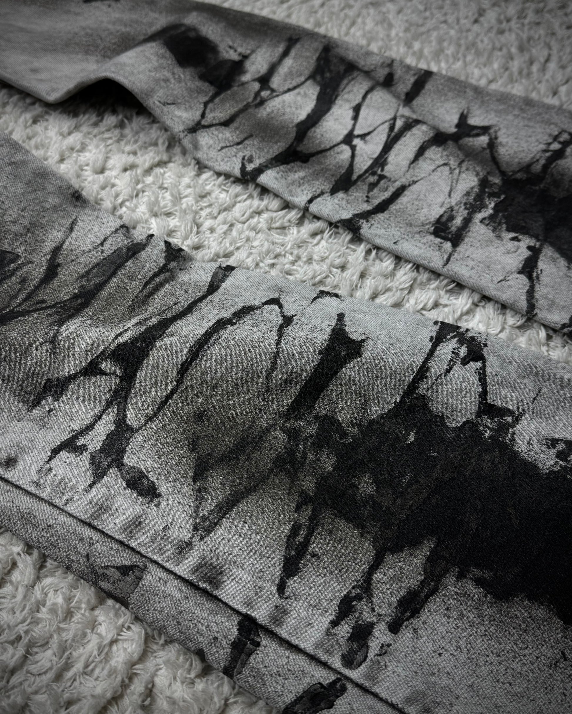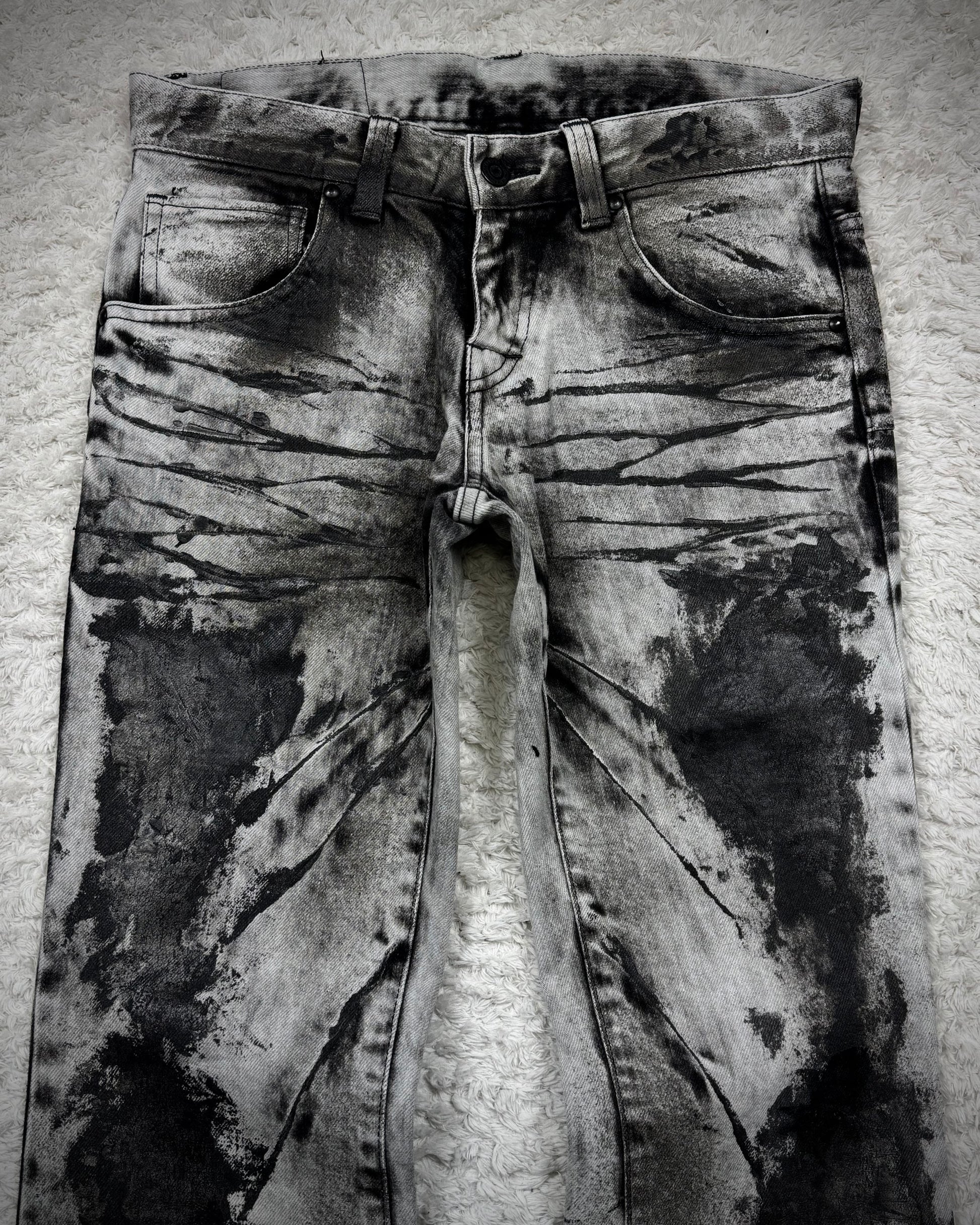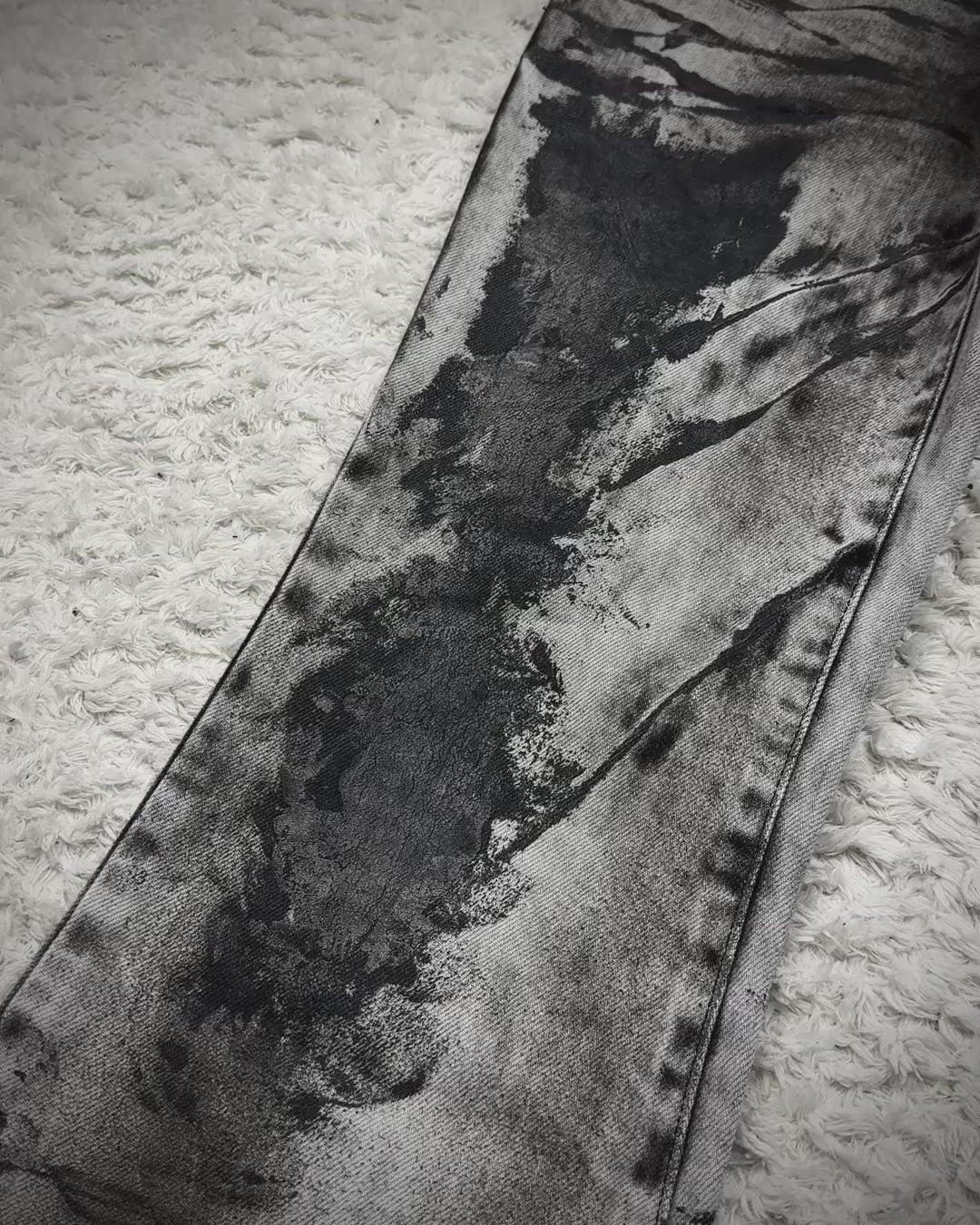 These flared jeans from Japanese brand Tornado Mart feature a clawmark coating across ash-washed fabric. The coating reflects depending on the lighting, creating contrasting tones across the denim.