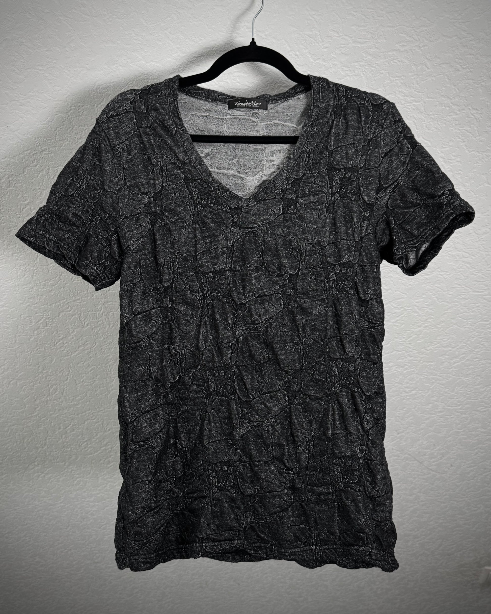 This t-shirt from Japanese brand Tornado Mart features a three-dimensional charcoal texture and is made from a stretchy fabric.