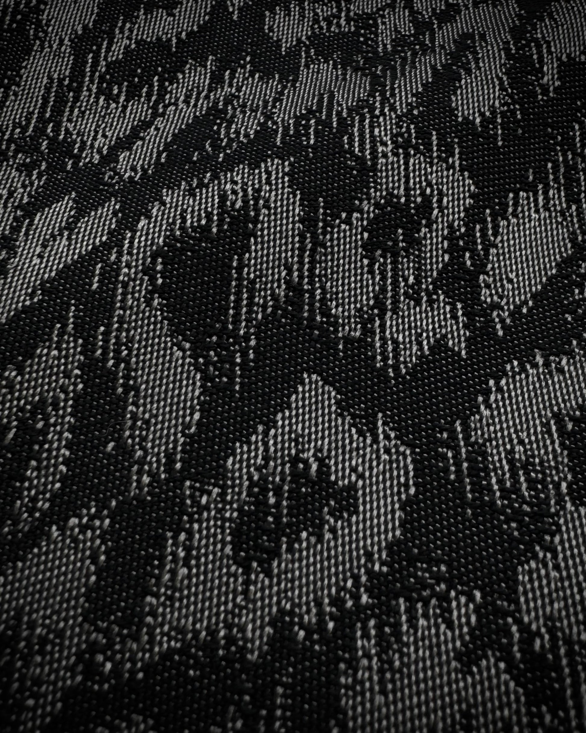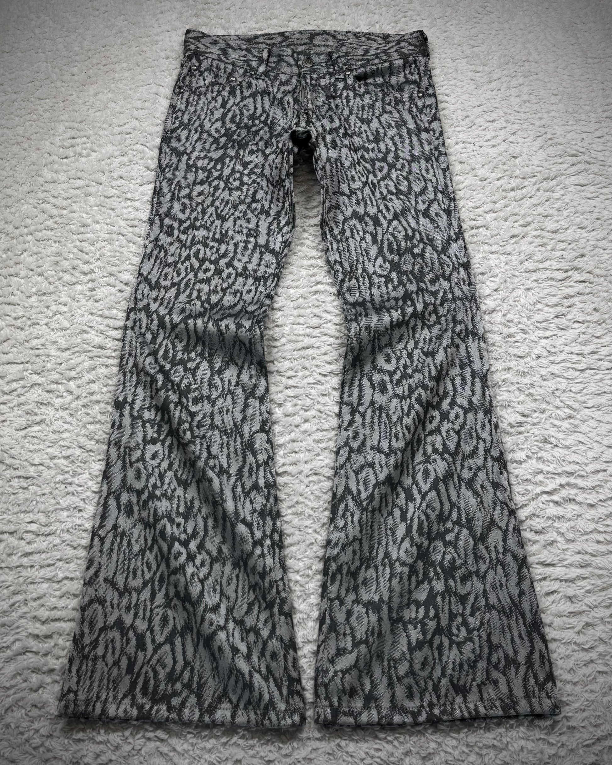These flared pants from Japanese brand Tornado Mart feature a cheetah pattern woven directly into the fabric using a jacquard technique. The construction maintains a clean silhouette with an elegant overall appearance.